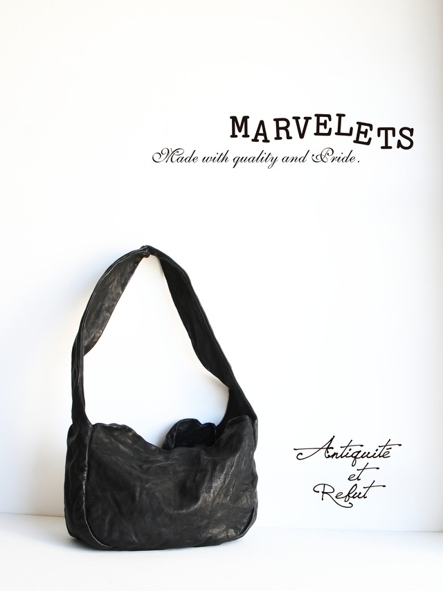 マーヴェレッツの牛ヌメ革は丈夫で使い込むほどに手にしっくりと馴染み、艶が出てきます。 変化していく過程を楽しみながらお使い頂けるバッグです。 素材: 牛ヌメ革(植物タンニンなめし).真鍮(ダールメッキ) 裏地: コットン50%.リネン50% カラー: CHARCOAL BLACK 生産国: 日本 サイズ: 口元約39cm×高さ(一番低い部分)約28.5cm×正丸底直径約19cm ショルダー長さ: 96cm 重量: 約610g □MARVELETSの革について タンニン鞣しの革とは一般的にヌメ革と言われている物で、植物(主に木の渋など)タンニンや合成タンニンを使って鞣した革です。 その中でも植物を使って鞣した革が『植物タンニン鞣し』『ベジタブルタンニン鞣し』等と呼ばれています。 植物タンニン鞣しの革は手間と時間をかけてなめした魅力があります。植物を使って鞣すので環境にも人にもやさしいのはもちろん、使い込むほどに柔らかくなり、艶が出て表情が変化していくため、経年変化を楽しめる革です。 MARVELETSの製品は、タンニン鞣しの中でも、植物(ベジタブル)タンニン鞣しの革を使い、製品染めや製品洗いを施す事でアンティークの様な風合いを出しています。 更に使い込んでいく事で、植物タンニン鞣しの革でしか味わえない、ご自分だけのエイジングをお楽しみ下さい。 :鞣し(なめし)=動物の原皮を植物や鉱物を使って腐敗しない様に加工すること □お取り扱いについて MARVELETSでは、革の自然な風合いを生かすため、表面に塗装等を施していません。 植物タンニン鞣しの革を顔料を使わずに染料とオイルのみで仕上げる事で、より革本来の表情を楽しむことが出来ます。ですがその為、雨や汗等の水分や摩擦により、色落ち、移染する事がありますので、お取り扱いには下記の点にご注意をお願い致します。 〇薄い色のお洋服とのコーディネートはお避け下さい。(ショルダー部分等がお洋服に擦れたりすると移染する事があります) 〇防水スプレー、保護クリーム、革用オイル等のご使用は変色やカビの原因になりますのでお勧めしません。どうしてもご使用になられる場合は商品の目立たない場所で試してから、自己責任にてお使い下さい。 〇水に濡れると水ジミとなる事がありますので、雨や汗等に充分お気を付けください。 〇万が一、濡れてしまった場合は、乾いた布でお拭き取りになり風通しの良い場所で陰干してからご使用、保管して下さい。また、植物タンニン鞣しの革は、太陽の光や照明等に当たると焼けて色が変化していきます。それがこの革の良い点ではありますが、1部分だけが変色したりする事を避けるためにも、保管の際はご配慮下さい。