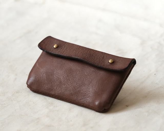 植物タンニンで丁寧に鞣した牛革を使用し、オーバーダイを施したCO-CA。 カードやコインを入れるためのシンプルでコンパクトなケースです。 内部には仕切りがあり二つに分かれています。 マーヴェレッツの牛ヌメ革は丈夫で使い込むほどに手にしっくりと馴染み、艶が出てきます。 素材:牛ヌメ革(植物タンニンなめし).真鍮 カラー:DARK MOCA 生産国:日本 重量:約g 本体サイズ:幅約cm×高さ約cm □MARVELETSの革について タンニン鞣しの革とは一般的にヌメ革と言われている物で、植物(主に木の渋など)タンニンや合成タンニンを使って鞣した革です。 その中でも植物を使って鞣した革が『植物タンニン鞣し』『ベジタブルタンニン鞣し』等と呼ばれています。 植物タンニン鞣しの革は手間と時間をかけてなめした魅力があります。植物を使って鞣すので環境にも人にもやさしいのはもちろん、使い込むほどに柔らかくなり、艶が出て表情が変化していくため、経年変化を楽しめる革です。 MARVELETSの製品は、タンニン鞣しの中でも、植物(ベジタブル)タンニン鞣しの革を使い、製品染めや製品洗いを施す事でアンティークの様な風合いを出しています。 更に使い込んでいく事で、植物タンニン鞣しの革でしか味わえない、ご自分だけのエイジングをお楽しみ下さい。 :鞣し(なめし)=動物の原皮を植物や鉱物を使って腐敗しない様に加工すること □お取り扱いについて MARVELETSでは、革の自然な風合いを生かすため、表面に塗装等を施していません。 植物タンニン鞣しの革を顔料を使わずに染料とオイルのみで仕上げる事で、より革本来の表情を楽しむことが出来ます。ですがその為、雨や汗等の水分や摩擦により、色落ち、移染する事がありますので、お取り扱いには下記の点にご注意をお願い致します。 〇薄い色のお洋服とのコーディネートはお避け下さい。(ショルダー部分等がお洋服に擦れたりすると移染する事があります) 〇防水スプレー、保護クリーム、革用オイル等のご使用は変色やカビの原因になりますのでお勧めしません。どうしてもご使用になられる場合は商品の目立たない場所で試してから、自己責任にてお使い下さい。 〇水に濡れると水ジミとなる事がありますので、雨や汗等に充分お気を付けください。 〇万が一、濡れてしまった場合は、乾いた布でお拭き取りになり風通しの良い場所で陰干してからご使用、保管して下さい。また、植物タンニン鞣しの革は、太陽の光や照明等に当たると焼けて色が変化していきます。それがこの革の良い点ではありますが、1部分だけが変色したりする事を避けるためにも、保管の際はご配慮下さい。