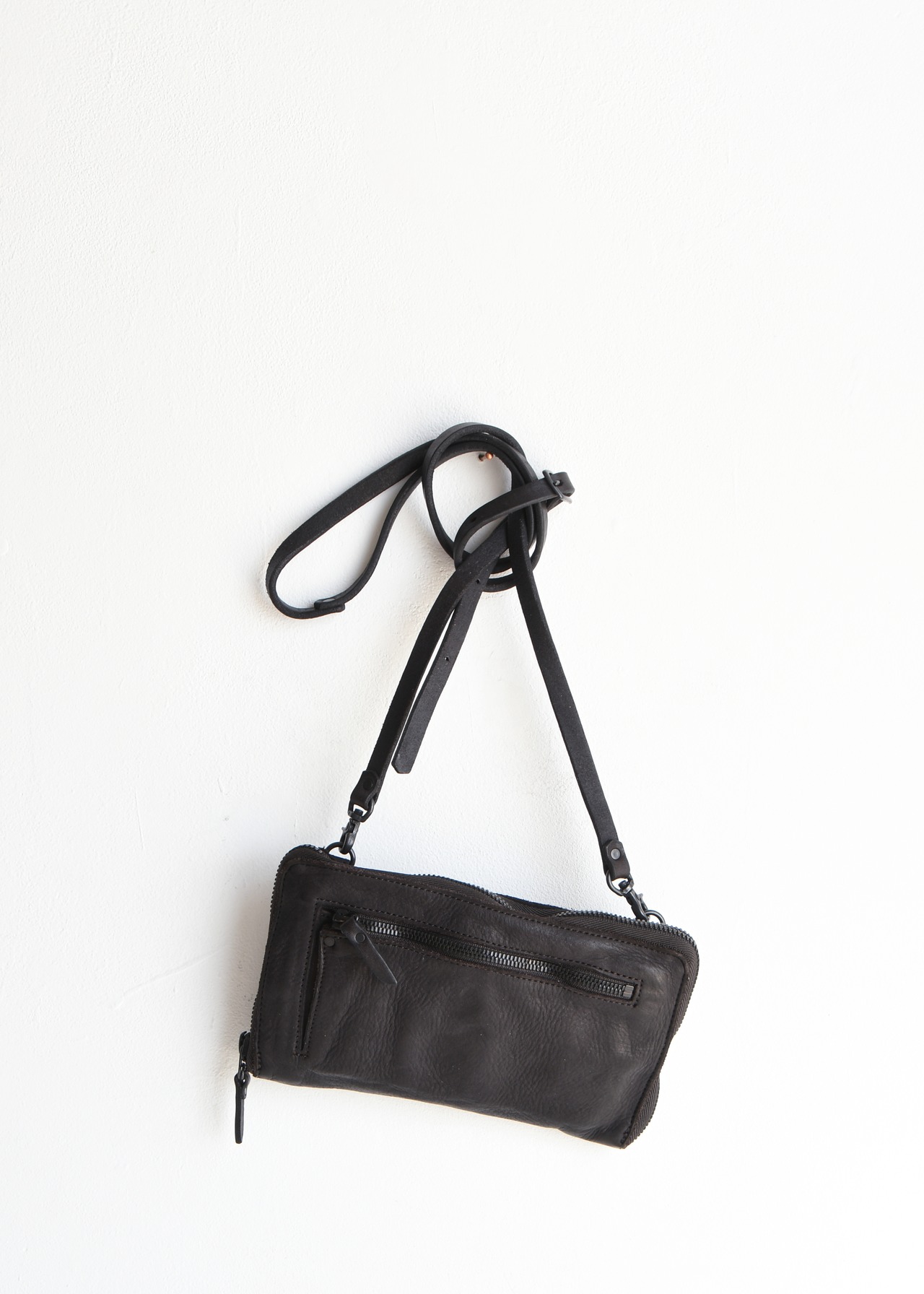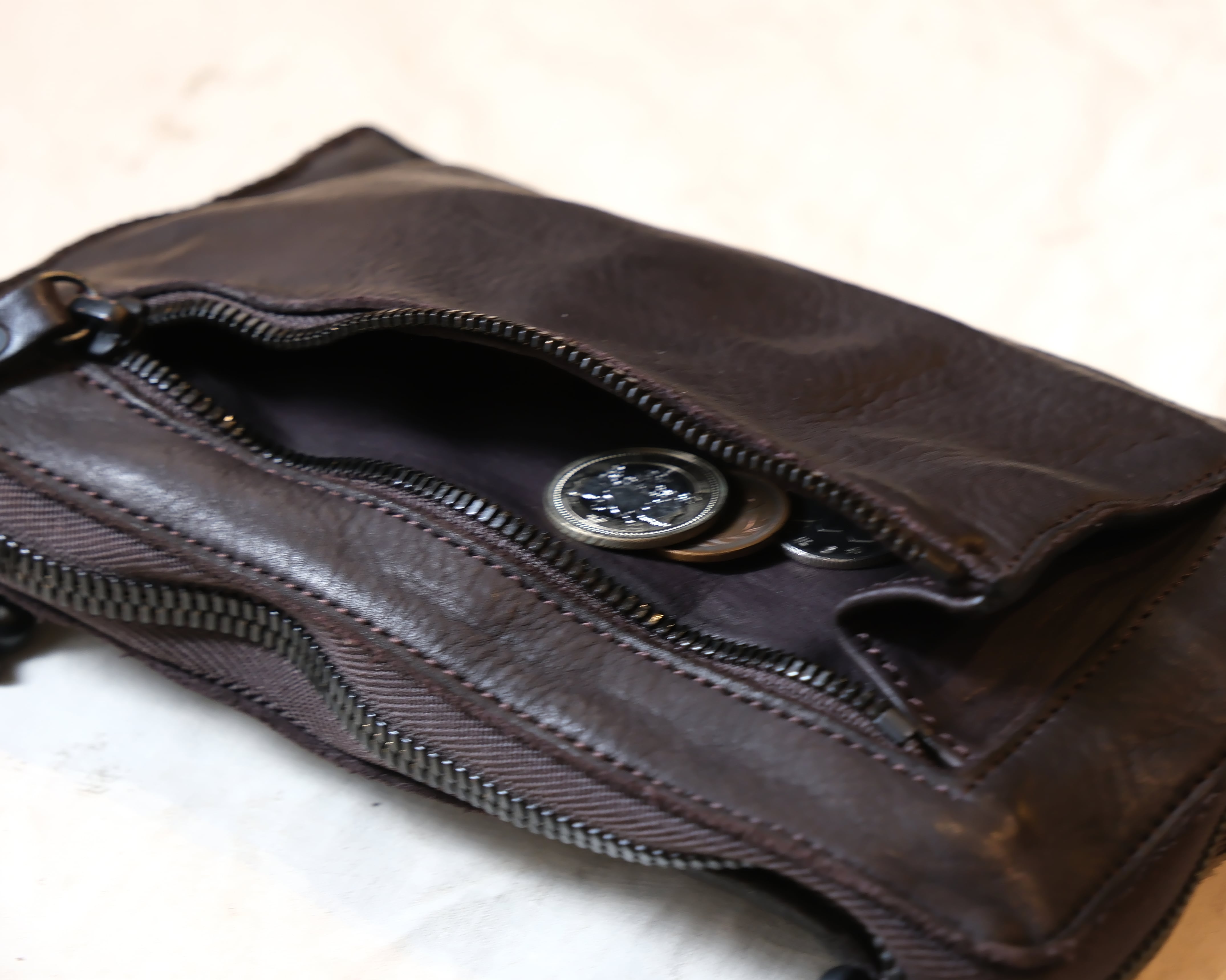 表面のファスナーポケットにはマチがあるのでコインや小物等を、各仕切りにはお札や通帳やスマートフォンを入れられるので、ショルダーを取り外して大きめのお財布として、またクラッチバッグとしてもお使い頂けます。