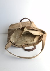 バッグのメインスペースは内袋に付けたファスナーで閉じることが出来、内袋の外側を内ポケットとして使用できます。片面は本体の途中にステッチとカシメで留め付けてあり、もう片面は引っ掛け金具が付いているので、留めれば2つのポケットとして、外せば広めの内ポケットとして使えます。底は2重仕立てとなっており、クロスステッチを施してあります。