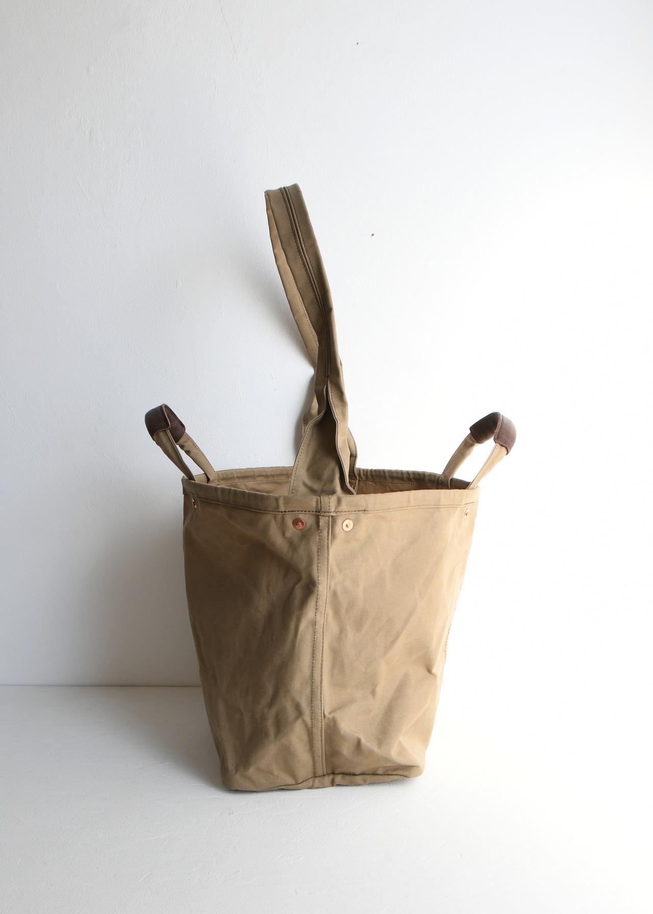 帆布は国内産パラフィン防水10号帆布、ショルダーや持ち手を留め付けるのは銅製(カラーによってはアルミ製)の打ち抜きリベット、カシメや留め具等の金具類は真鍮製、口元の芯には4mm厚の牛ヌメ革を使用。