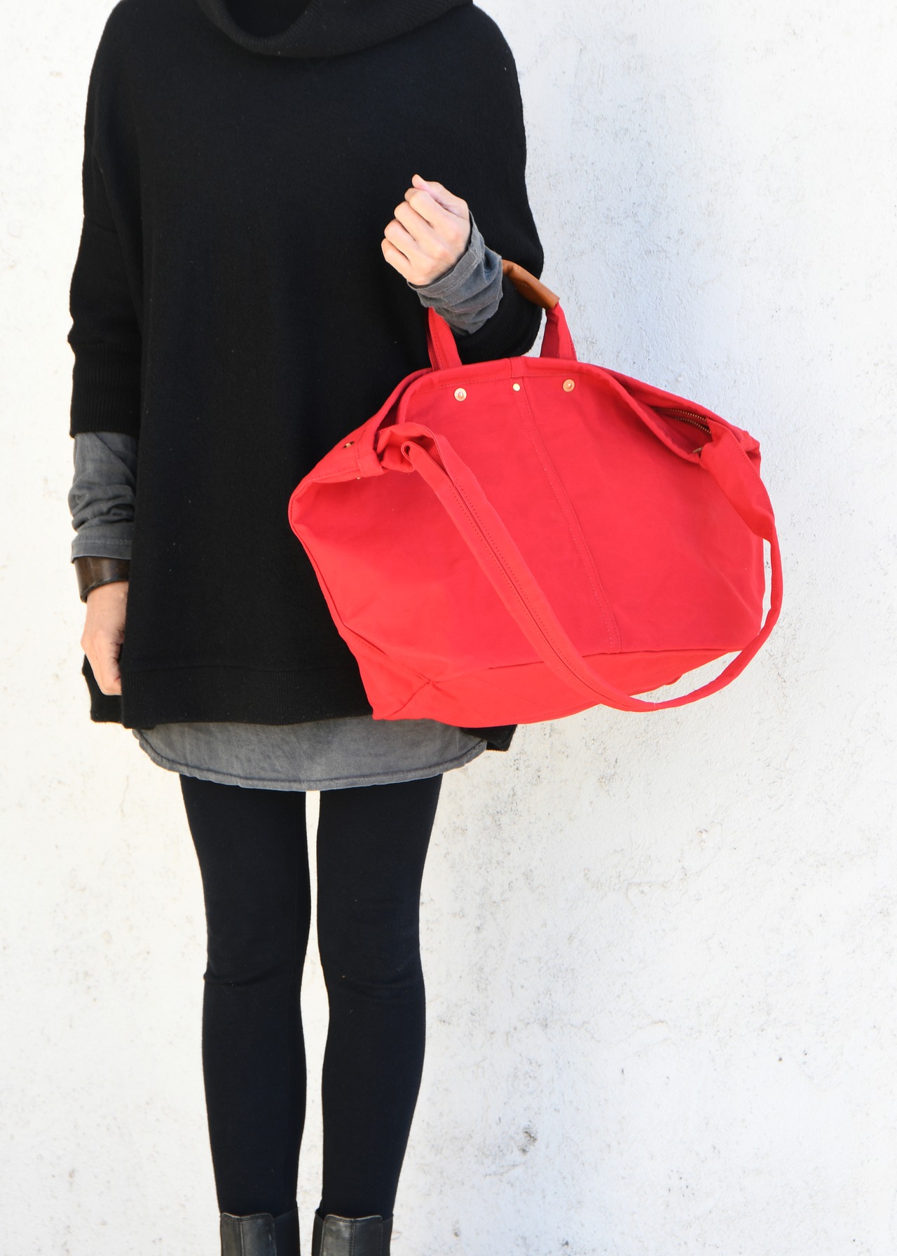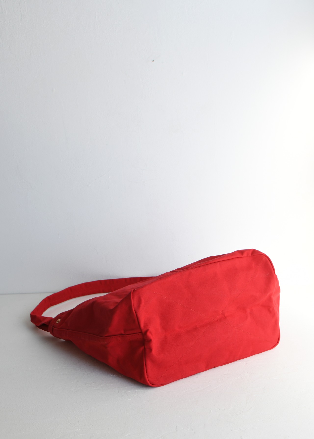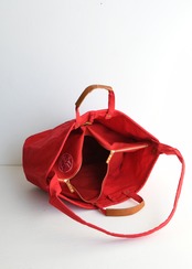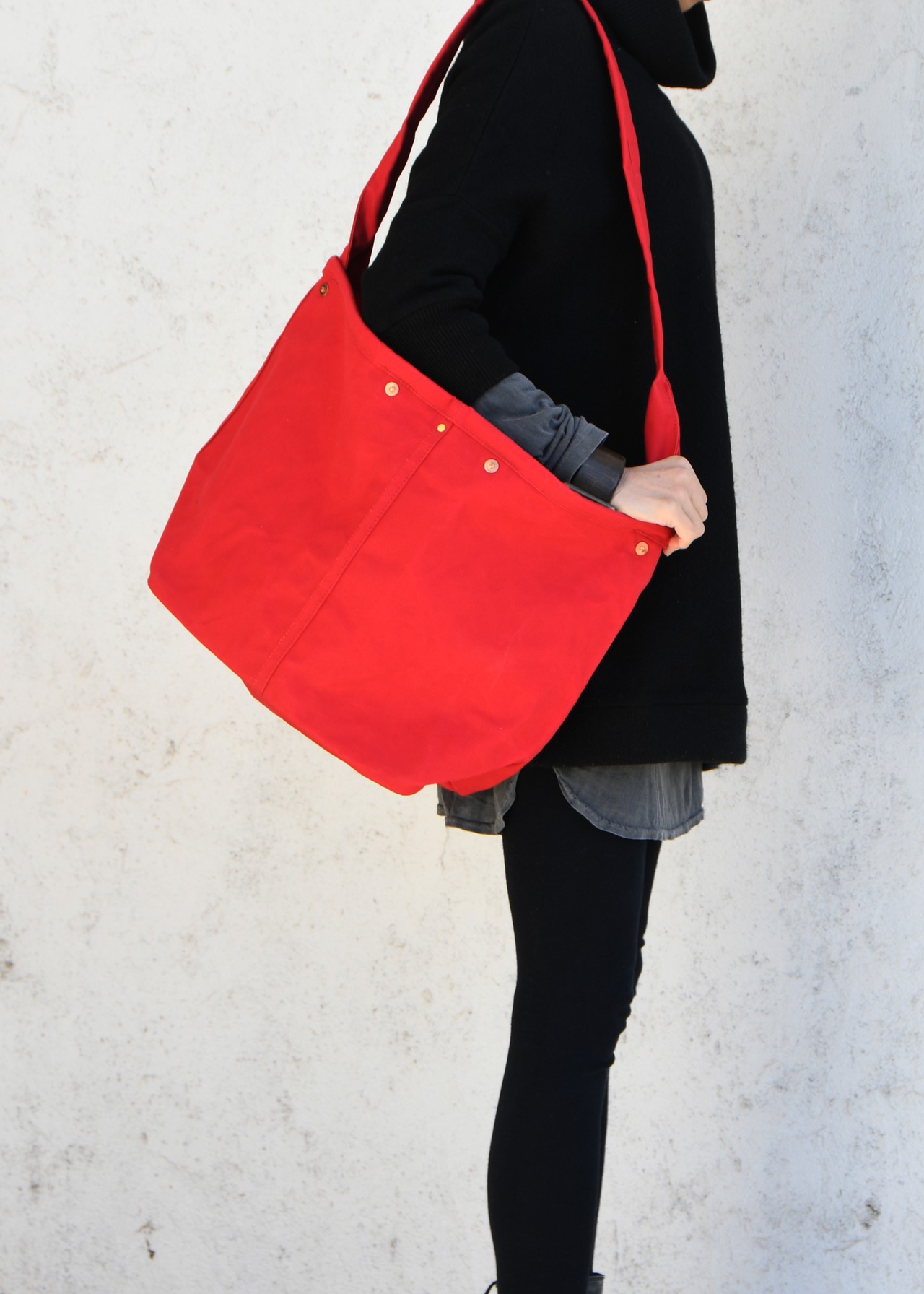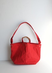 帆布は国内産パラフィン防水10号帆布、ショルダーや持ち手を留め付けるのは銅製(カラーによってはアルミ製)の打ち抜きリベット、カシメや留め具等の金具類は真鍮製、口元の芯には4mm厚の牛ヌメ革を使用。