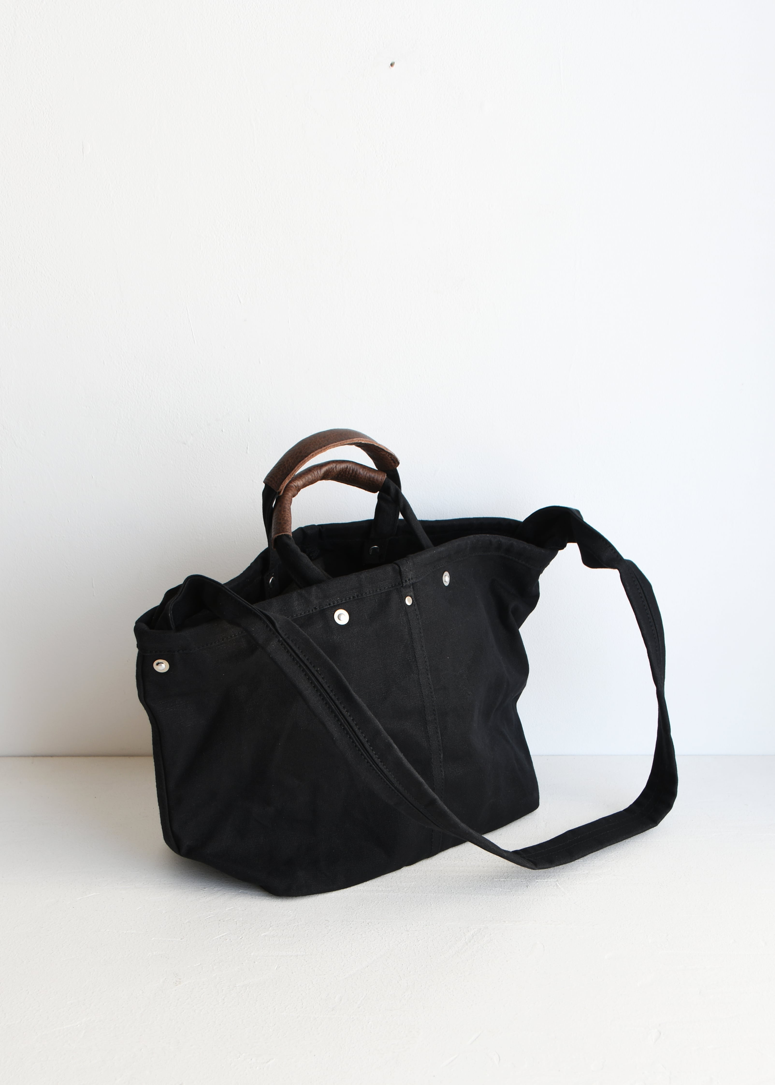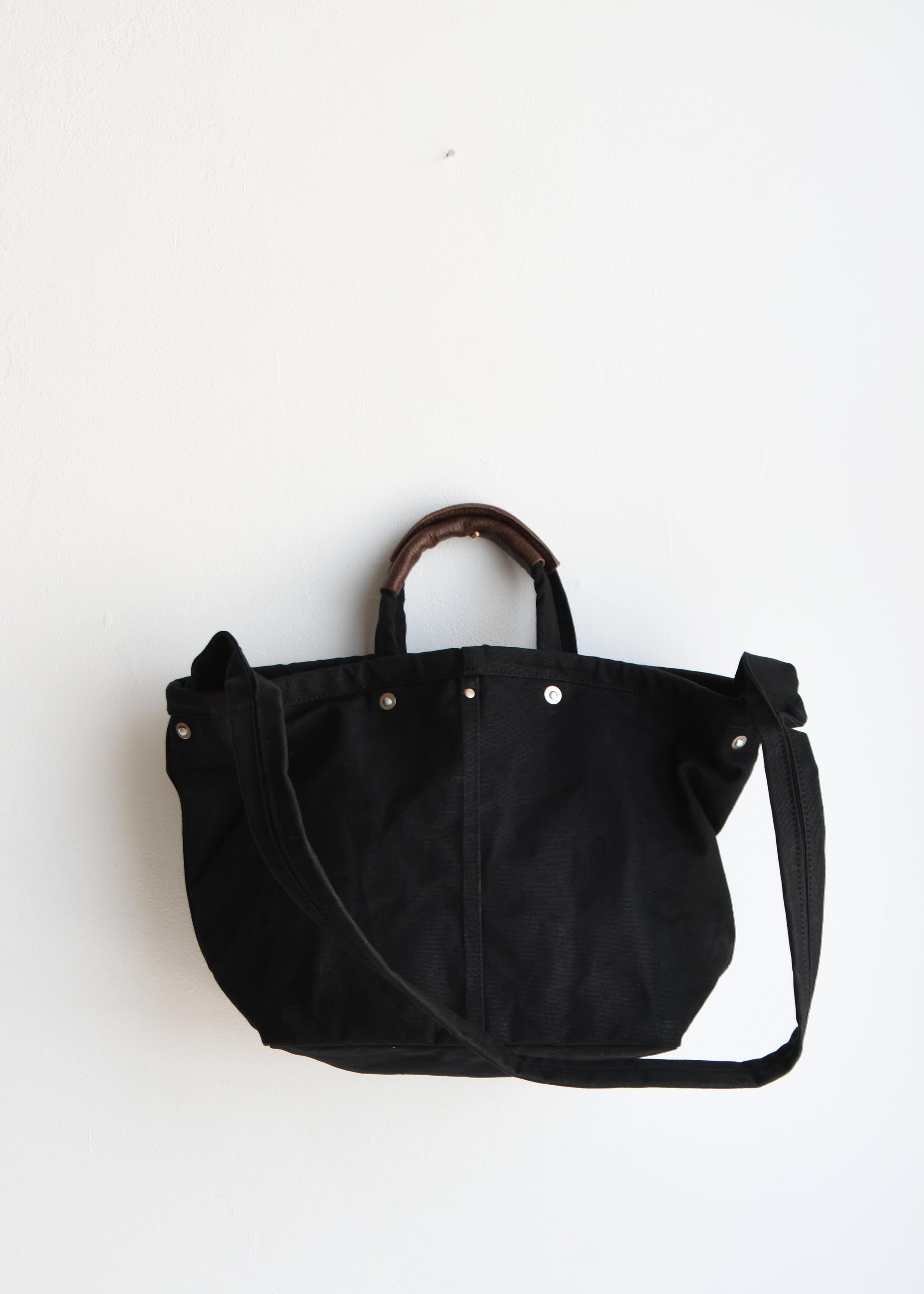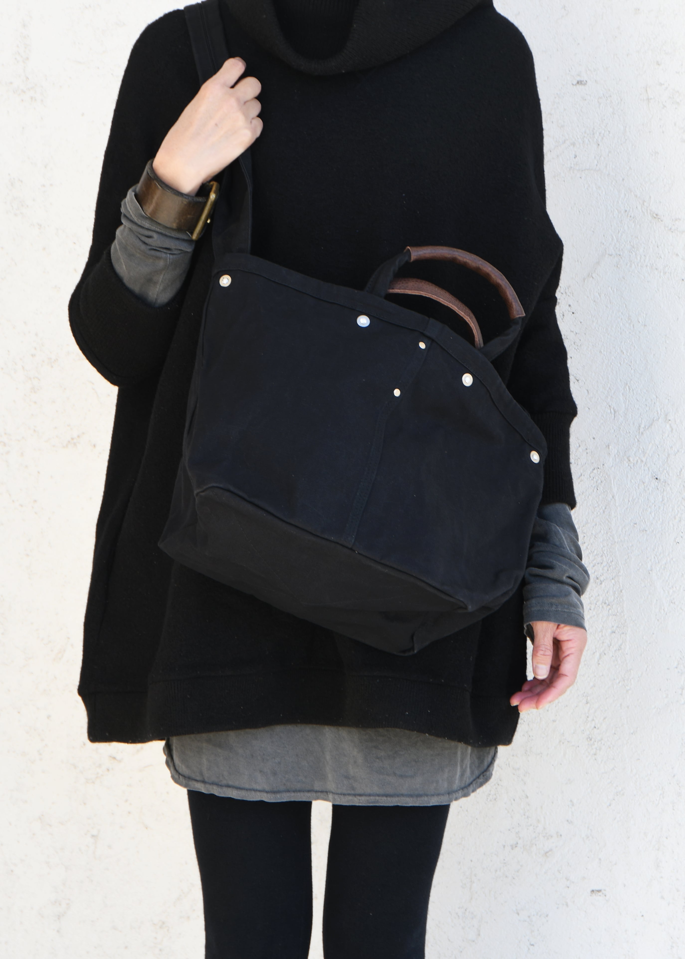 帆布は国内産パラフィン防水10号帆布、ショルダーや持ち手を留め付けるのは銅製(カラーによってはアルミ製)の打ち抜きリベット、カシメや留め具等の金具類は真鍮製、口元の芯には4mm厚の牛ヌメ革を使用。