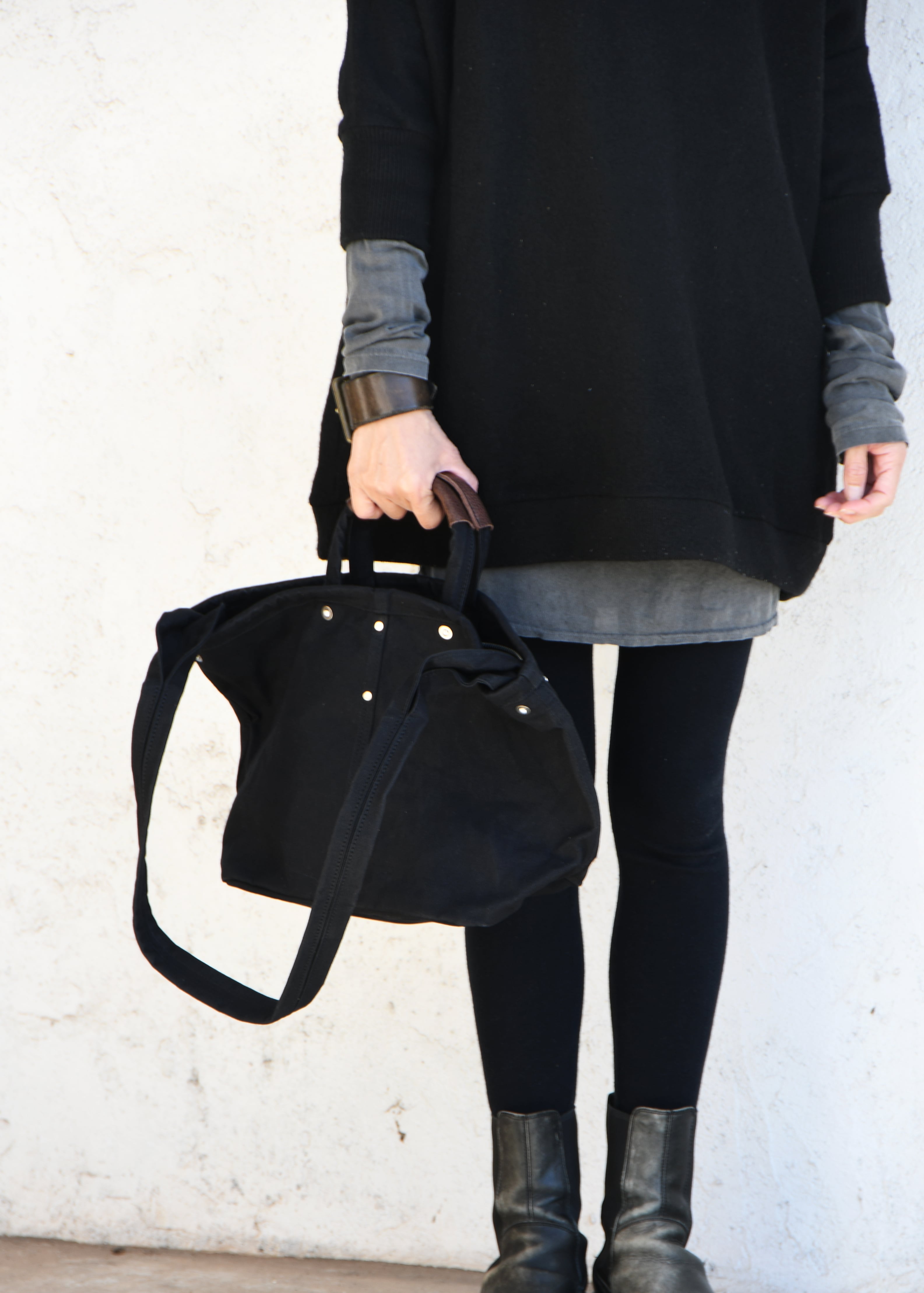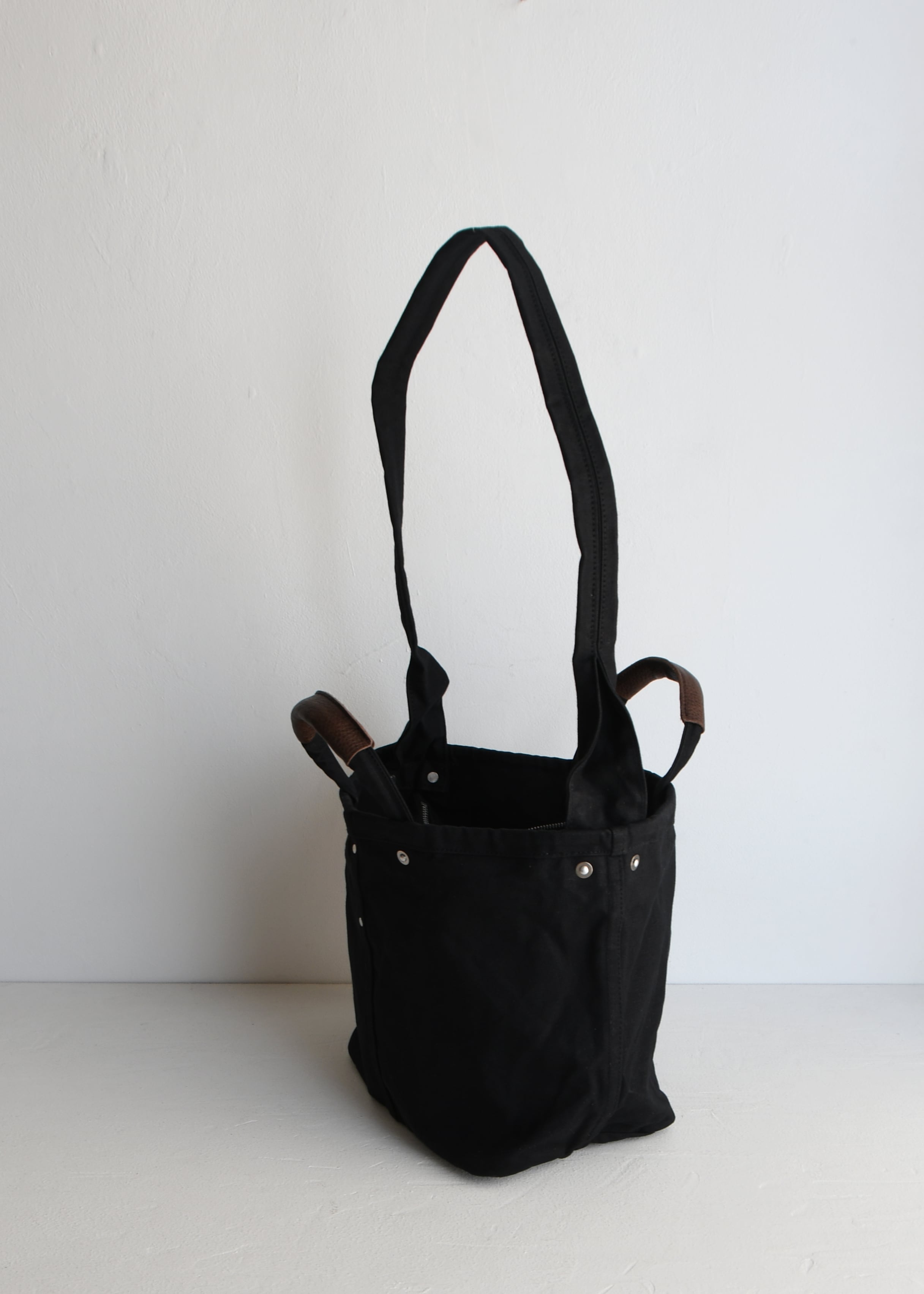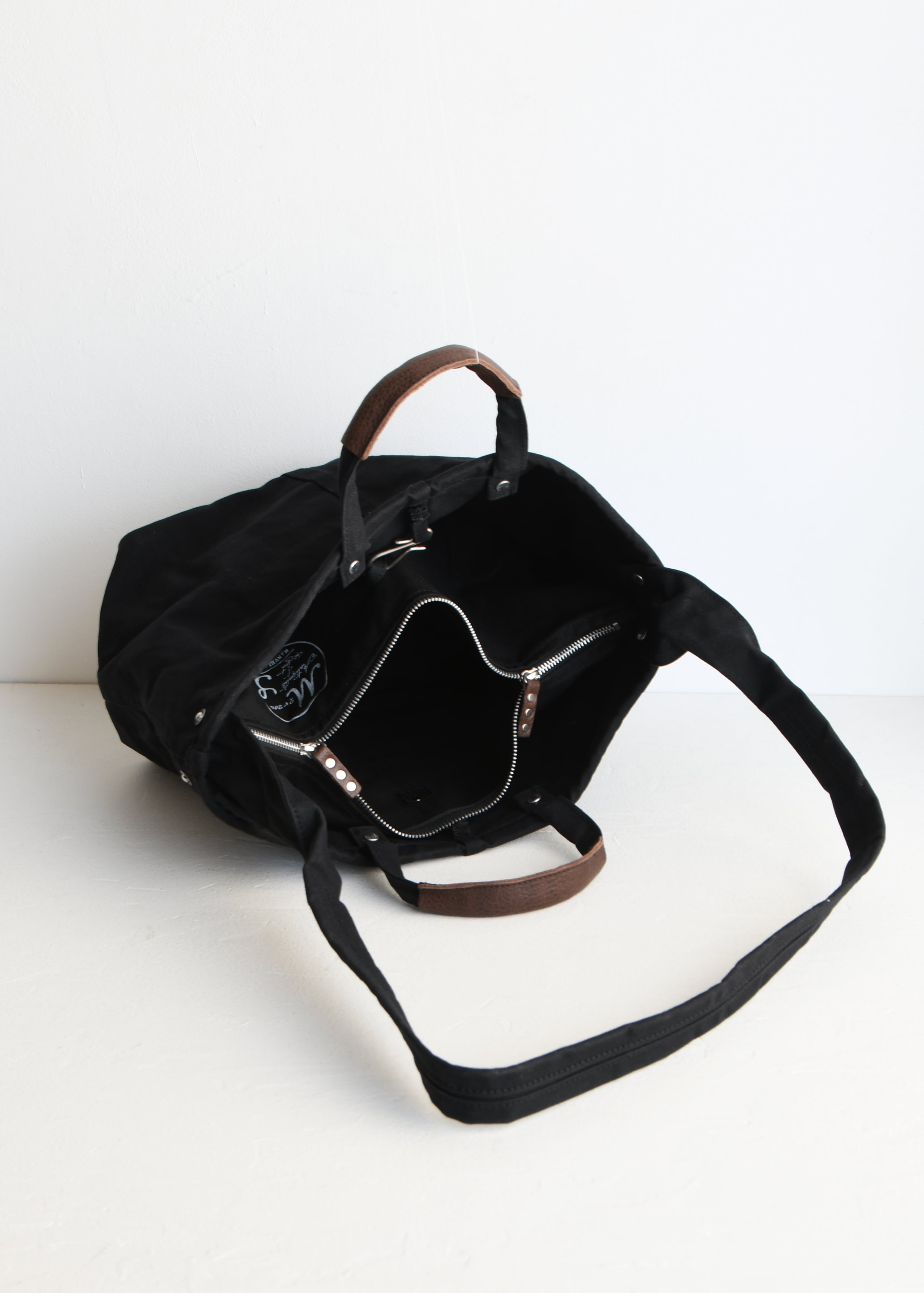 帆布は国内産パラフィン防水10号帆布、ショルダーや持ち手を留め付けるのは銅製(カラーによってはアルミ製)の打ち抜きリベット、カシメや留め具等の金具類は真鍮製、口元の芯には4mm厚の牛ヌメ革を使用。