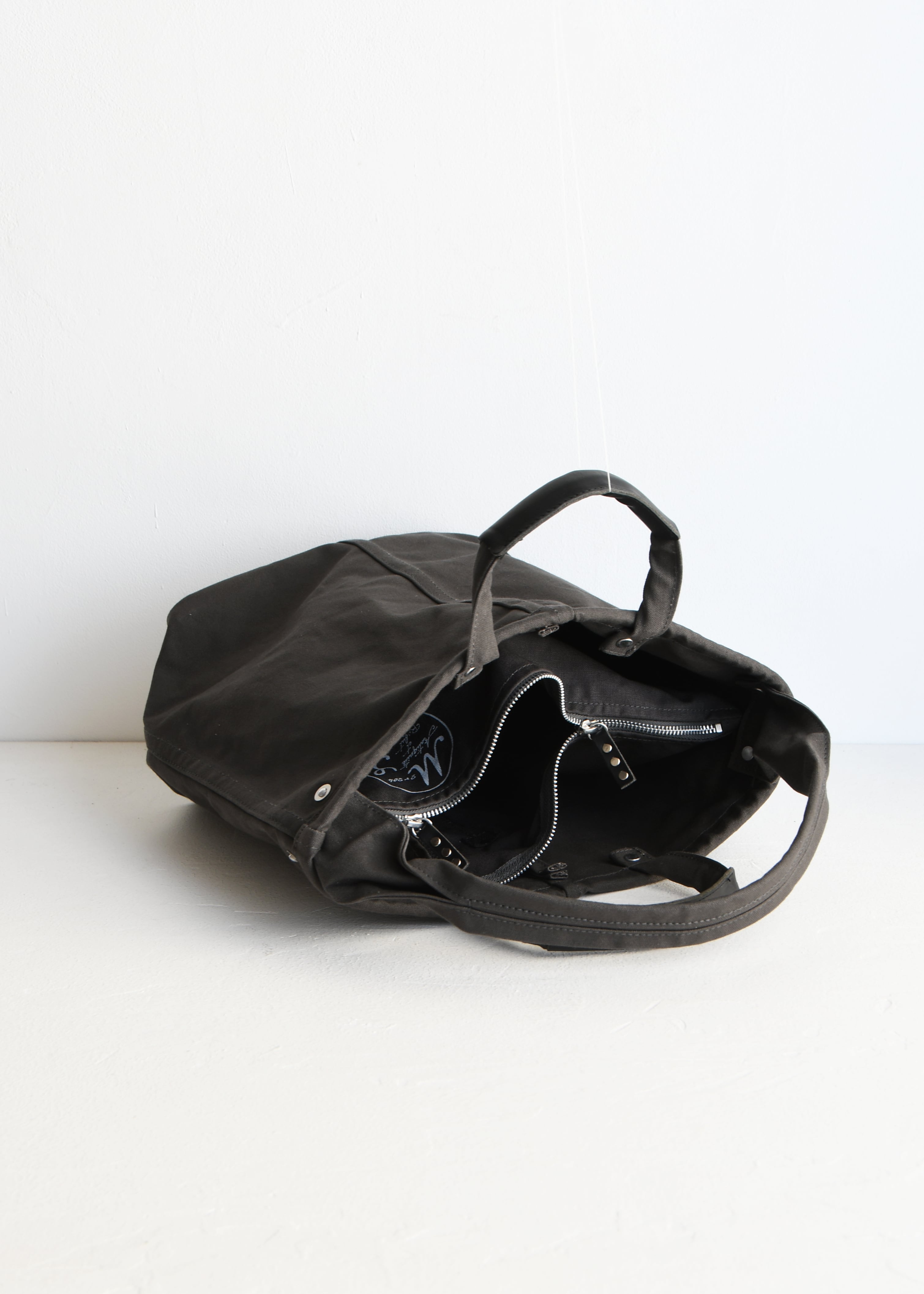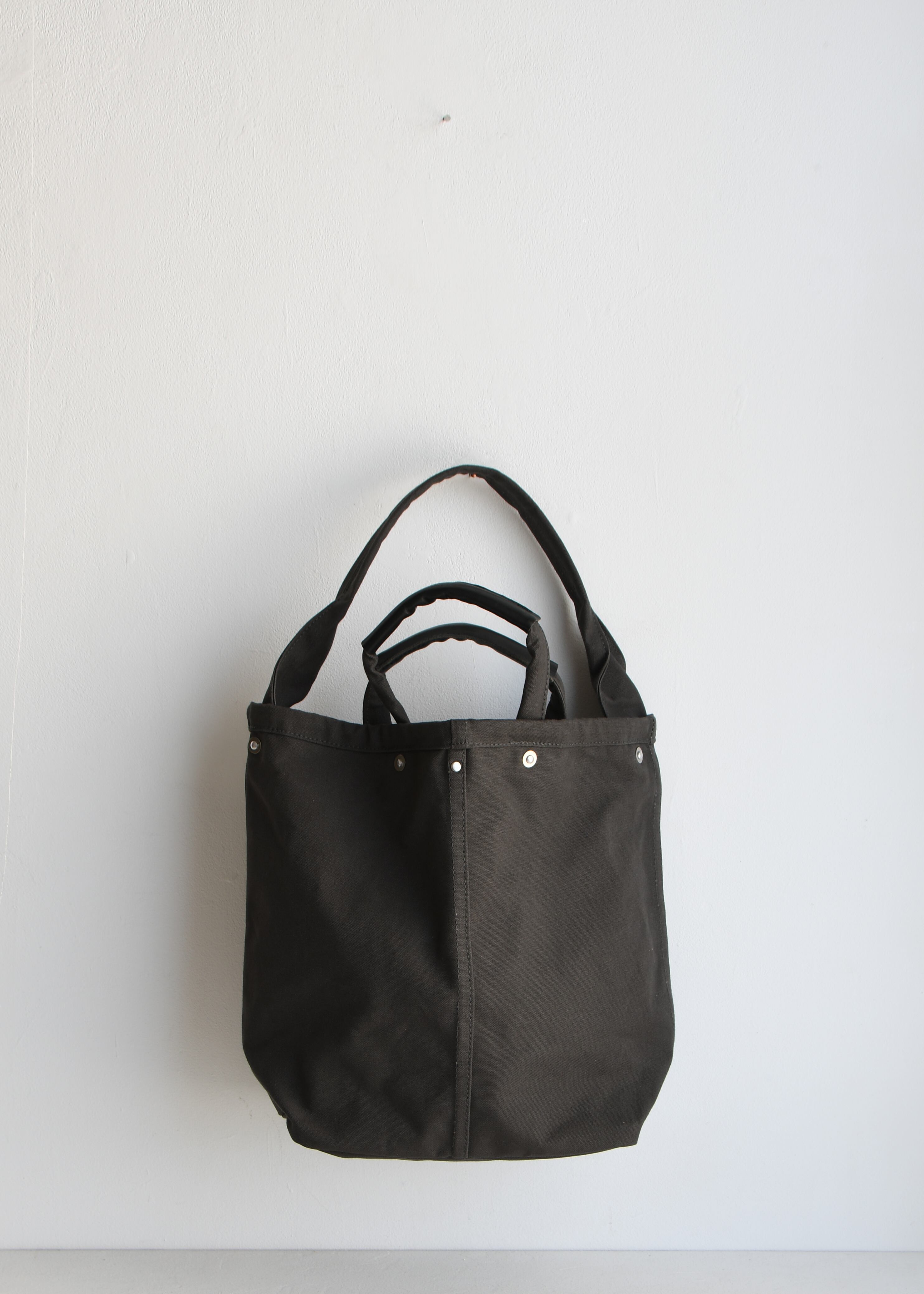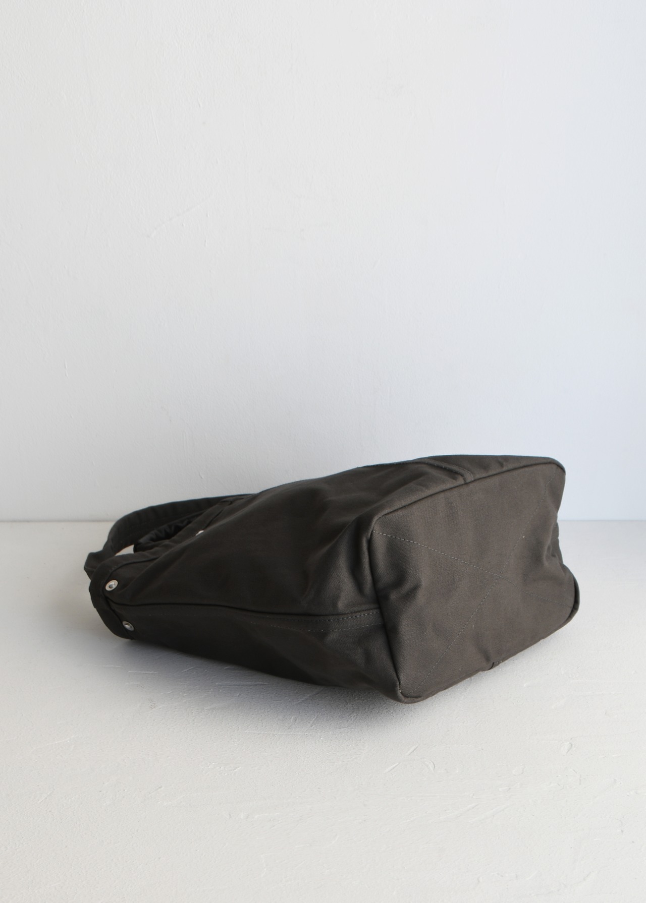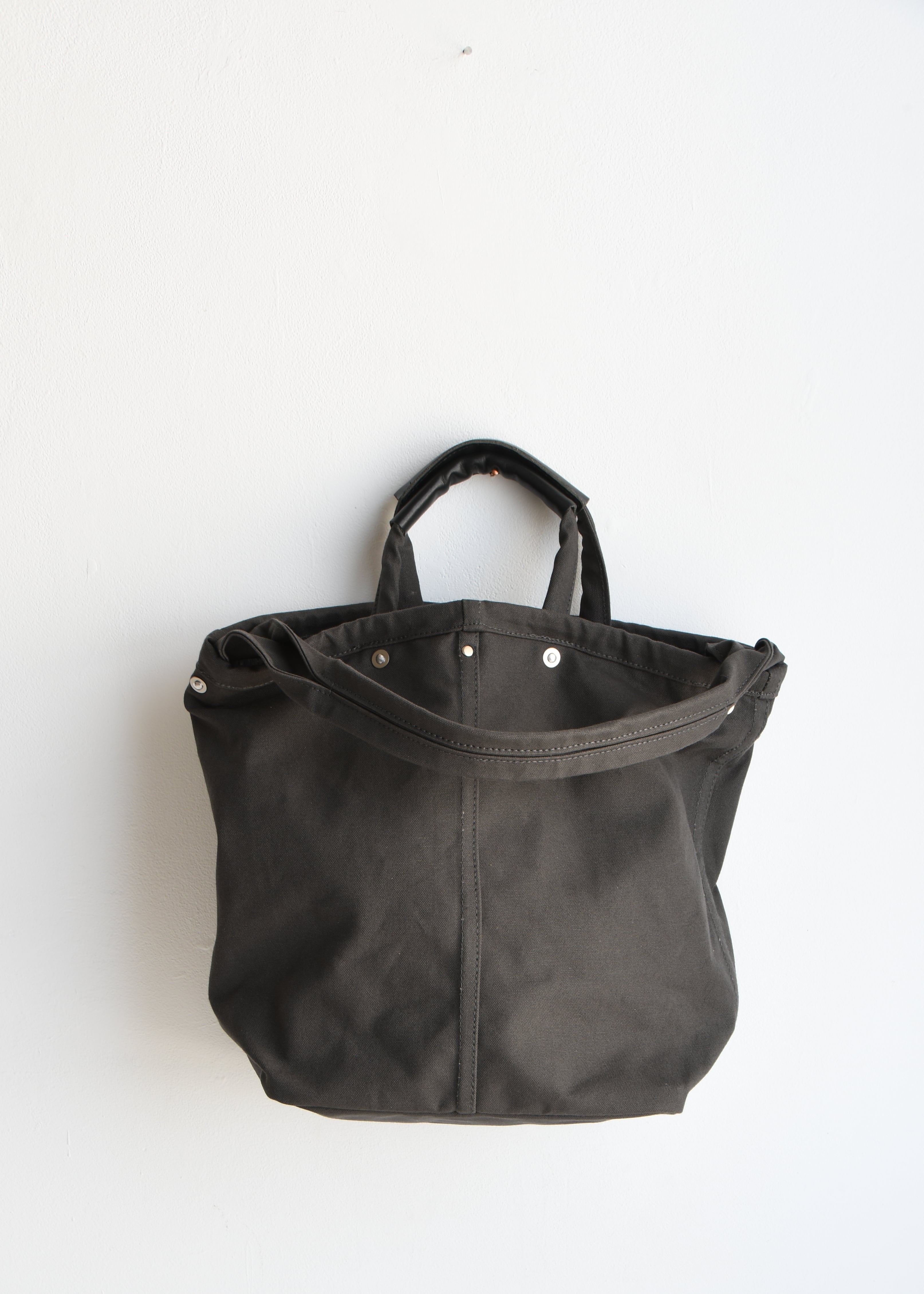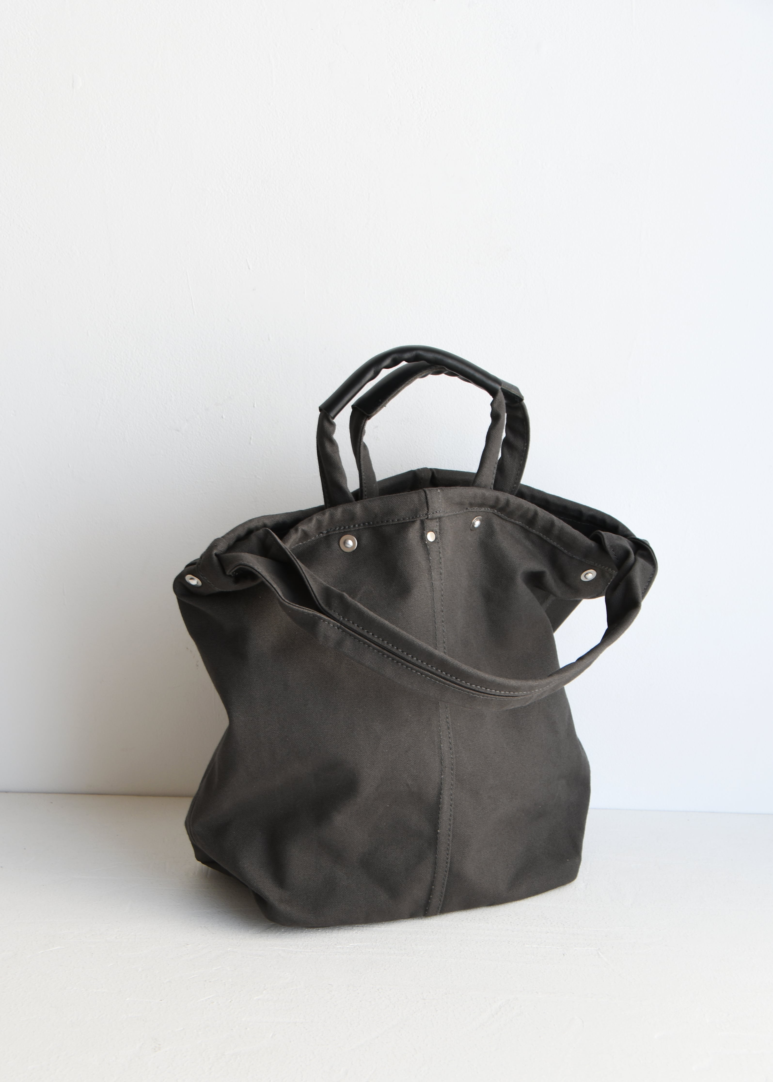 帆布は国内産パラフィン防水10号帆布、ショルダーや持ち手を留め付けるのは銅製(カラーによってはアルミ製)の打ち抜きリベット、カシメや留め具等の金具類は真鍮製、口元の芯には4mm厚の牛ヌメ革を使用。