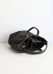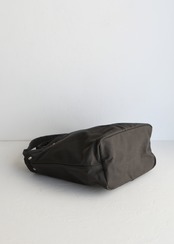 バッグのメインスペースは内袋に付けたファスナーで閉じることが出来、内袋の外側を内ポケットとして使用できます。片面は本体の途中にステッチとカシメで留め付けてあり、もう片面は引っ掛け金具が付いているので、留めれば2つのポケットとして、外せば広めの内ポケットとして使えます。底は2重仕立てとなっており、クロスステッチを施してあります。