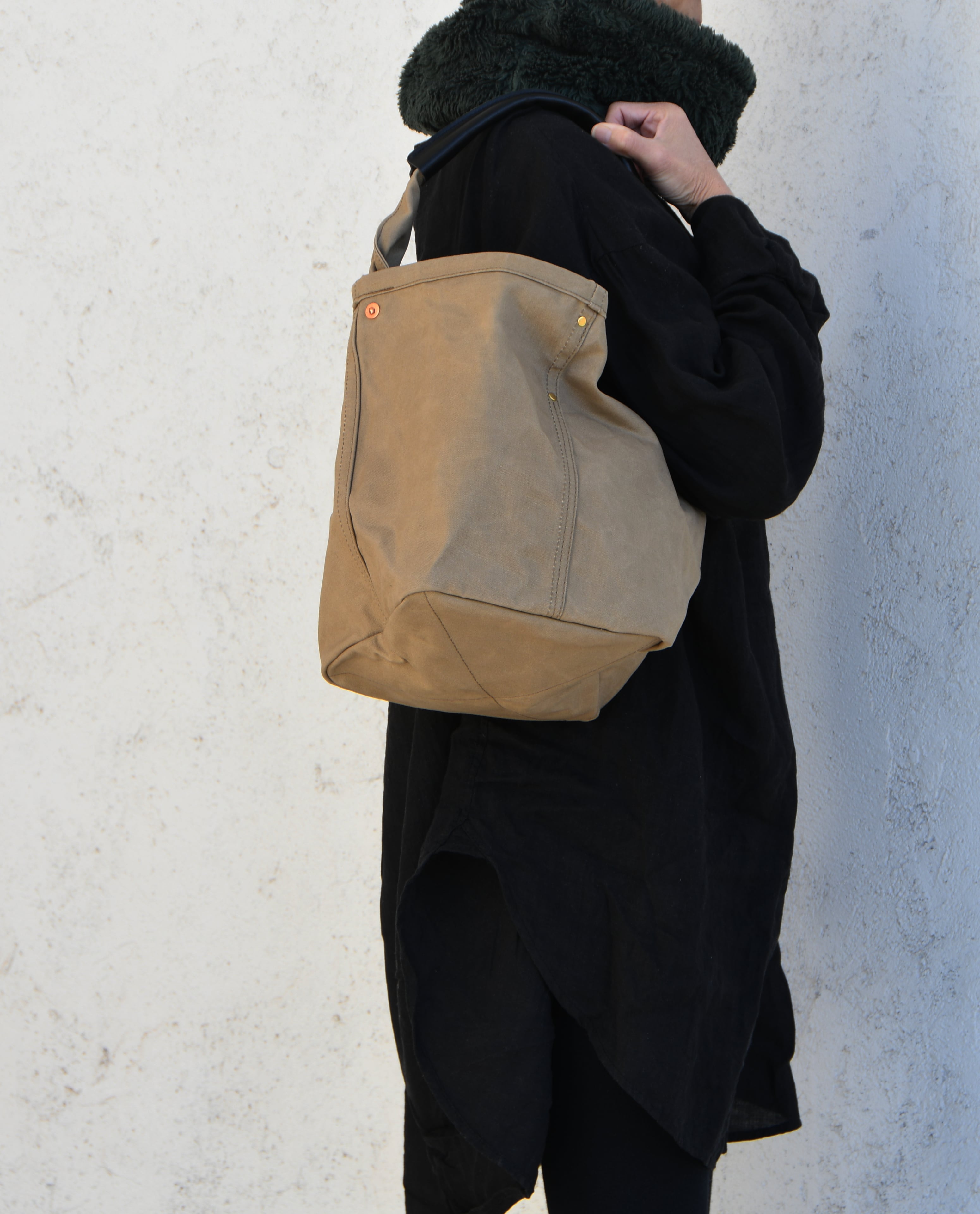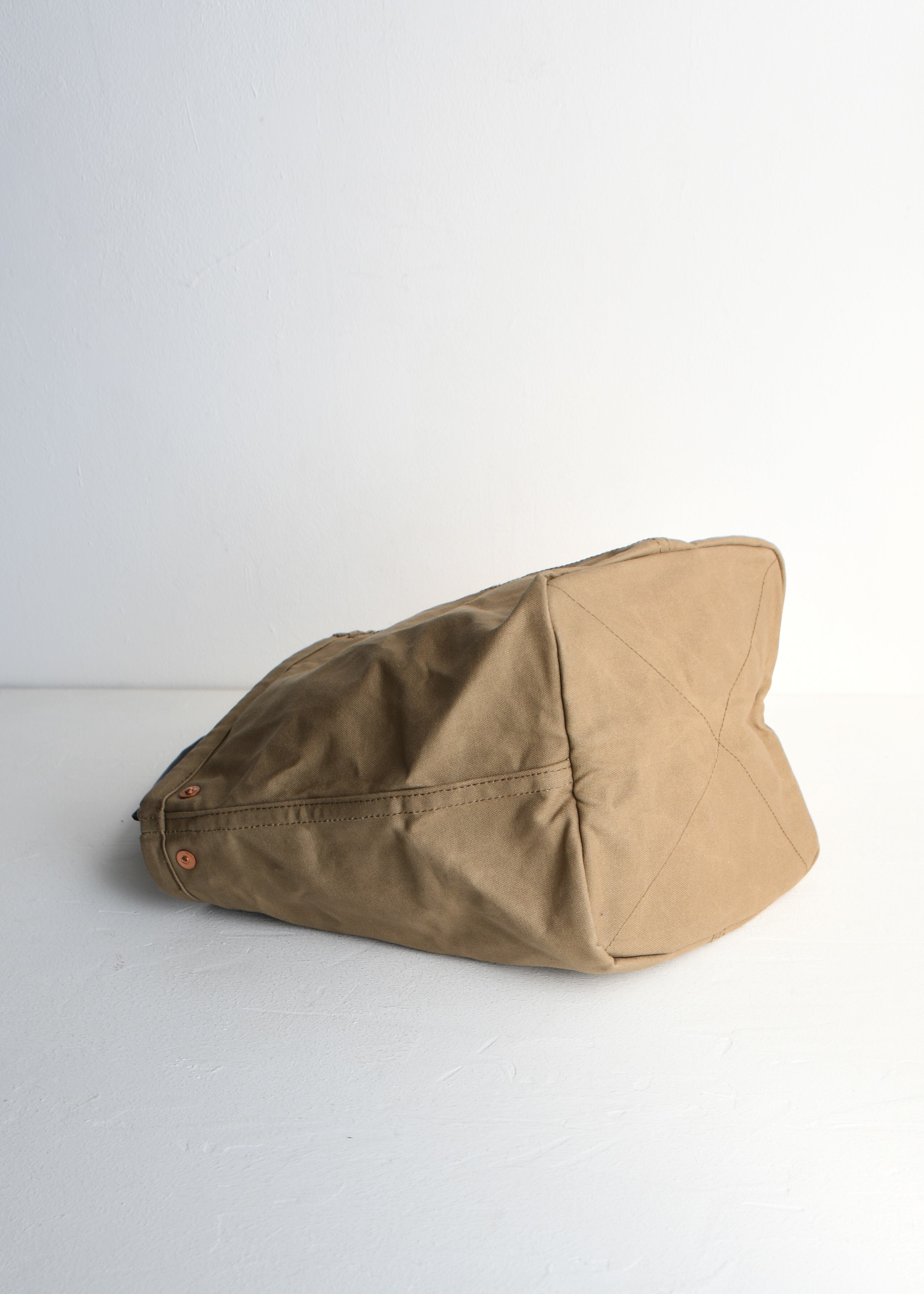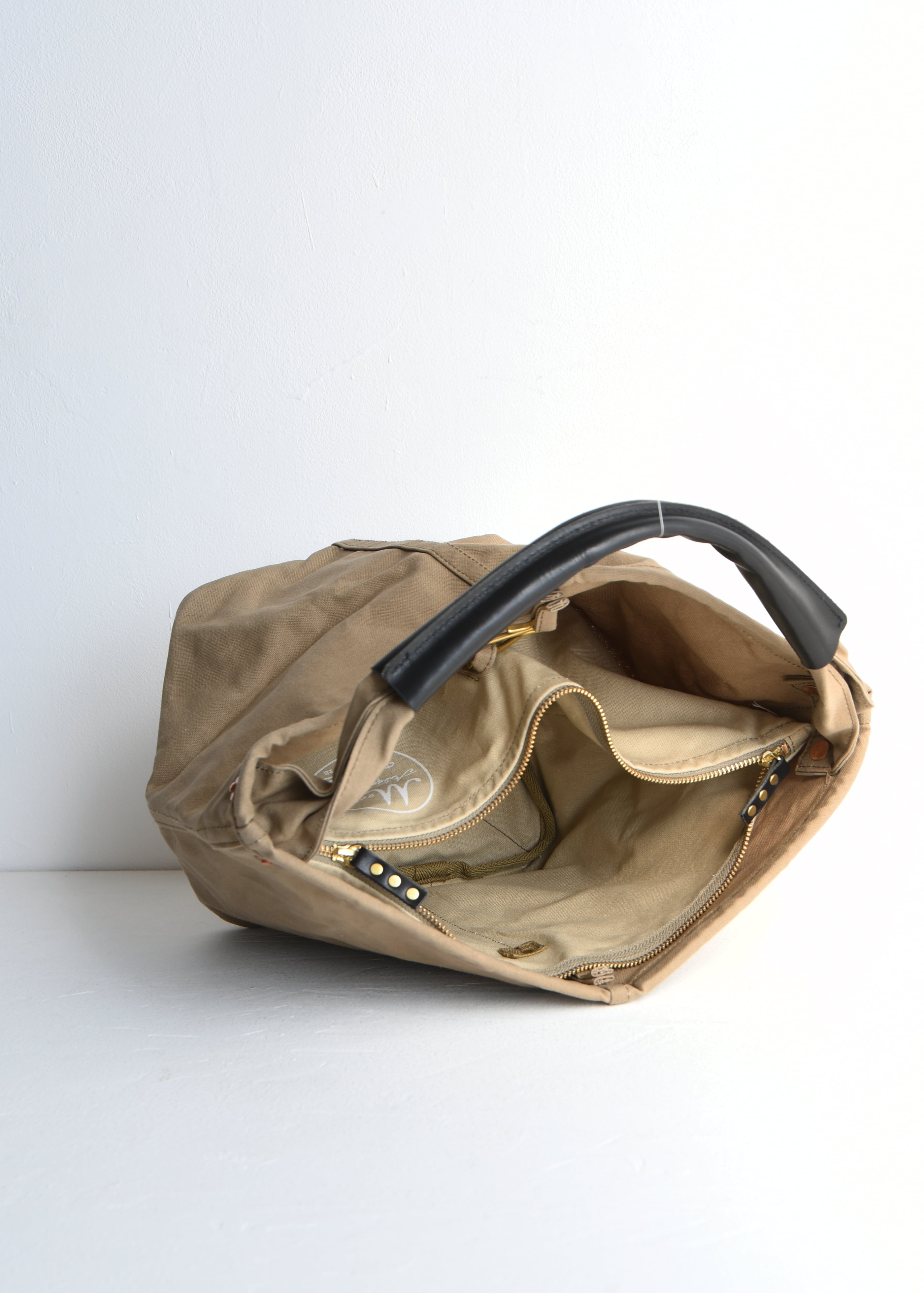 帆布は国内産パラフィン防水10号帆布、ショルダーや持ち手を留め付けるのは銅製(カラーによってはアルミ製)の打ち抜きリベット、カシメや留め具等の金具類は真鍮製、口元の芯には4mm厚の牛ヌメ革を使用。