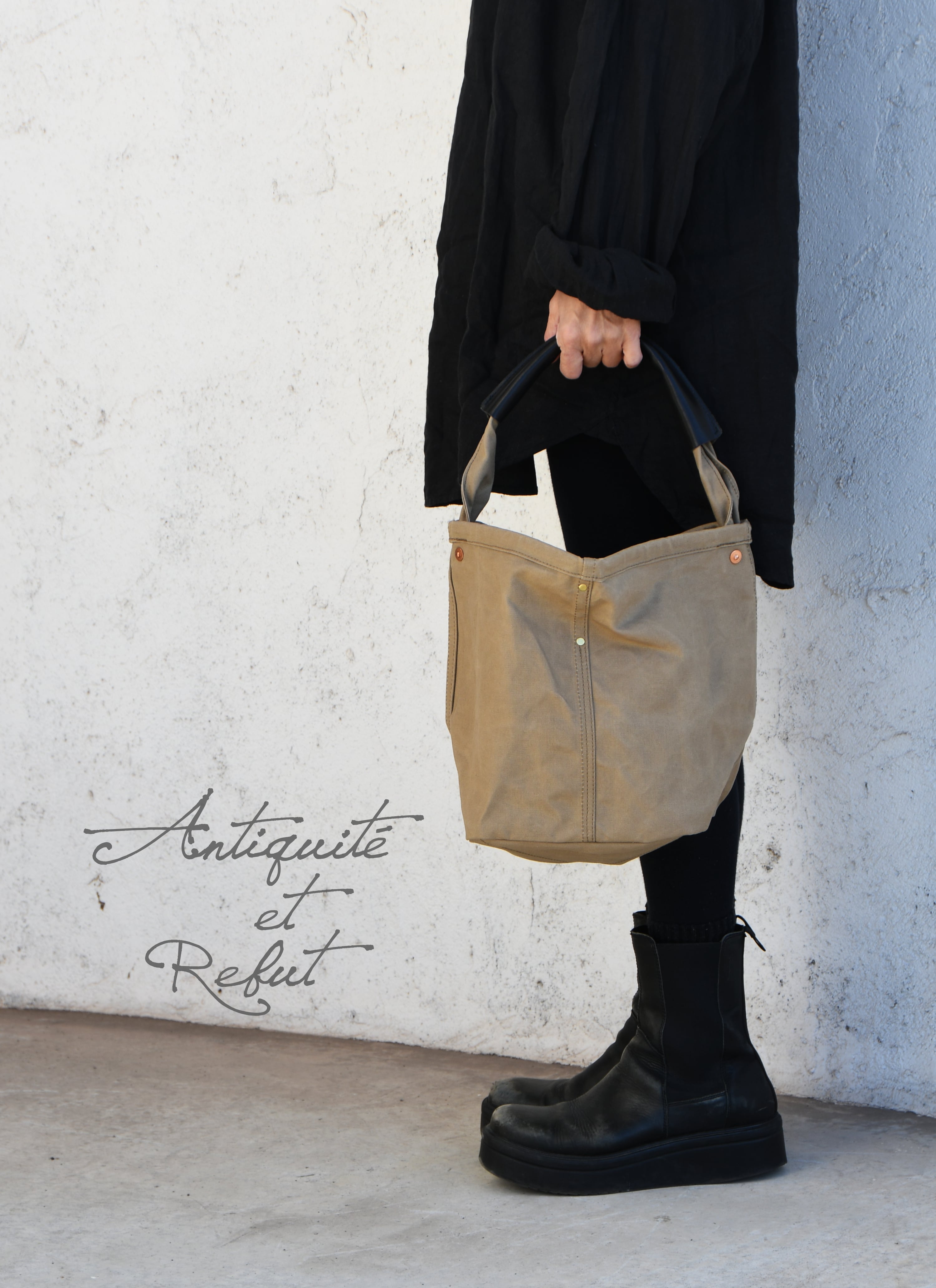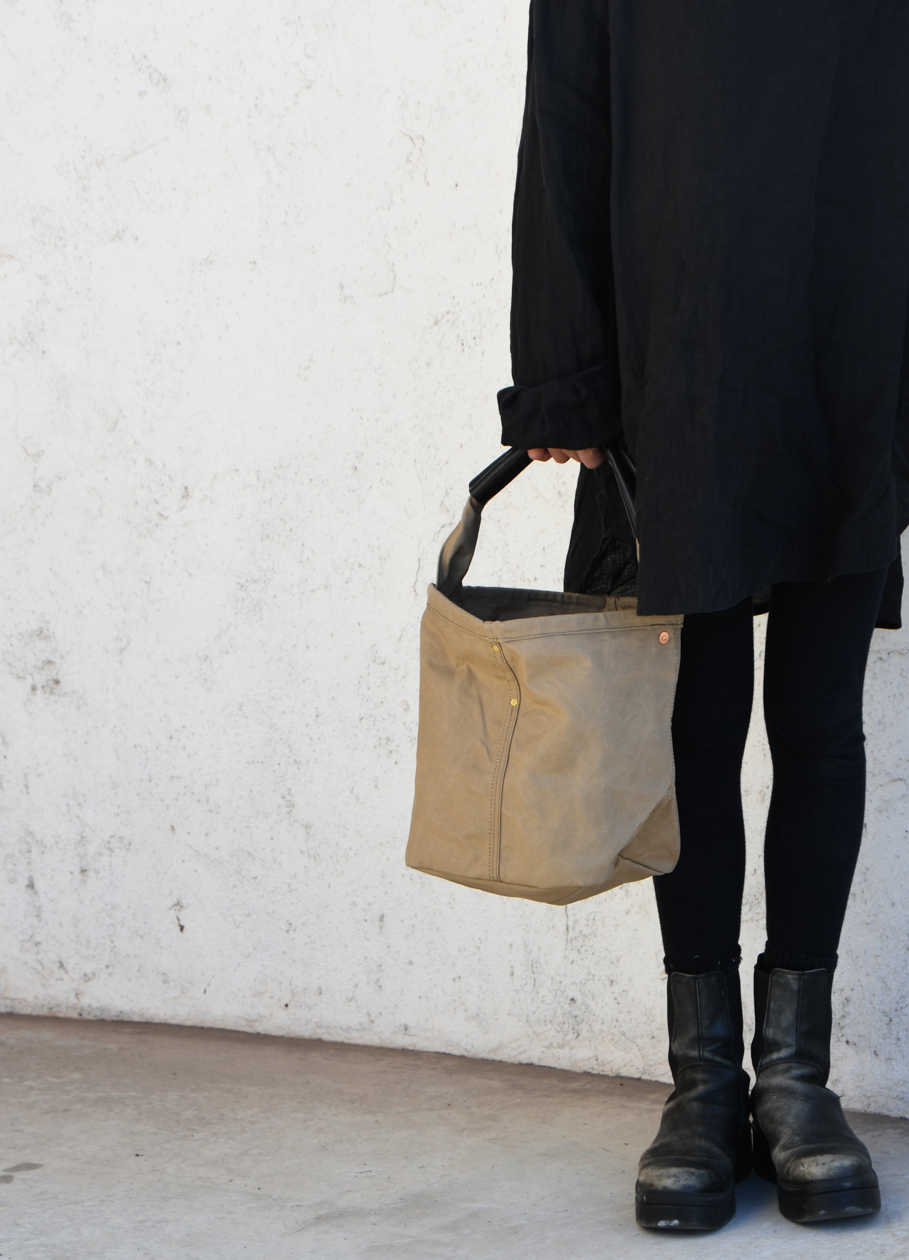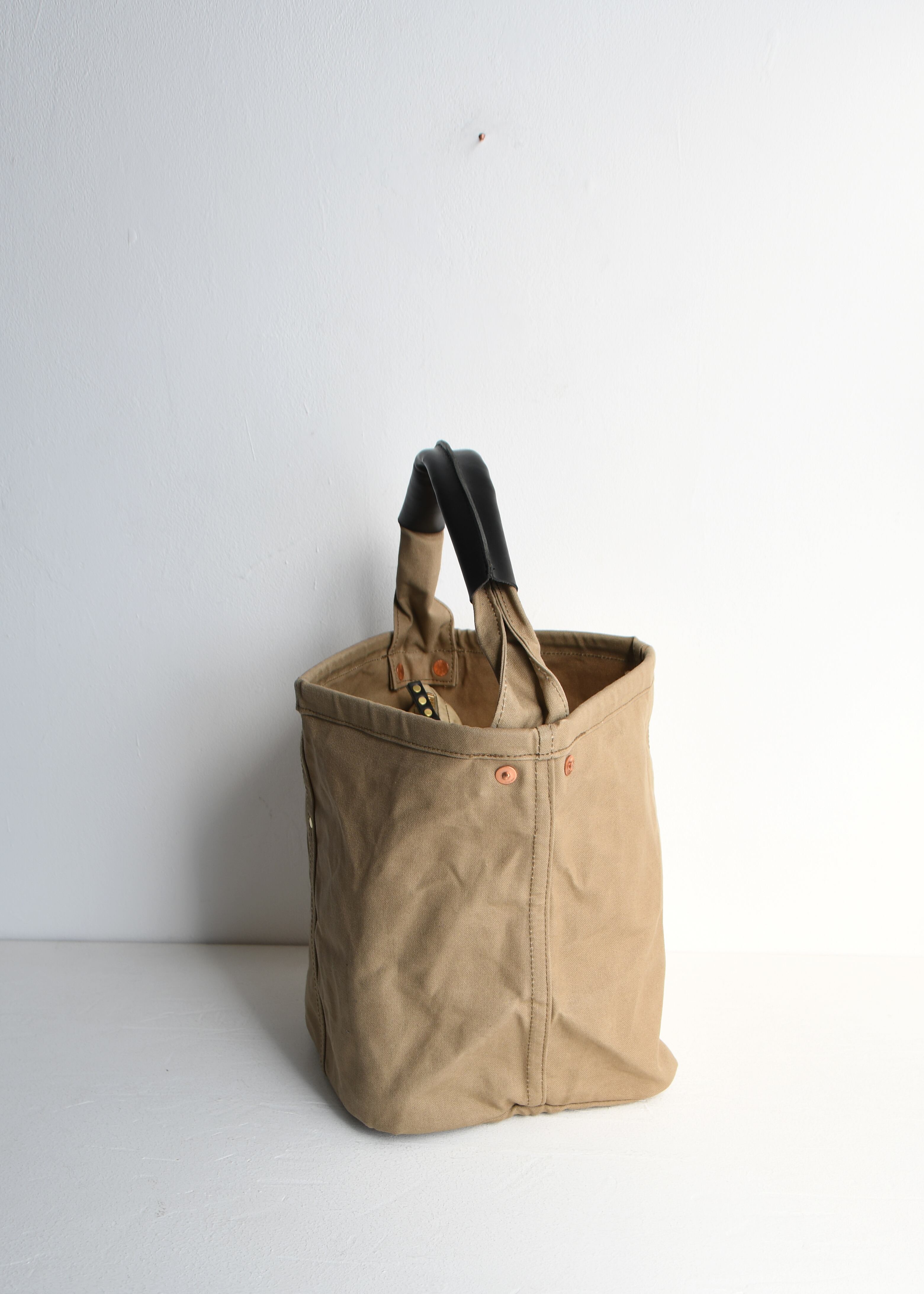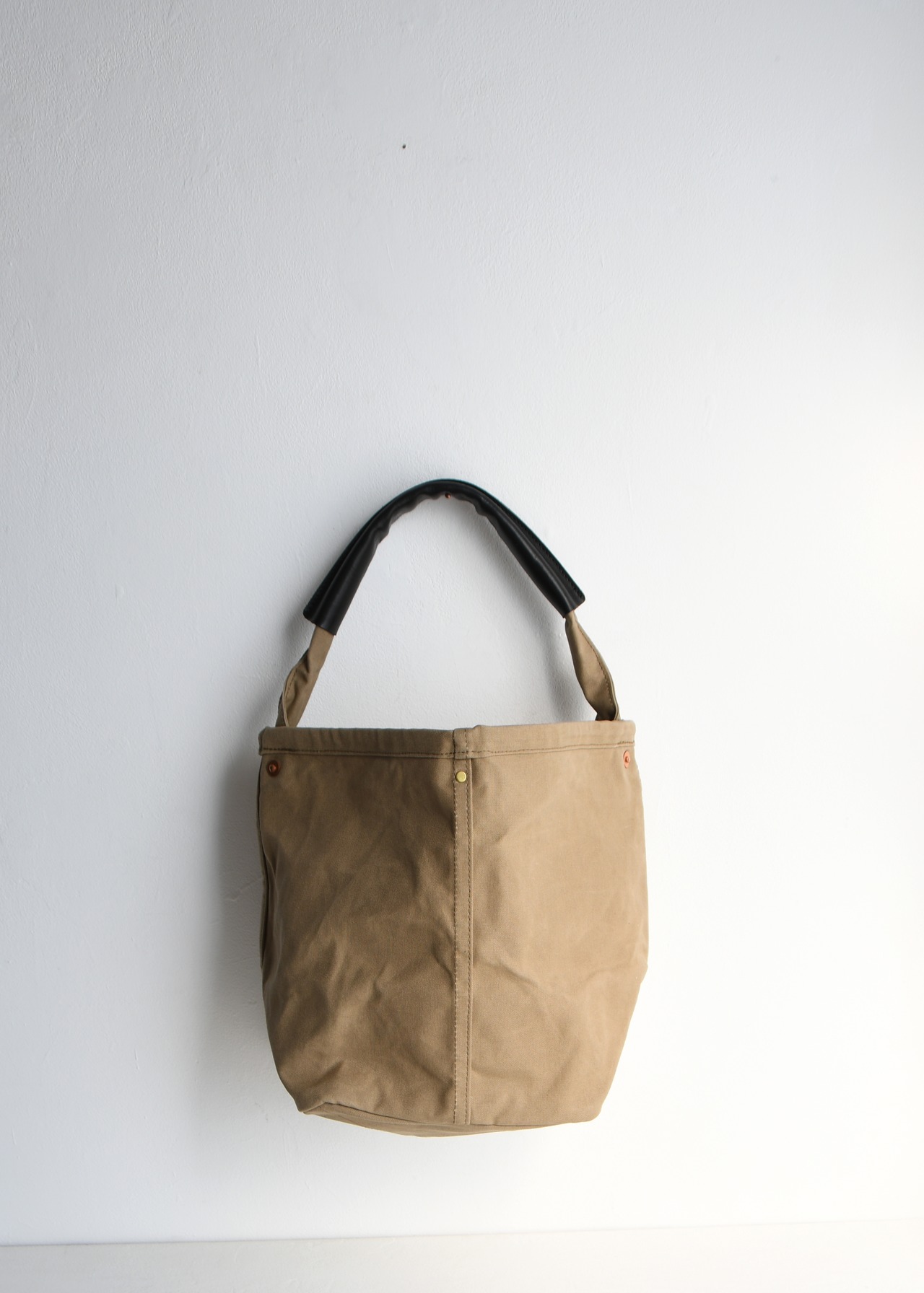 帆布は国内産パラフィン防水10号帆布、ショルダーや持ち手を留め付けるのは銅製(カラーによってはアルミ製)の打ち抜きリベット、カシメや留め具等の金具類は真鍮製、口元の芯には4mm厚の牛ヌメ革を使用。