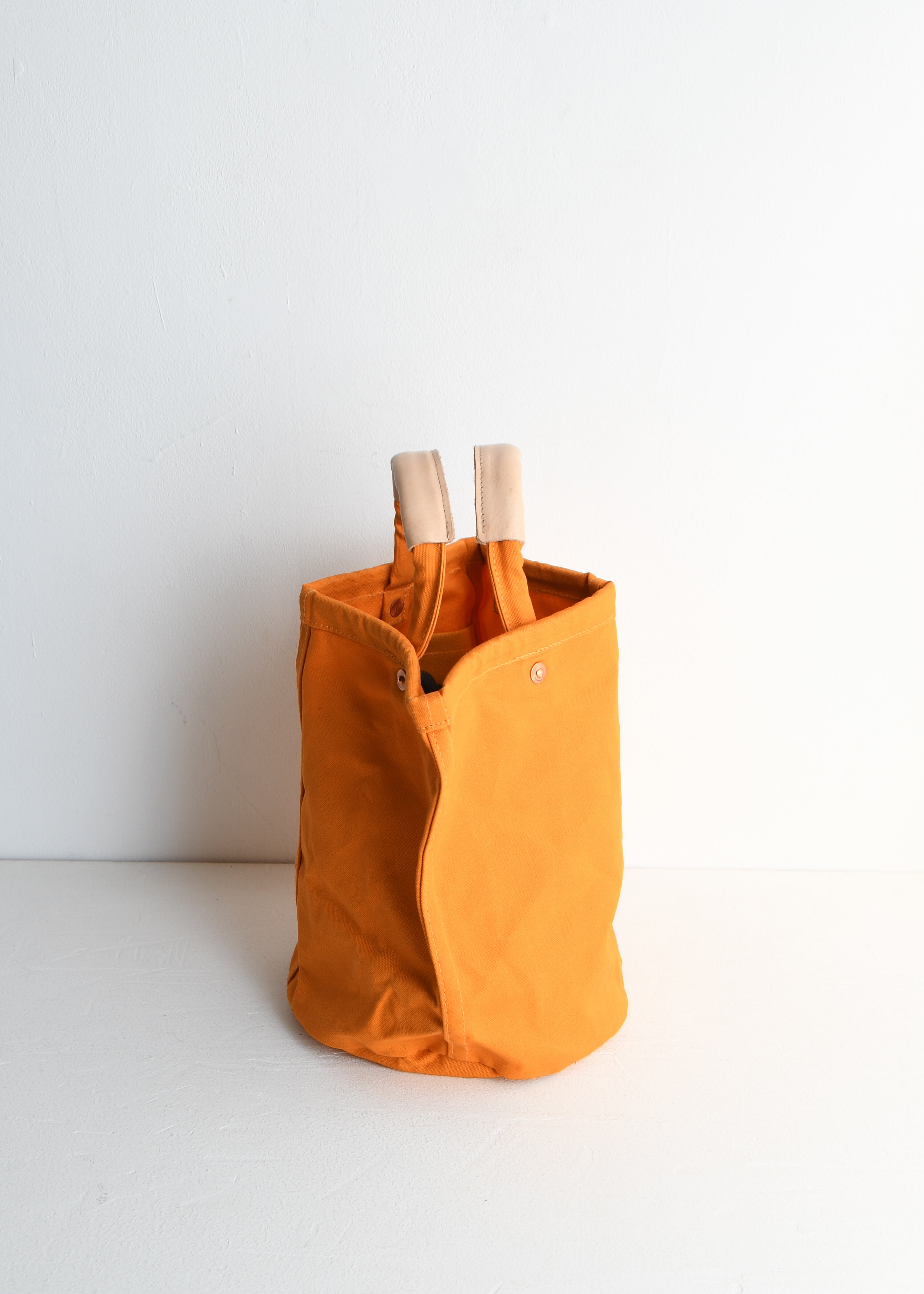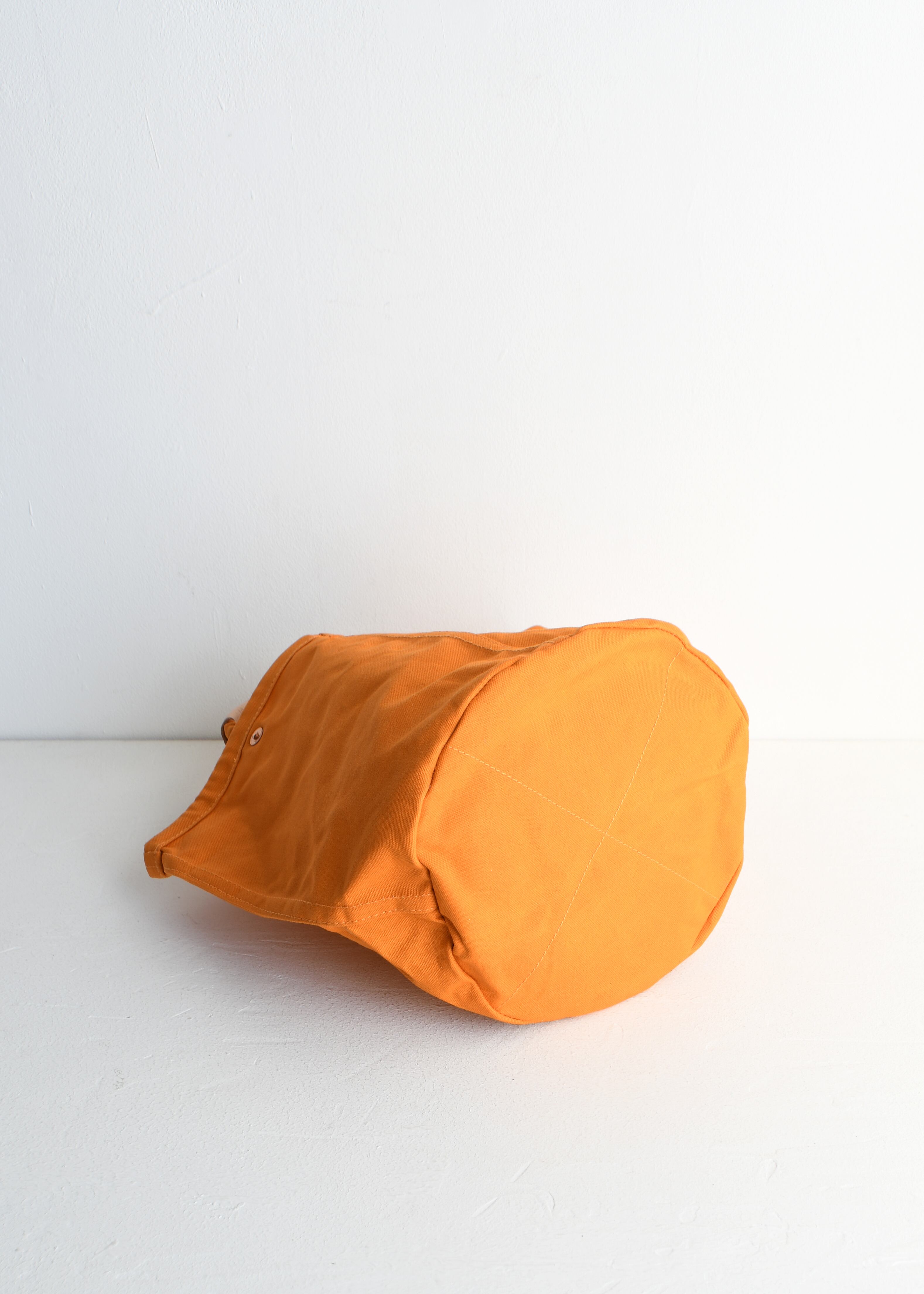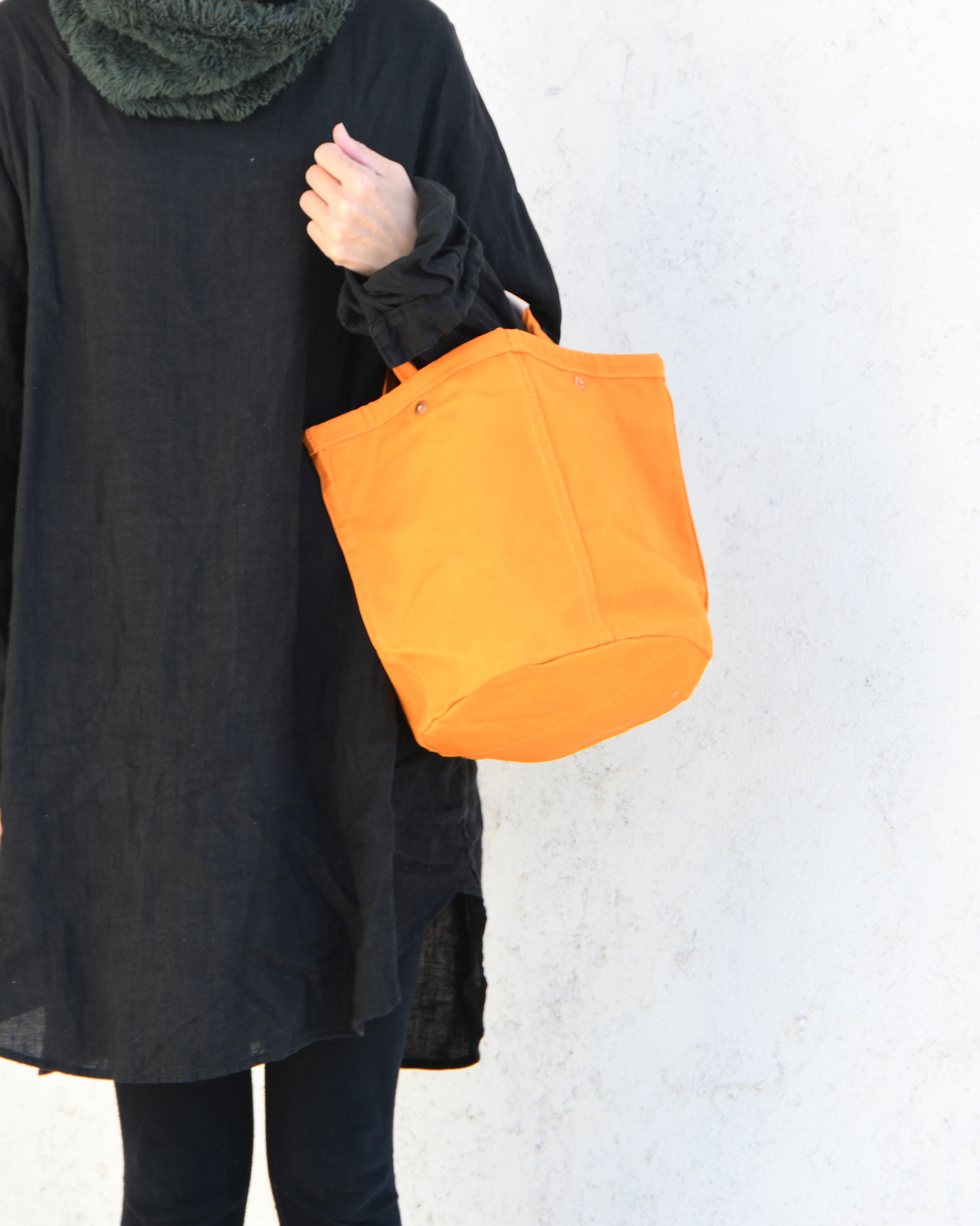 帆布は国内産パラフィン防水10号帆布、ショルダーや持ち手を留め付けるのは銅製(カラーによってはアルミ製)の打ち抜きリベット、カシメや留め具等の金具類は真鍮製、口元の芯には4mm厚の牛ヌメ革を使用。