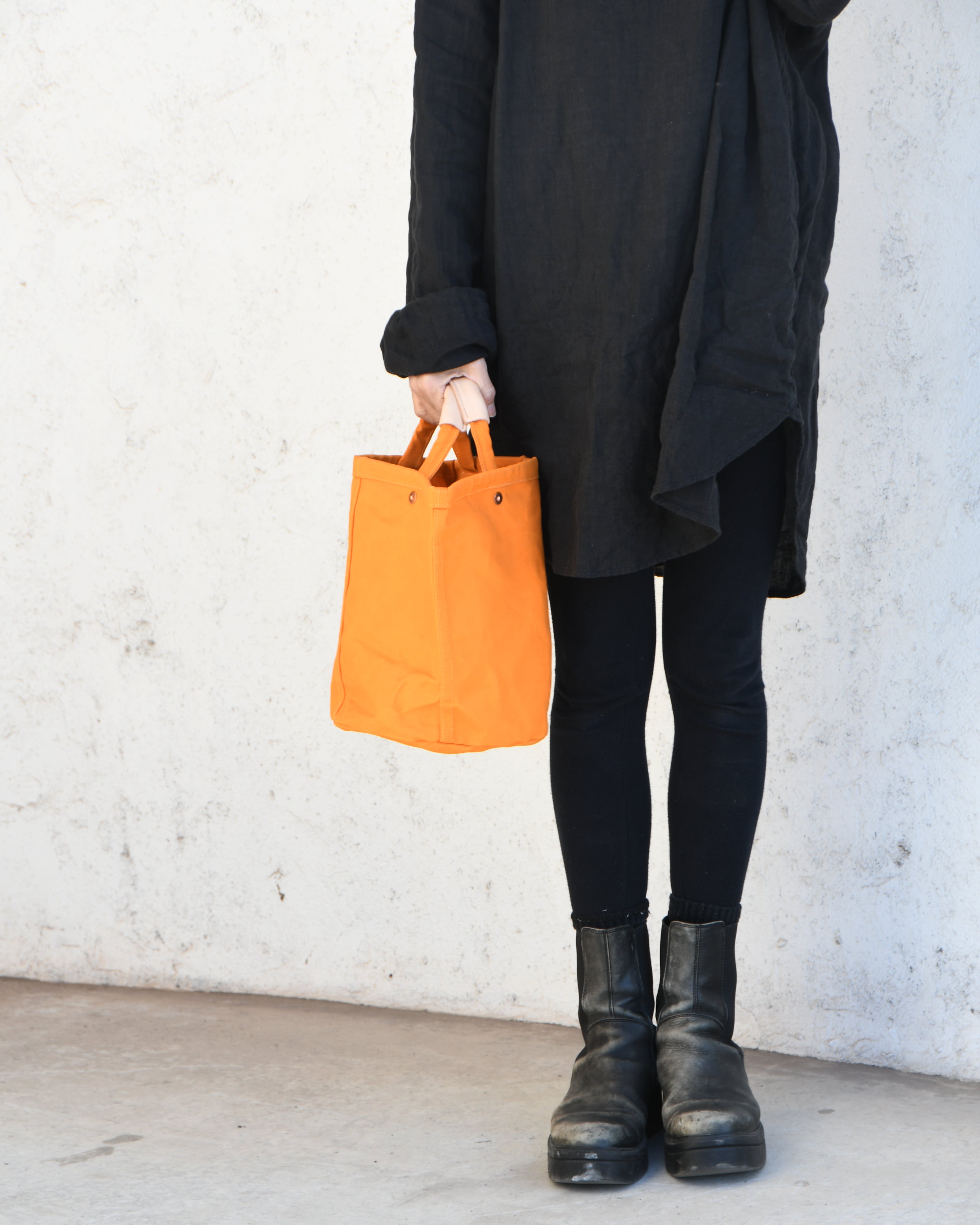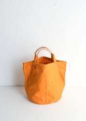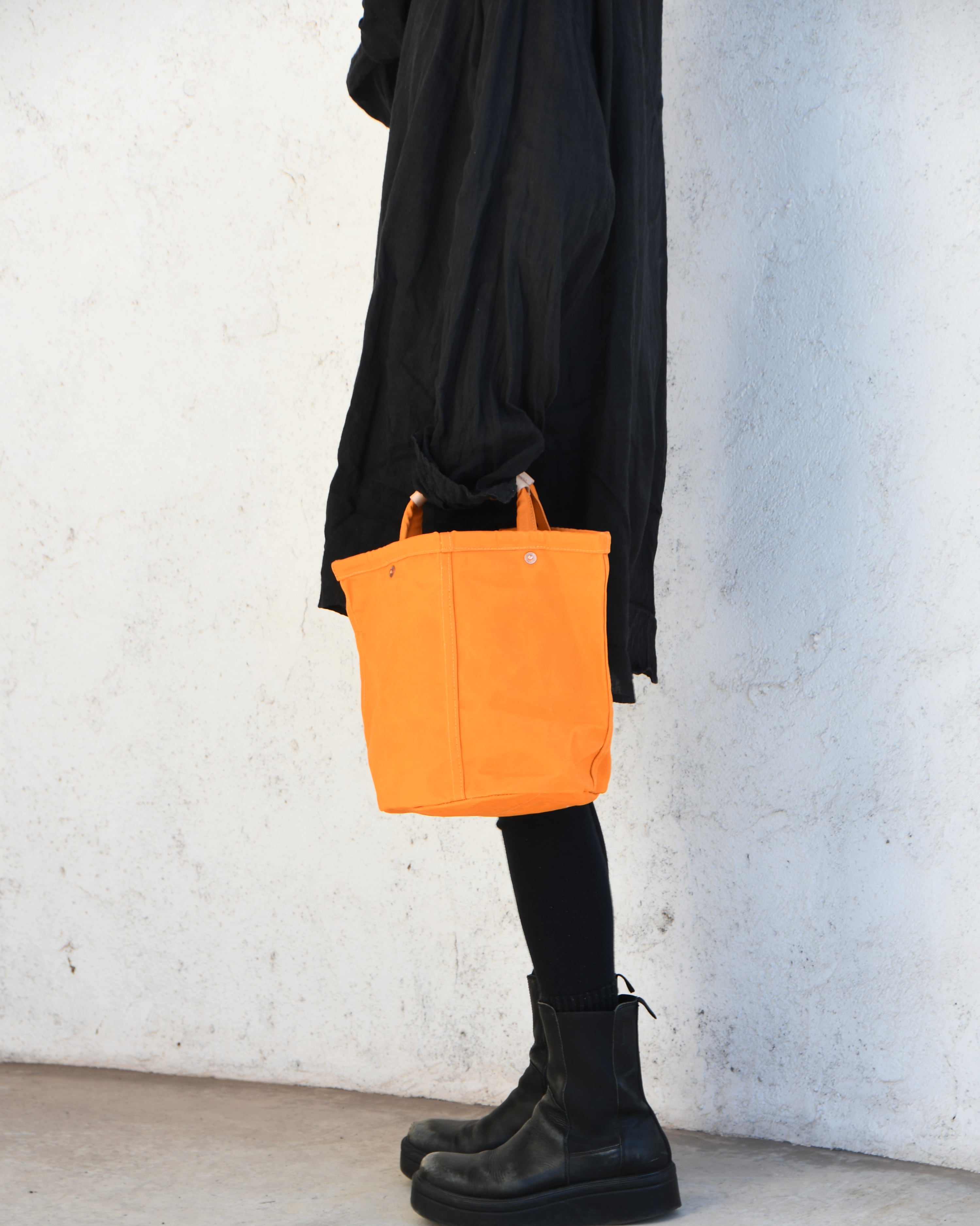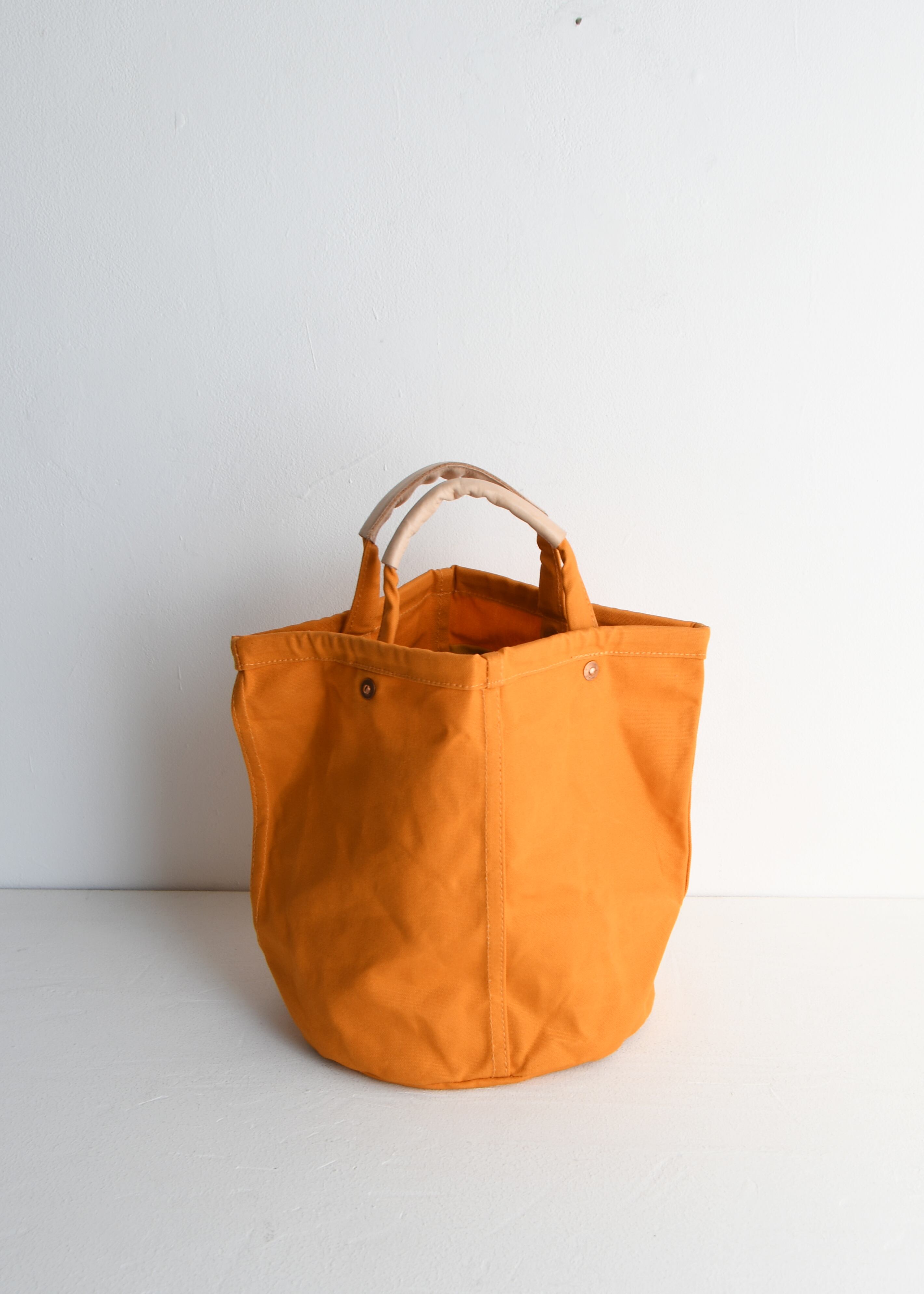 帆布は国内産パラフィン防水10号帆布、ショルダーや持ち手を留め付けるのは銅製(カラーによってはアルミ製)の打ち抜きリベット、カシメや留め具等の金具類は真鍮製、口元の芯には4mm厚の牛ヌメ革を使用。