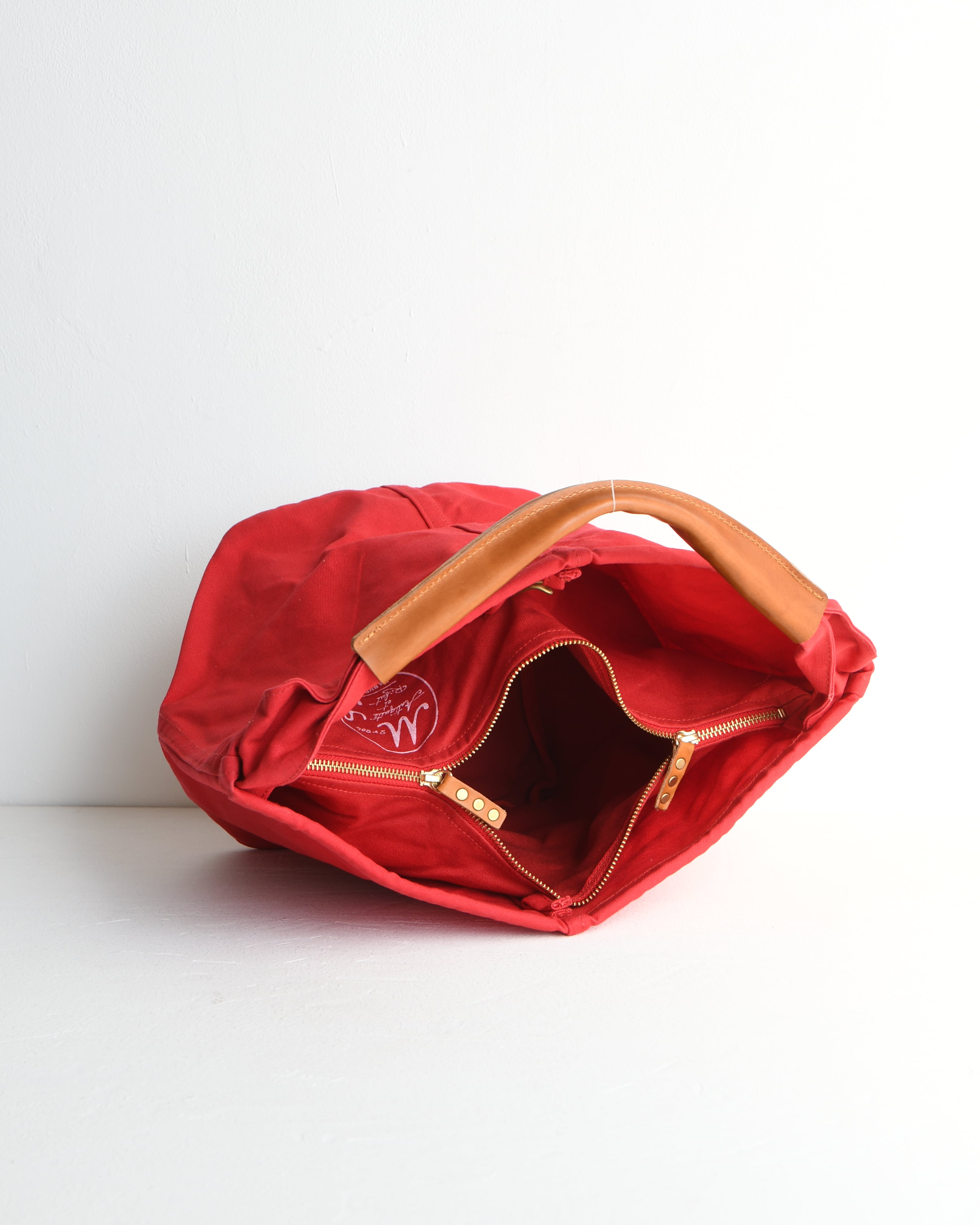 バッグのメインスペースは内袋に付けたファスナーで閉じることが出来、内袋の外側を内ポケットとして使用できます。片面は本体の途中にステッチとカシメで留め付けてあり、もう片面は引っ掛け金具が付いているので、留めれば2つのポケットとして、外せば広めの内ポケットとして使えます。また、ファスナーは開けたままでもバッグ口元には真鍮製の引掛け金具があるので中身が見えにくくなっています。底は2重仕立てとなっており、クロスステッチを施してあります。