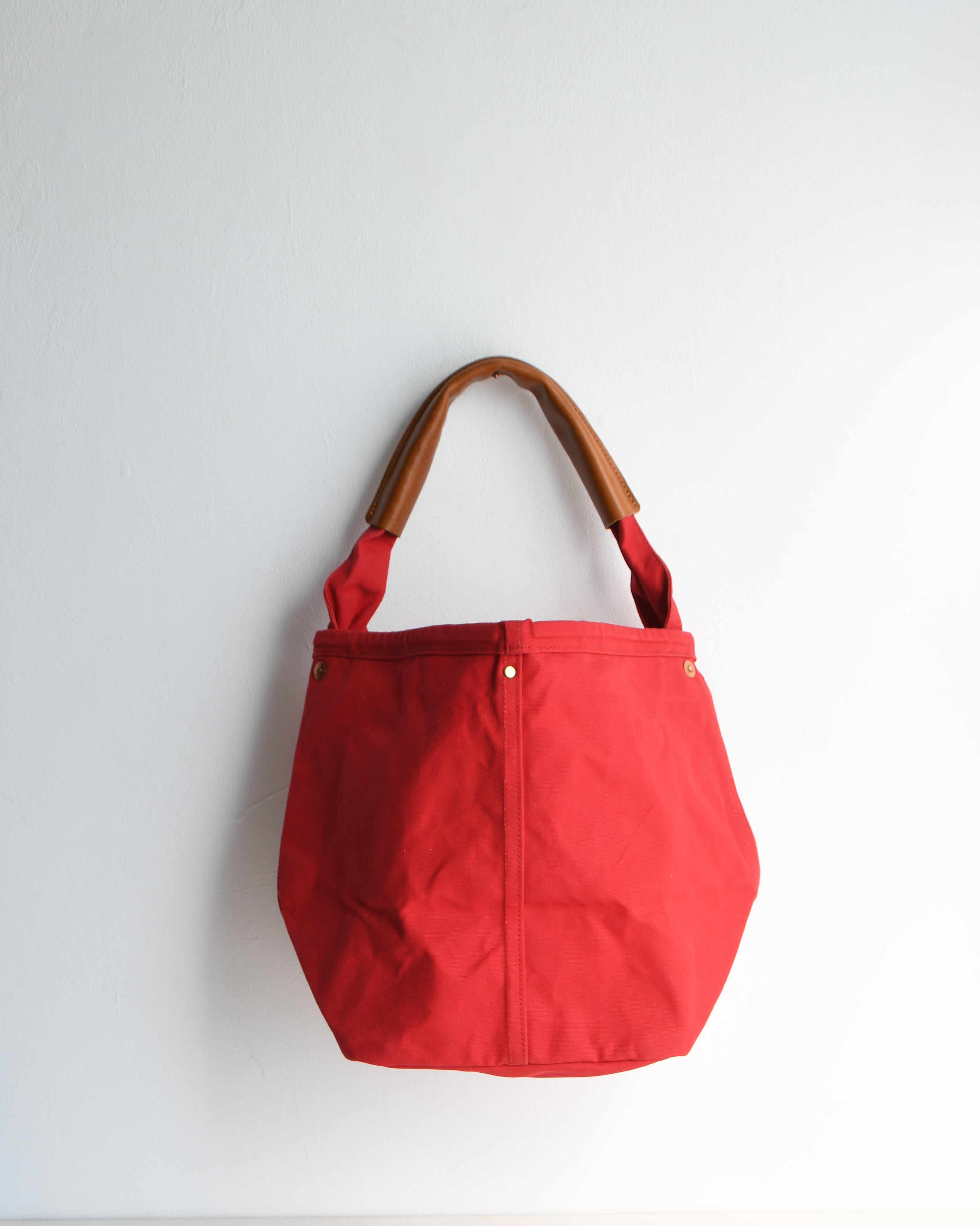 帆布は国内産パラフィン防水10号帆布、ショルダーや持ち手を留め付けるのは銅製(カラーによってはアルミ製)の打ち抜きリベット、カシメや留め具等の金具類は真鍮製、口元の芯には4mm厚の牛ヌメ革を使用。