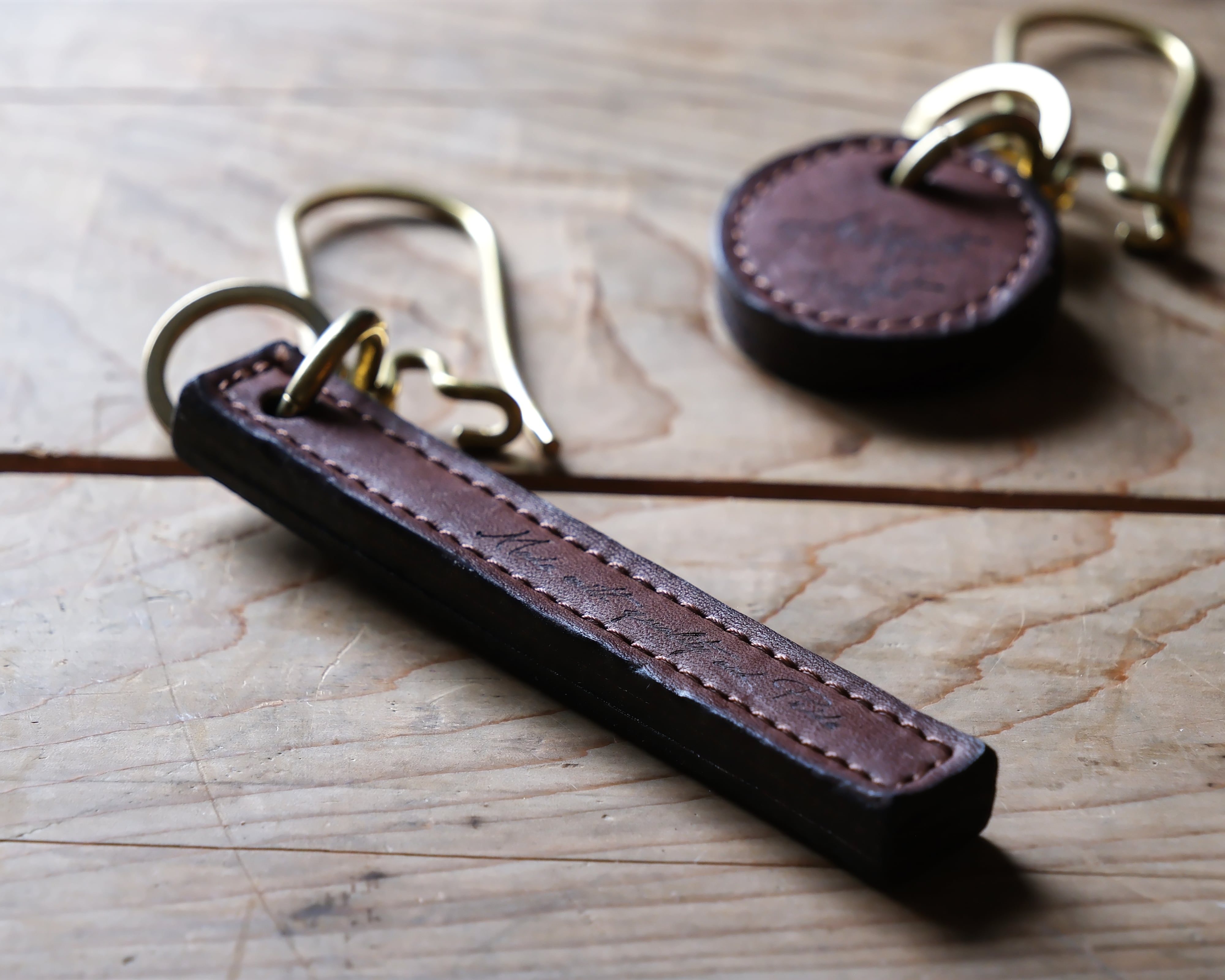 木のスティックの様な風貌がユニークで存在感のあるキーホルダー。革と共に真鍮金具も変化していきますので、ご自分だけの経年変化をお楽しみ下さい。
