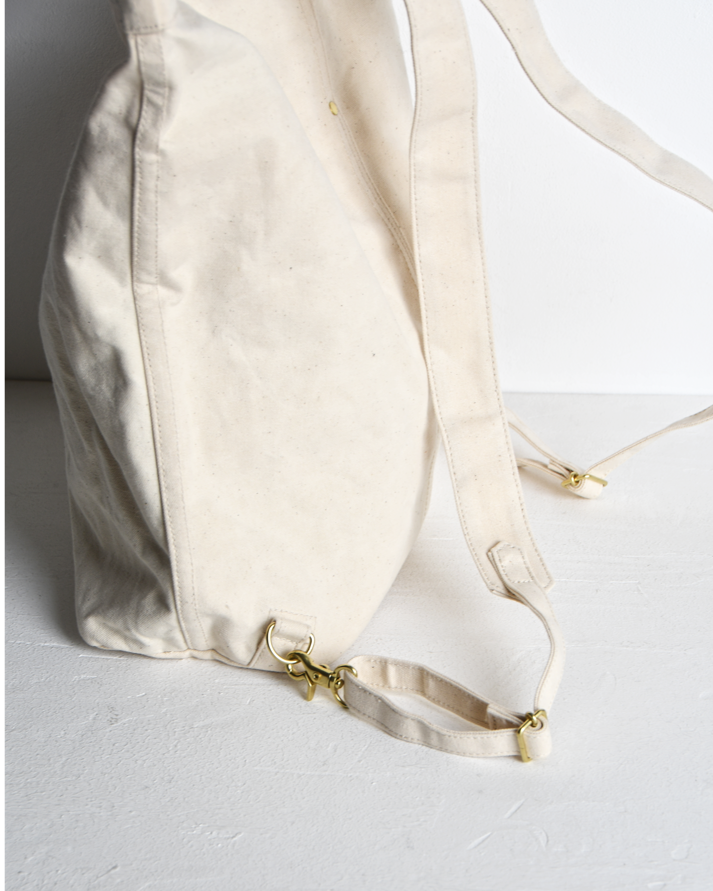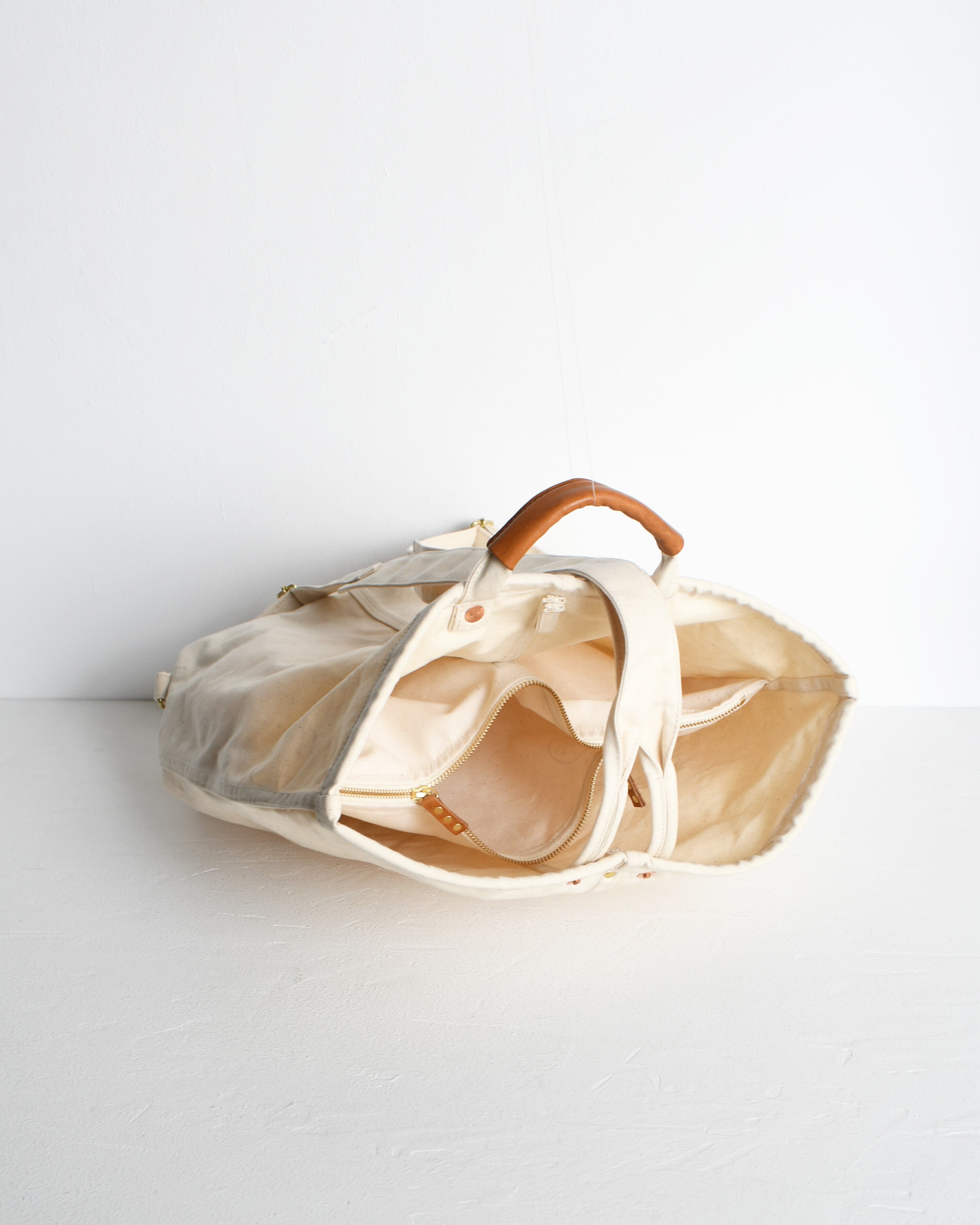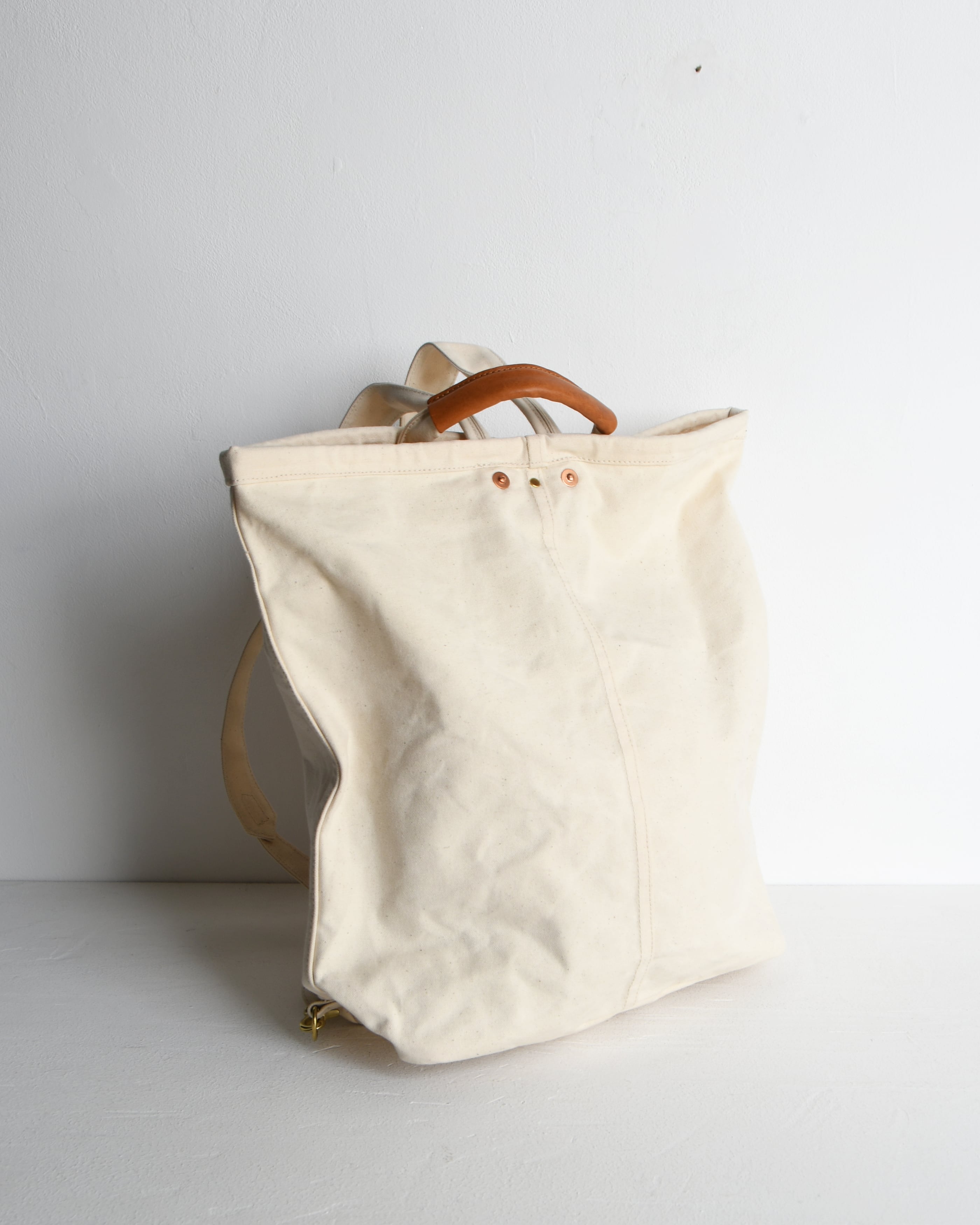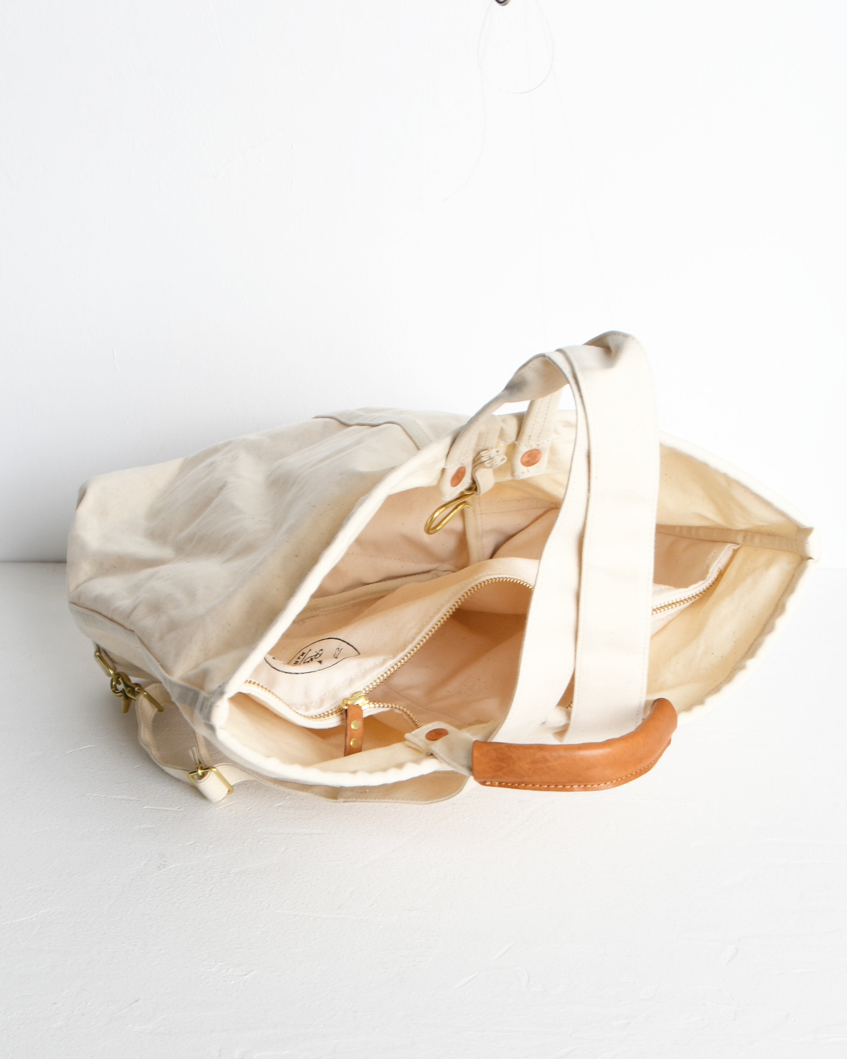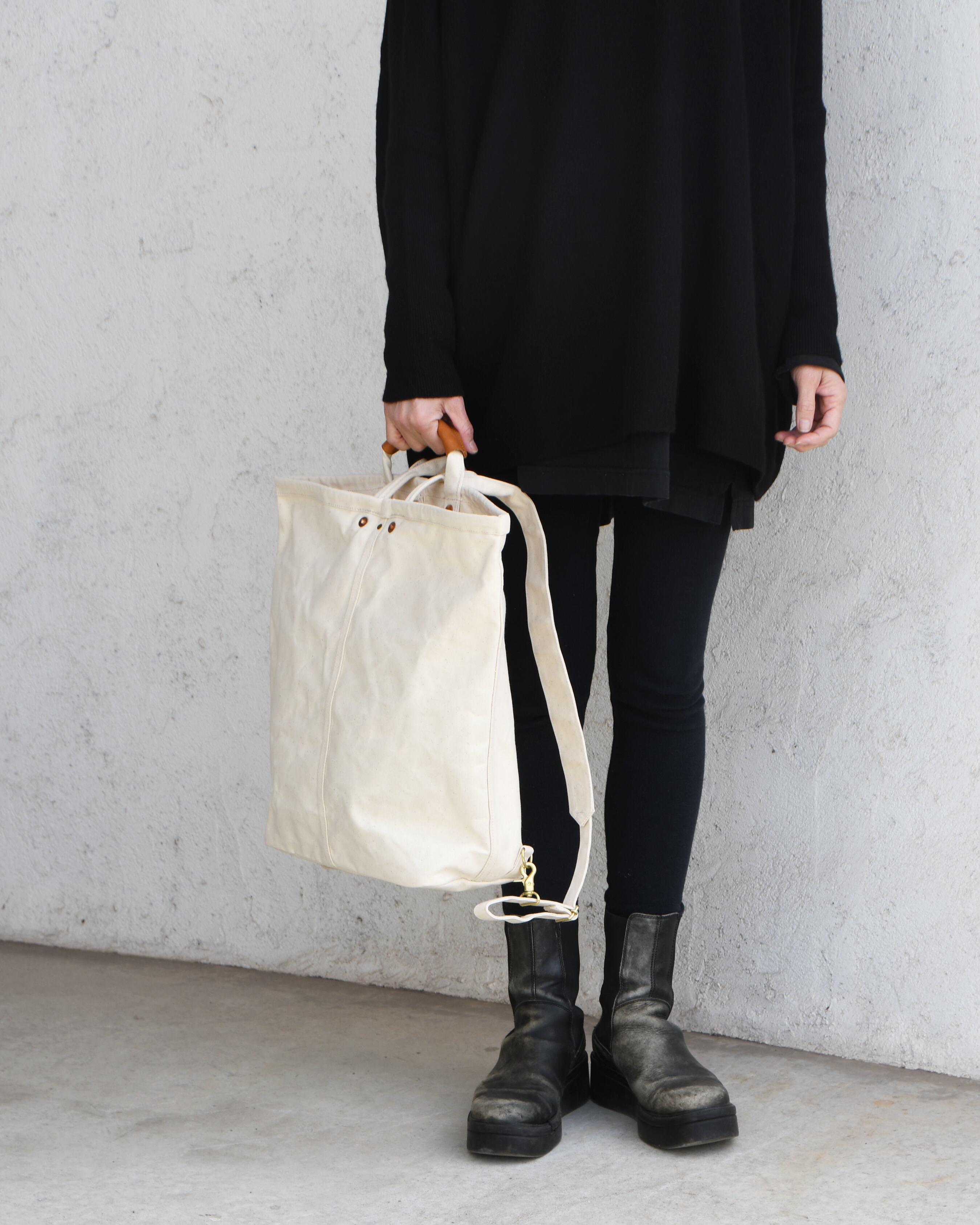 帆布は国内産パラフィン防水10号帆布、ショルダーや持ち手を留め付けるのは銅製(カラーによってはアルミ製)の打ち抜きリベット、カシメや留め具等の金具類は真鍮製、口元の芯には4mm厚の牛ヌメ革を使用。