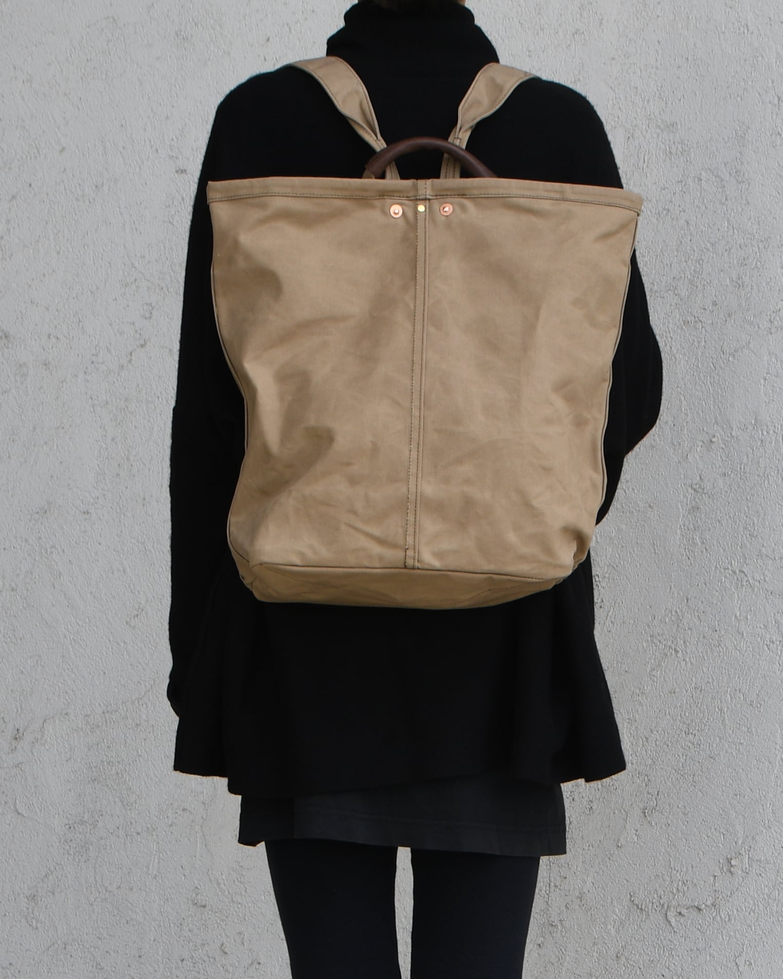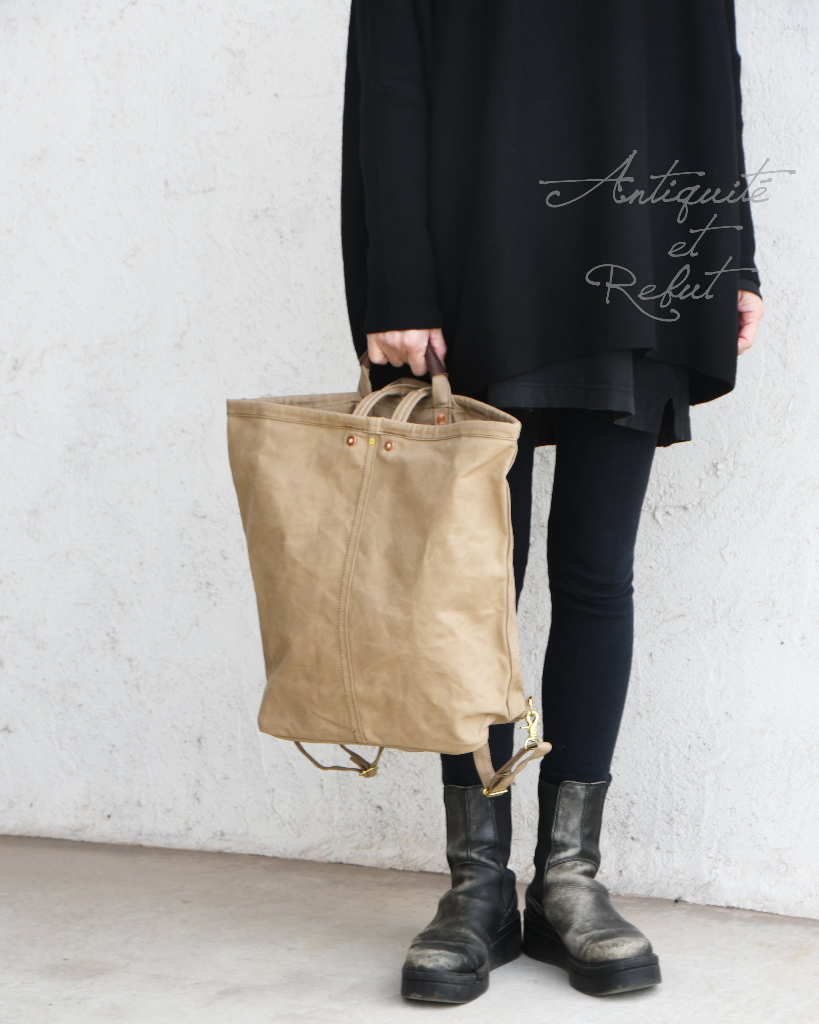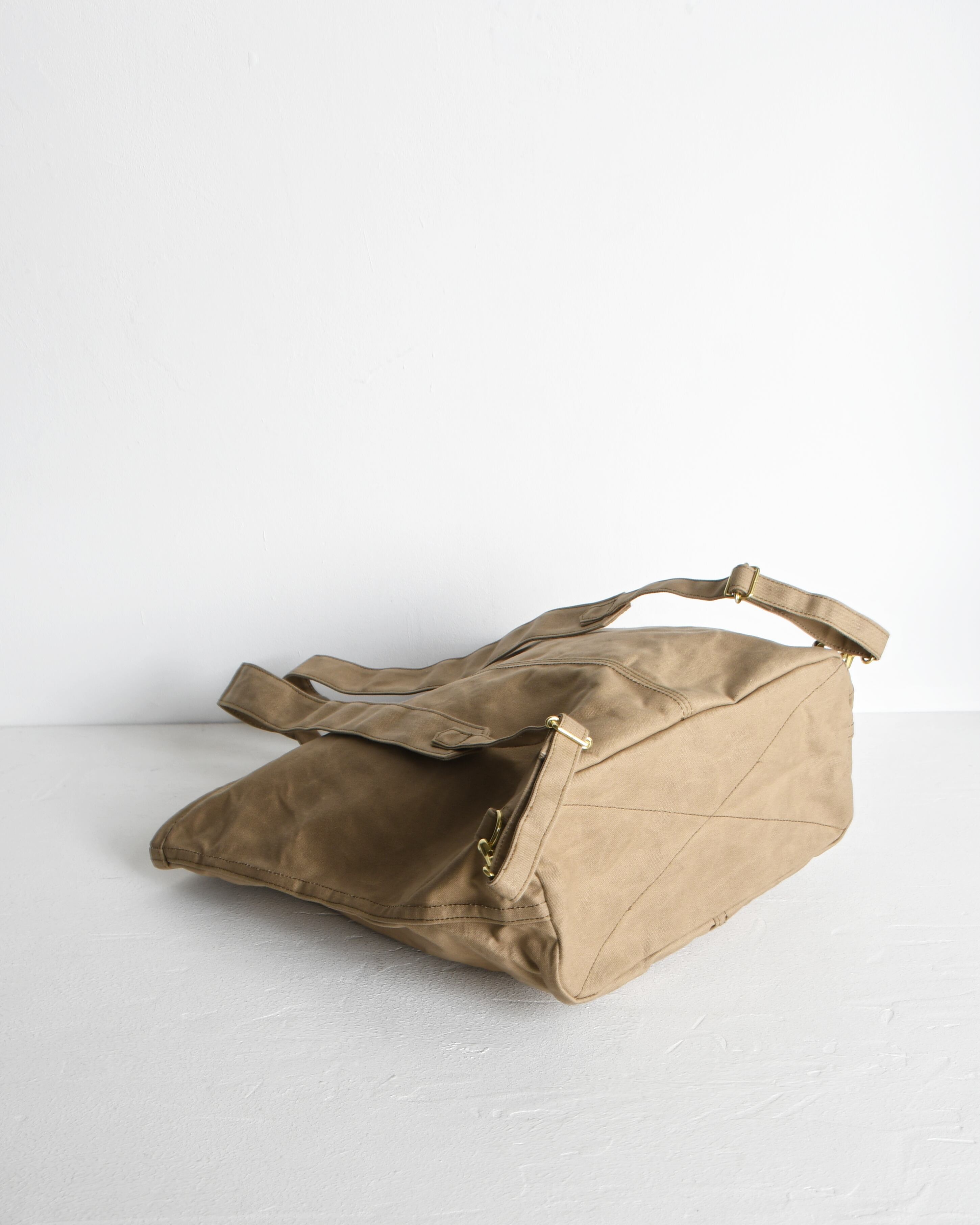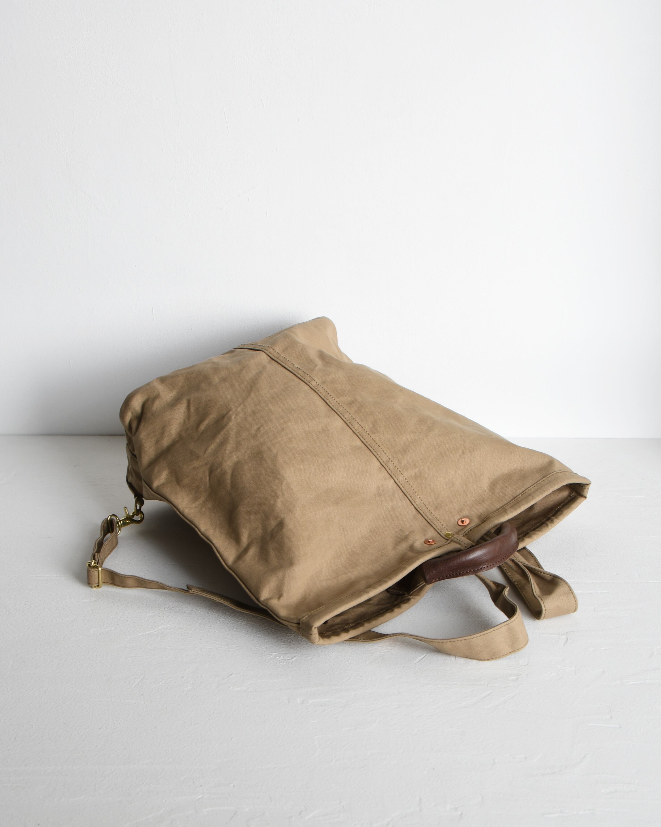 帆布は国内産パラフィン防水10号帆布、ショルダーや持ち手を留め付けるのは銅製(カラーによってはアルミ製)の打ち抜きリベット、カシメや留め具等の金具類は真鍮製、口元の芯には4mm厚の牛ヌメ革を使用。