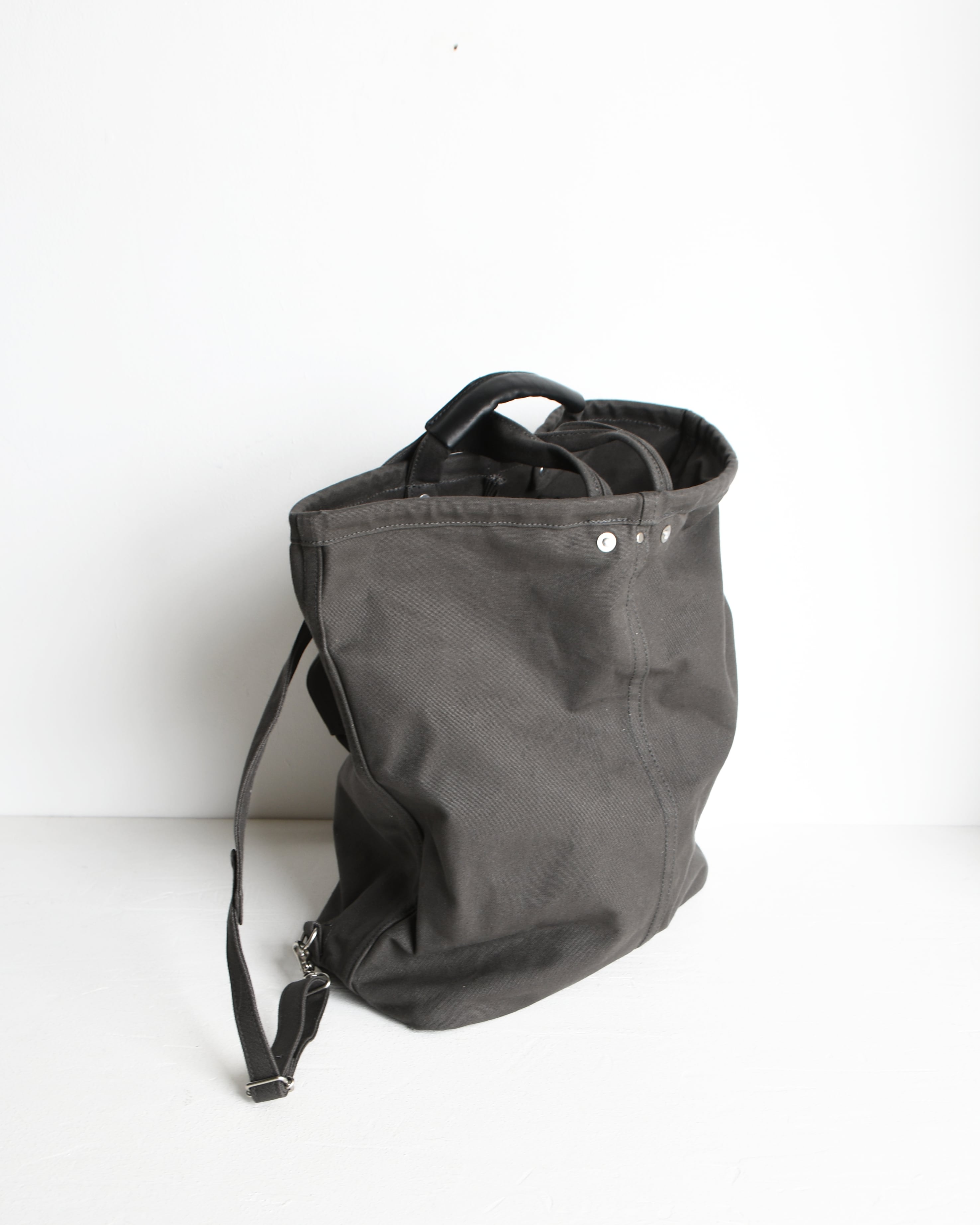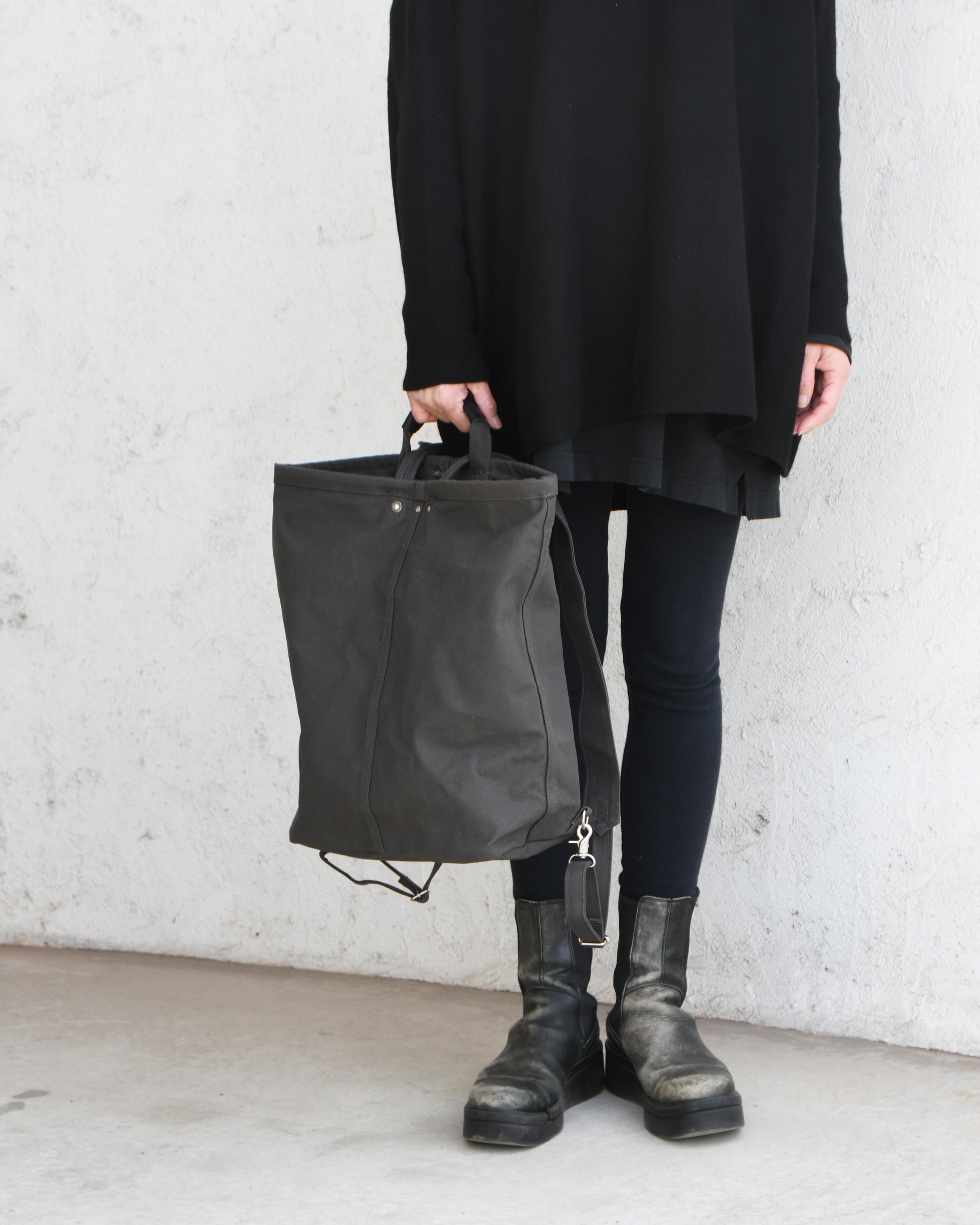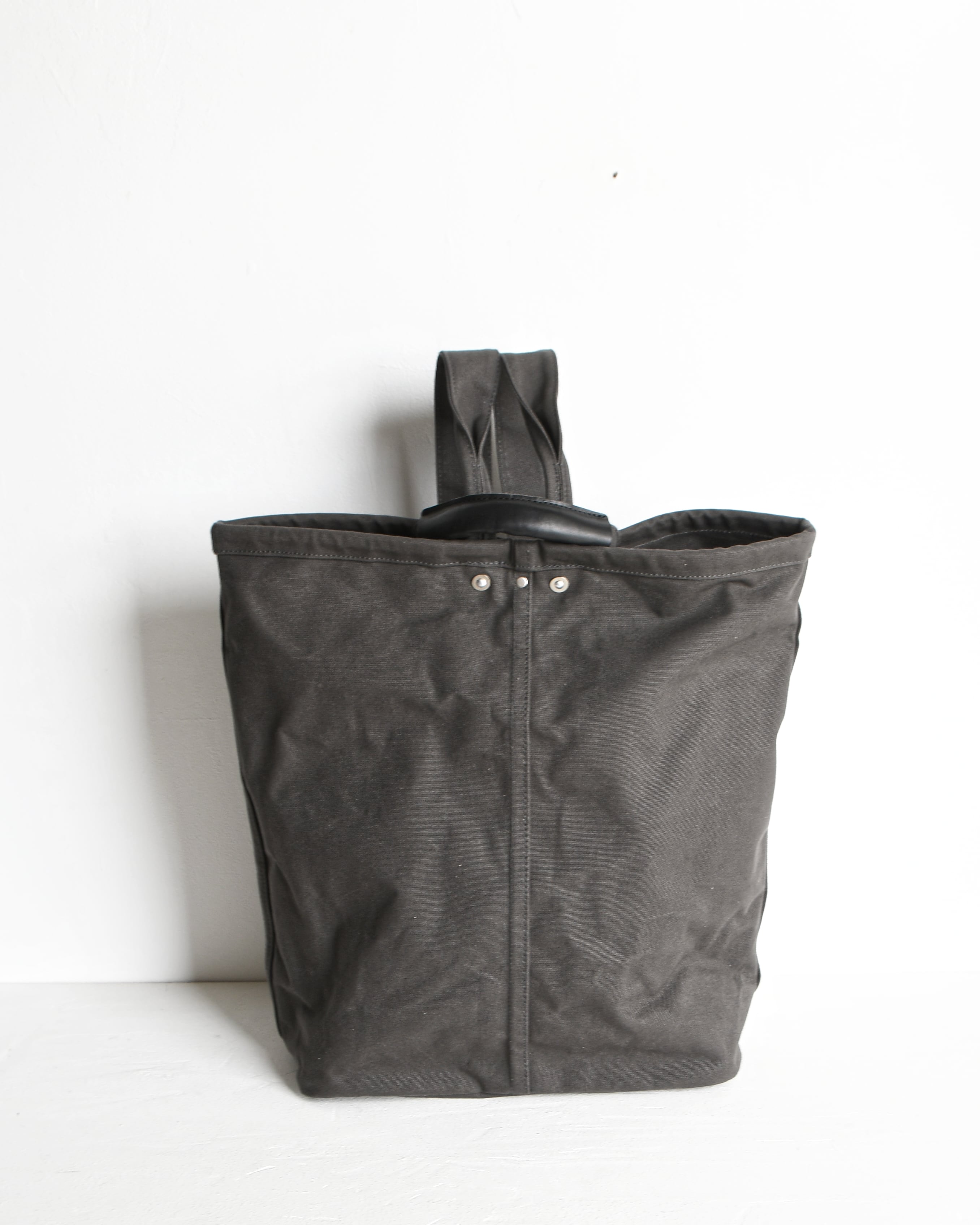 帆布は国内産パラフィン防水10号帆布、ショルダーや持ち手を留め付けるのは銅製(カラーによってはアルミ製)の打ち抜きリベット、カシメや留め具等の金具類は真鍮製、口元の芯には4mm厚の牛ヌメ革を使用。