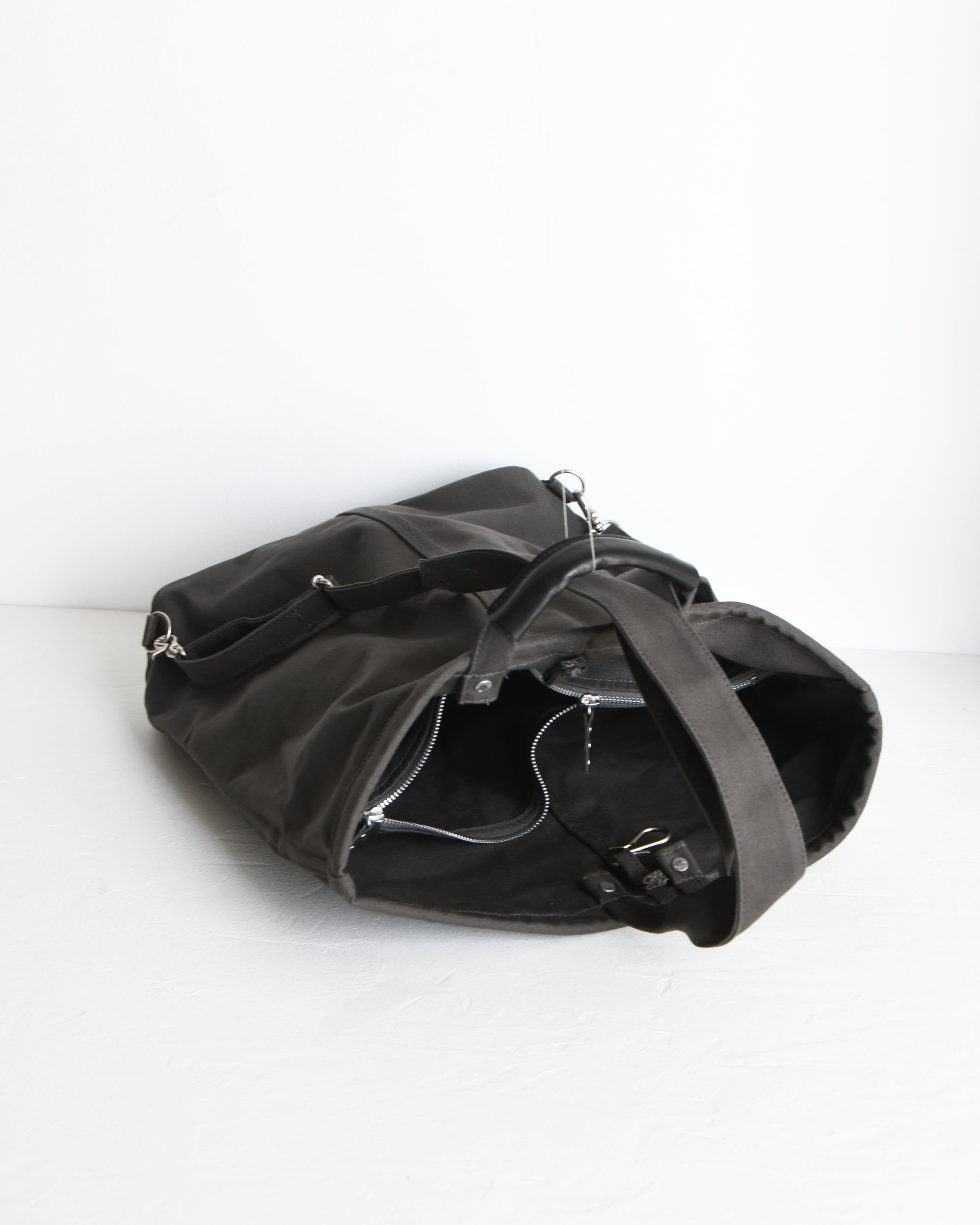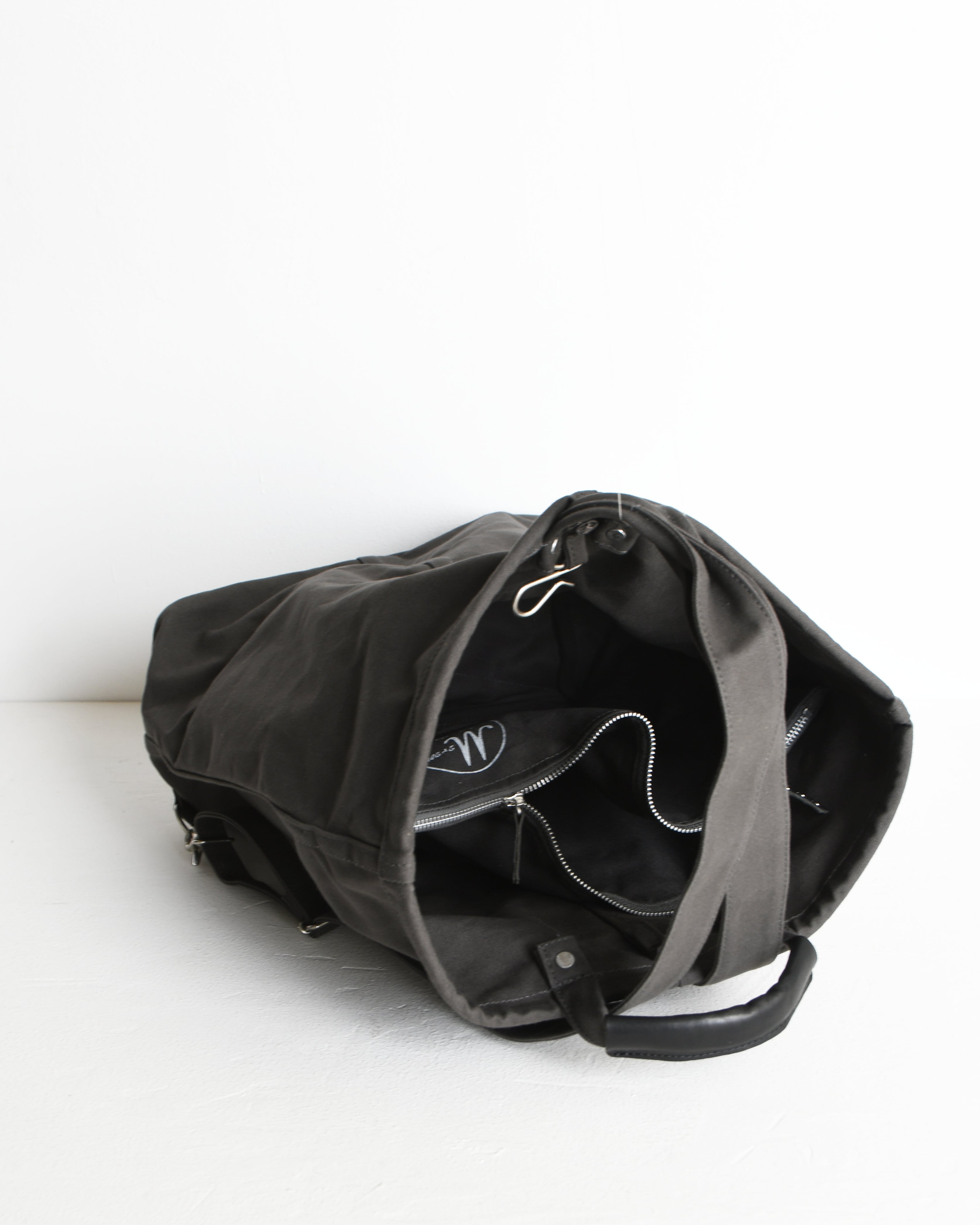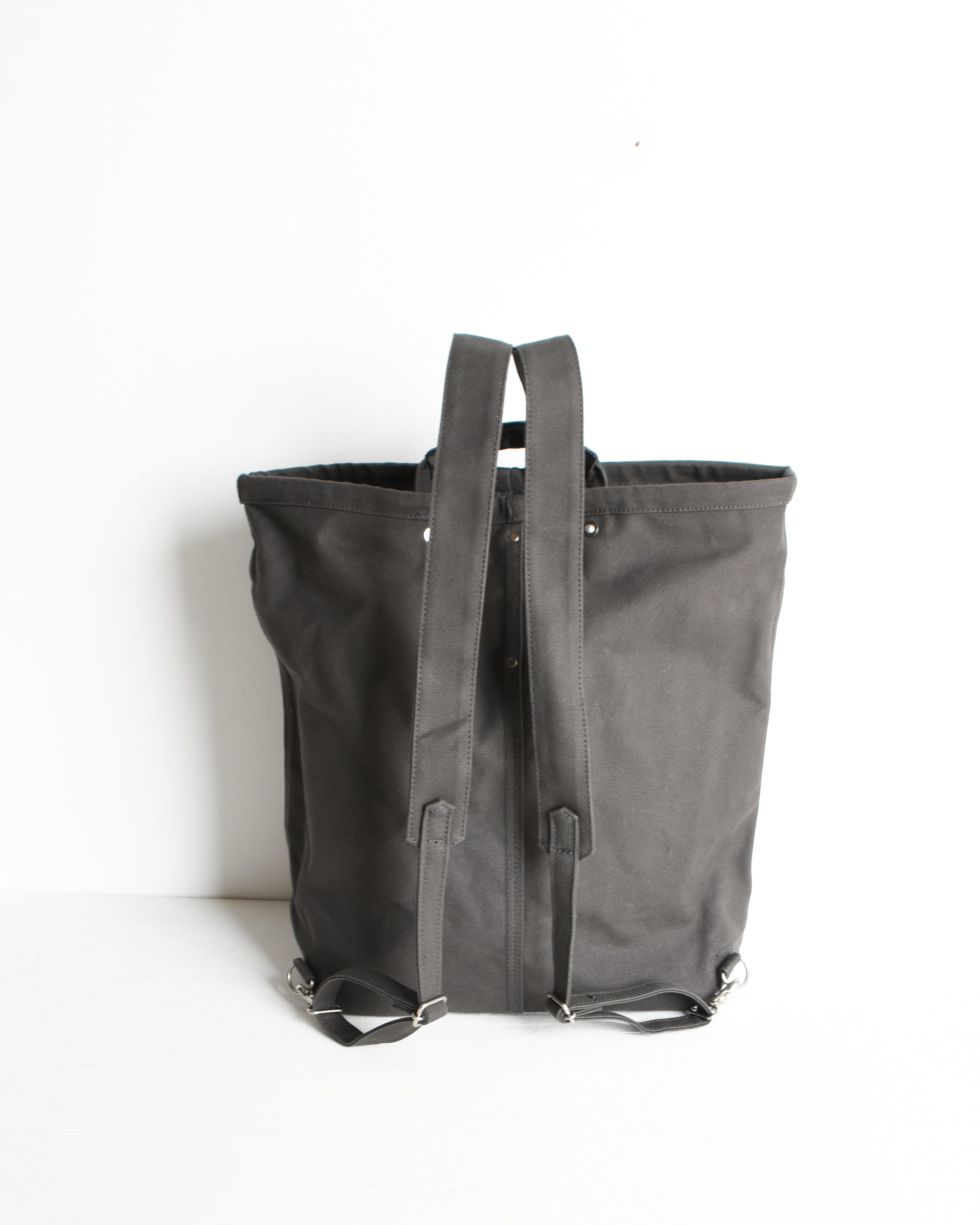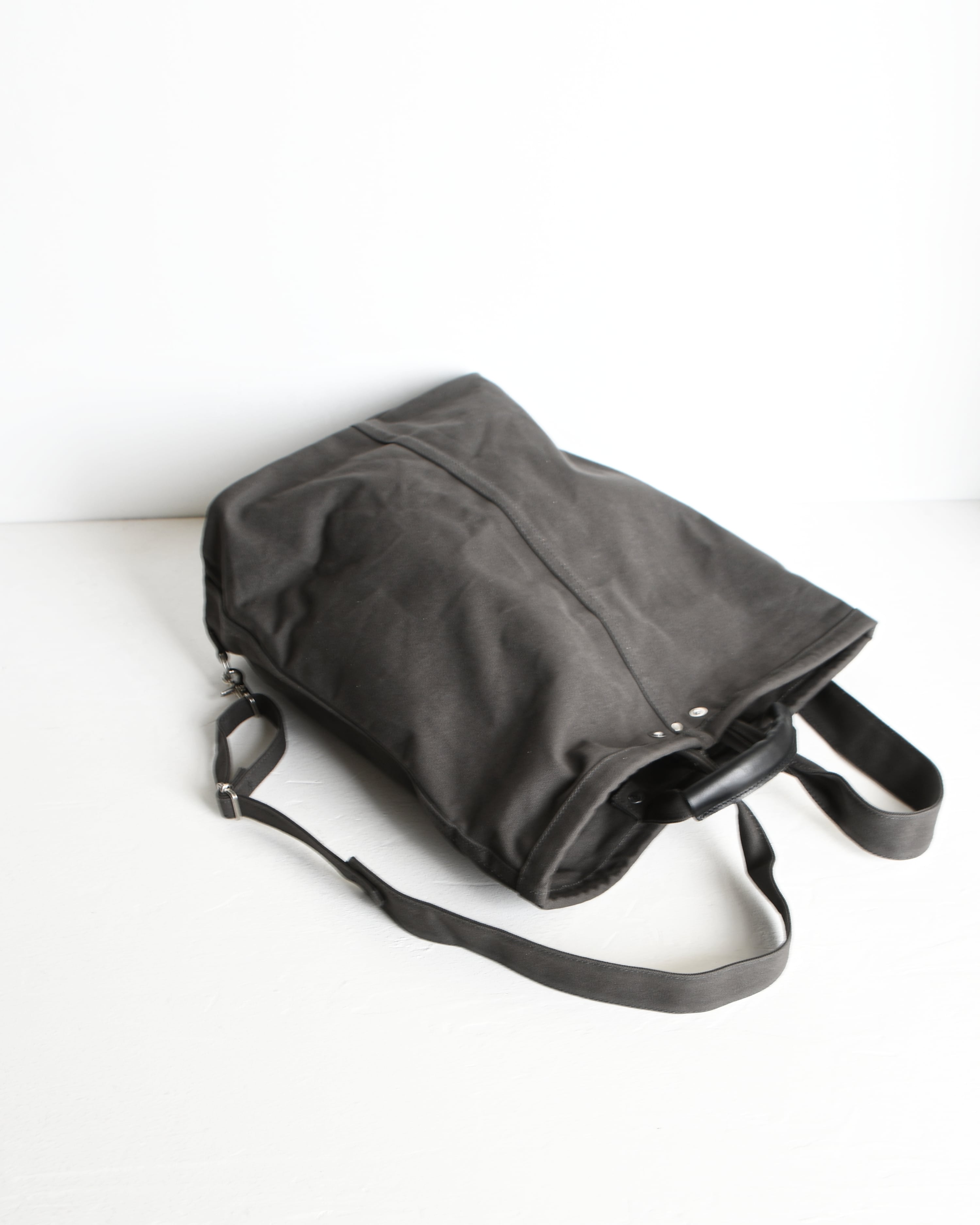 帆布は国内産パラフィン防水10号帆布、ショルダーや持ち手を留め付けるのは銅製(カラーによってはアルミ製)の打ち抜きリベット、カシメや留め具等の金具類は真鍮製、口元の芯には4mm厚の牛ヌメ革を使用。