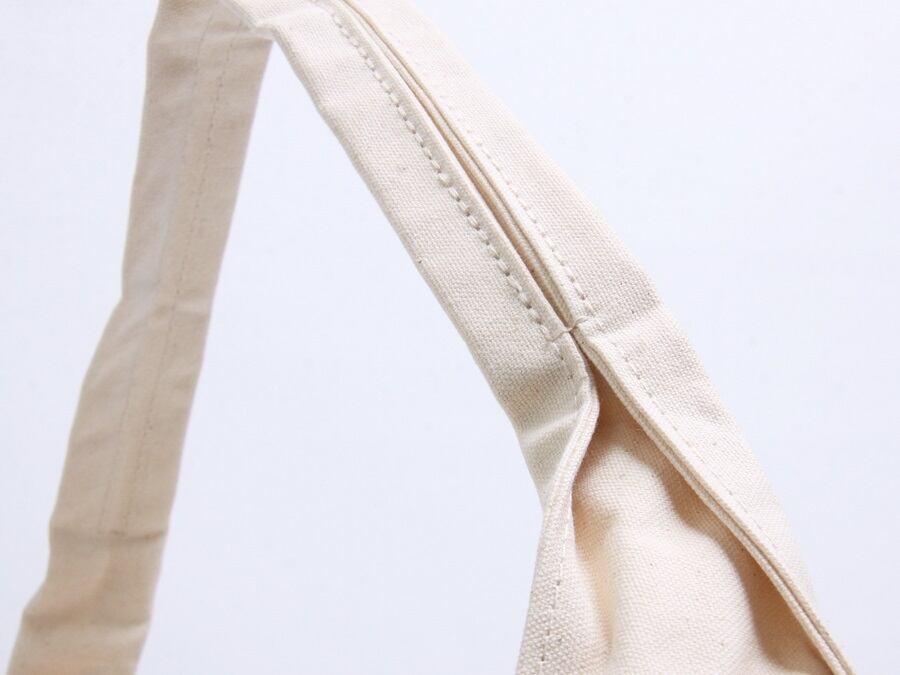 帆布は国内産パラフィン防水10号帆布、ショルダーや持ち手を留め付けるのは銅製(カラーによってはアルミ製)の打ち抜きリベット、カシメや留め具等の金具類は真鍮製、口元の芯には4mm厚の牛ヌメ革を使用。