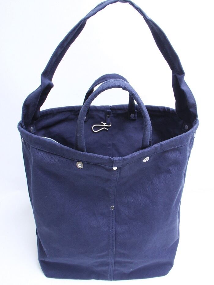 帆布は国内産パラフィン防水10号帆布、ショルダーや持ち手を留め付けるのは銅製(カラーによってはアルミ製)の打ち抜きリベット、カシメや留め具等の金具類は真鍮製、口元の芯には4mm厚の牛ヌメ革を使用。