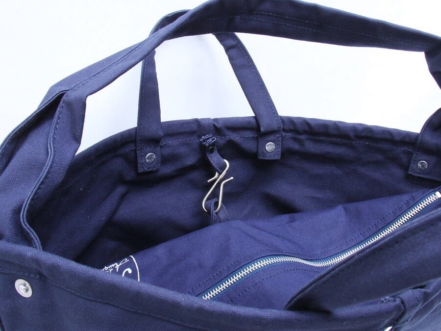 バッグのメインスペースは内袋に付けたファスナーで閉じることが出来、内袋の外側を内ポケットとして使用できます。片面は本体の途中にステッチとカシメで留め付けてあり、もう片面は引っ掛け金具が付いているので、留めれば2つのポケットとして、外せば広めの内ポケットとして使えます。底は2重仕立てとなっており、クロスステッチを施してあります。