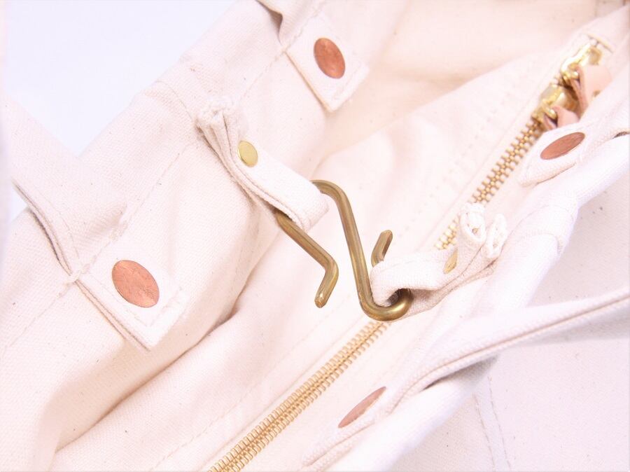 帆布は国内産パラフィン防水10号帆布、ショルダーや持ち手を留め付けるのは銅製(カラーによってはアルミ製)の打ち抜きリベット、カシメや留め具等の金具類は真鍮製、口元の芯には4mm厚の牛ヌメ革を使用。