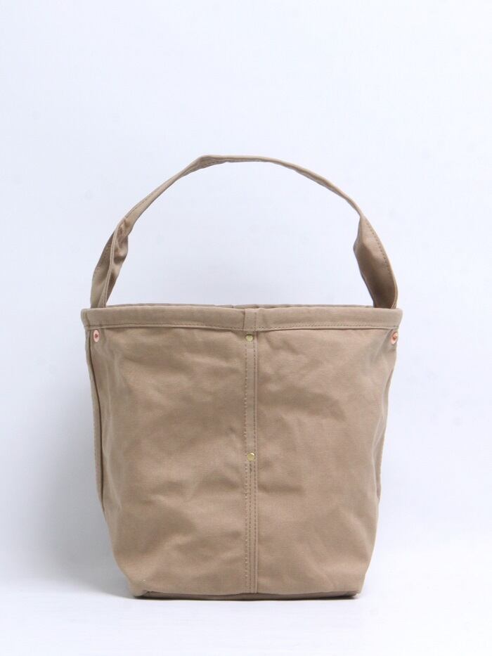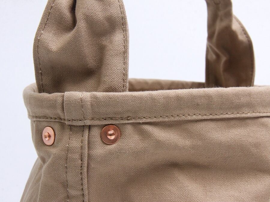 帆布は国内産パラフィン防水10号帆布、ショルダーや持ち手を留め付けるのは銅製(カラーによってはアルミ製)の打ち抜きリベット、カシメや留め具等の金具類は真鍮製、口元の芯には4mm厚の牛ヌメ革を使用。
