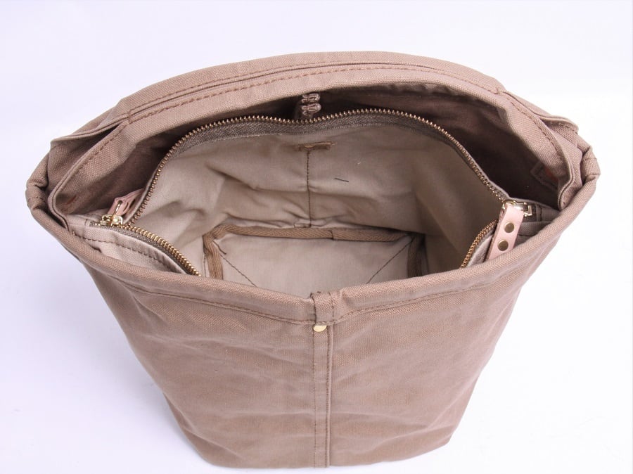 バッグのメインスペースは内袋に付けたファスナーで閉じることが出来、内袋の外側を内ポケットとして使用できます。片面は本体の途中にステッチとカシメで留め付けてあり、もう片面は引っ掛け金具が付いているので、留めれば2つのポケットとして、外せば広めの内ポケットとして使えます。また、ファスナーは開けたままでもバッグ口元には真鍮製の引掛け金具があるので中身が見えにくくなっています。底は2重仕立てとなっており、クロスステッチを施してあります。