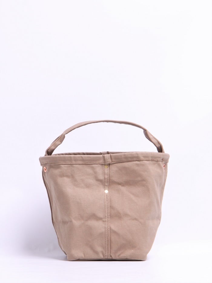 帆布は国内産パラフィン防水10号帆布、ショルダーや持ち手を留め付けるのは銅製(カラーによってはアルミ製)の打ち抜きリベット、カシメや留め具等の金具類は真鍮製、口元の芯には4mm厚の牛ヌメ革を使用。