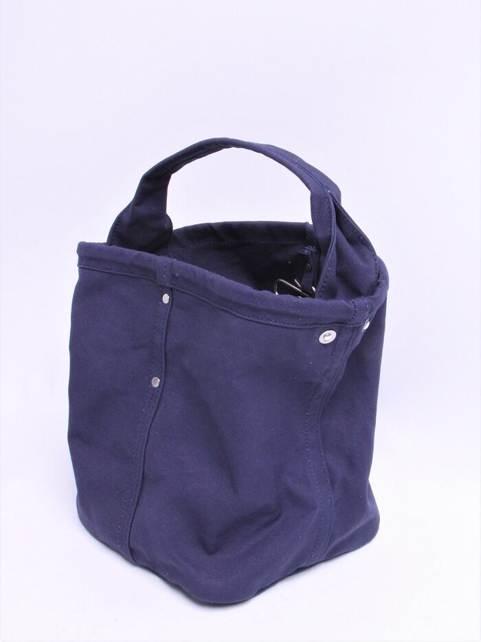 帆布は国内産パラフィン防水10号帆布、ショルダーや持ち手を留め付けるのは銅製(カラーによってはアルミ製)の打ち抜きリベット、カシメや留め具等の金具類は真鍮製、口元の芯には4mm厚の牛ヌメ革を使用。