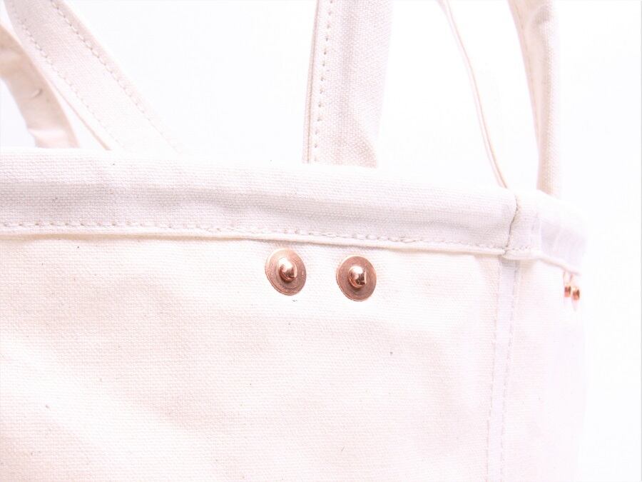 帆布は国内産パラフィン防水10号帆布、ショルダーや持ち手を留め付けるのは銅製(カラーによってはアルミ製)の打ち抜きリベット、カシメや留め具等の金具類は真鍮製、口元の芯には4mm厚の牛ヌメ革を使用。