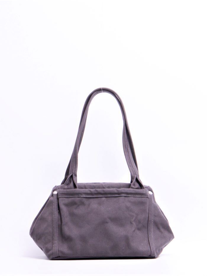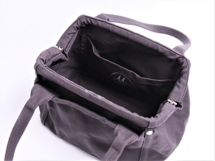 帆布は国内産パラフィン防水10号帆布、ショルダーや持ち手を留め付けるのは銅製(カラーによってはアルミ製)の打ち抜きリベット、カシメや留め具等の金具類は真鍮製を使用。