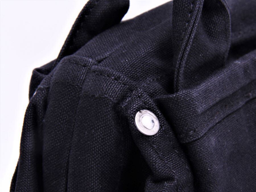 帆布は国内産パラフィン防水10号帆布、ショルダーや持ち手を留め付けるのは銅製(カラーによってはアルミ製)の打ち抜きリベット、カシメや留め具等の金具類は真鍮製を使用。