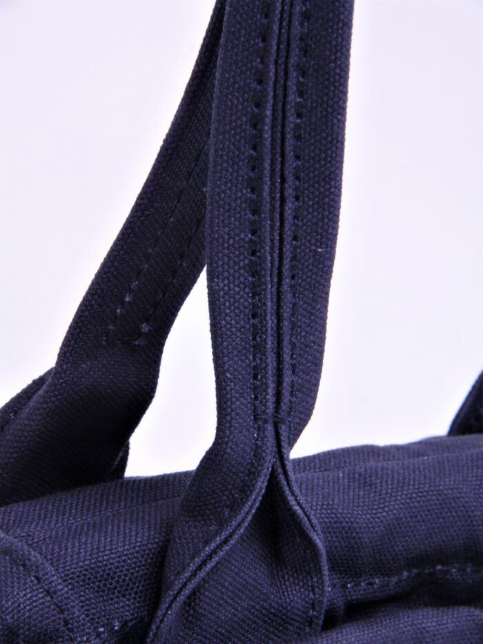 帆布は国内産パラフィン防水10号帆布、ショルダーや持ち手を留め付けるのは銅製(カラーによってはアルミ製)の打ち抜きリベット、カシメや留め具等の金具類は真鍮製を使用。