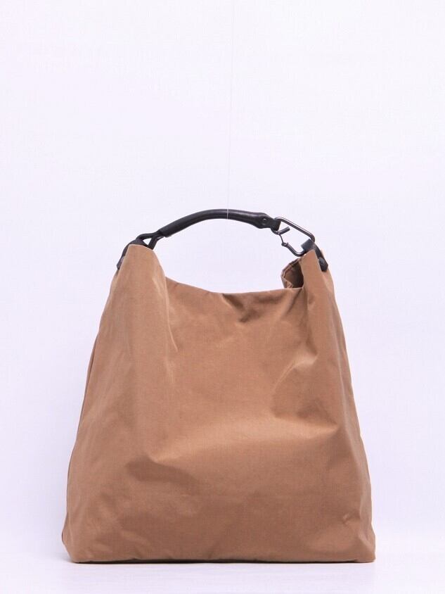 本体に、タスラン加工糸を使用して織ったナイロン生地に塩縮加工を施したシュリンクナイロン、ショルダーや持ち手には3.5mm厚の植物タンニンなめし牛ヌメ革を使用。