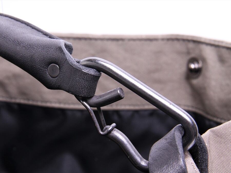 本体に、タスラン加工糸を使用して織ったナイロン生地に塩縮加工を施したシュリンクナイロン、ショルダーや持ち手には3.5mm厚の植物タンニンなめし牛ヌメ革を使用。