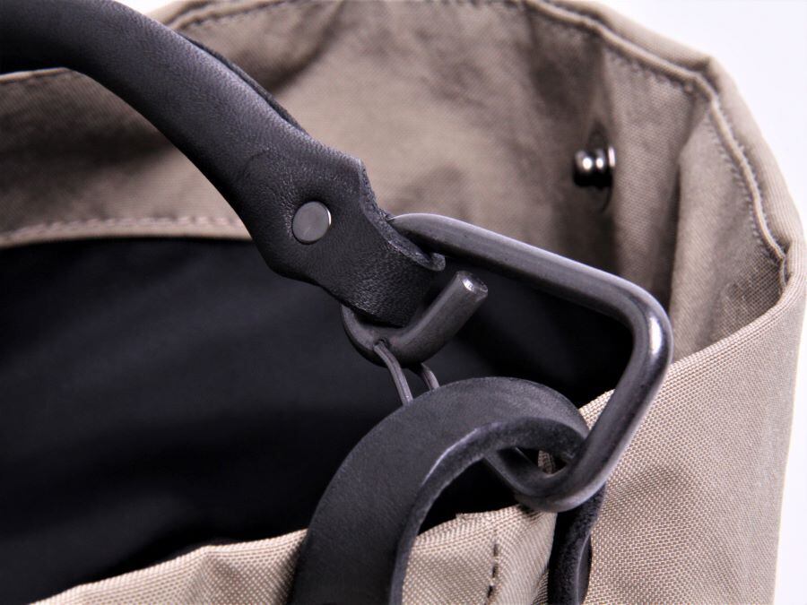 本体に、タスラン加工糸を使用して織ったナイロン生地に塩縮加工を施したシュリンクナイロン、ショルダーや持ち手には3.5mm厚の植物タンニンなめし牛ヌメ革を使用。