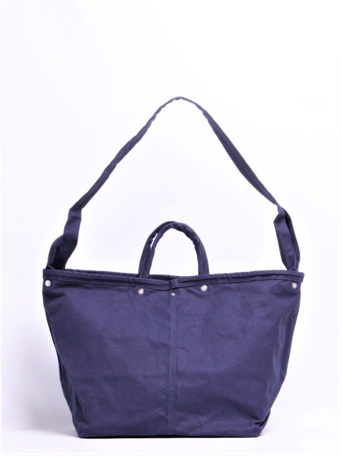 帆布は国内産パラフィン防水10号帆布、ショルダーや持ち手を留め付けるのは銅製(カラーによってはアルミ製)の打ち抜きリベット、カシメや留め具等の金具類は真鍮製、口元の芯には4mm厚の牛ヌメ革を使用。