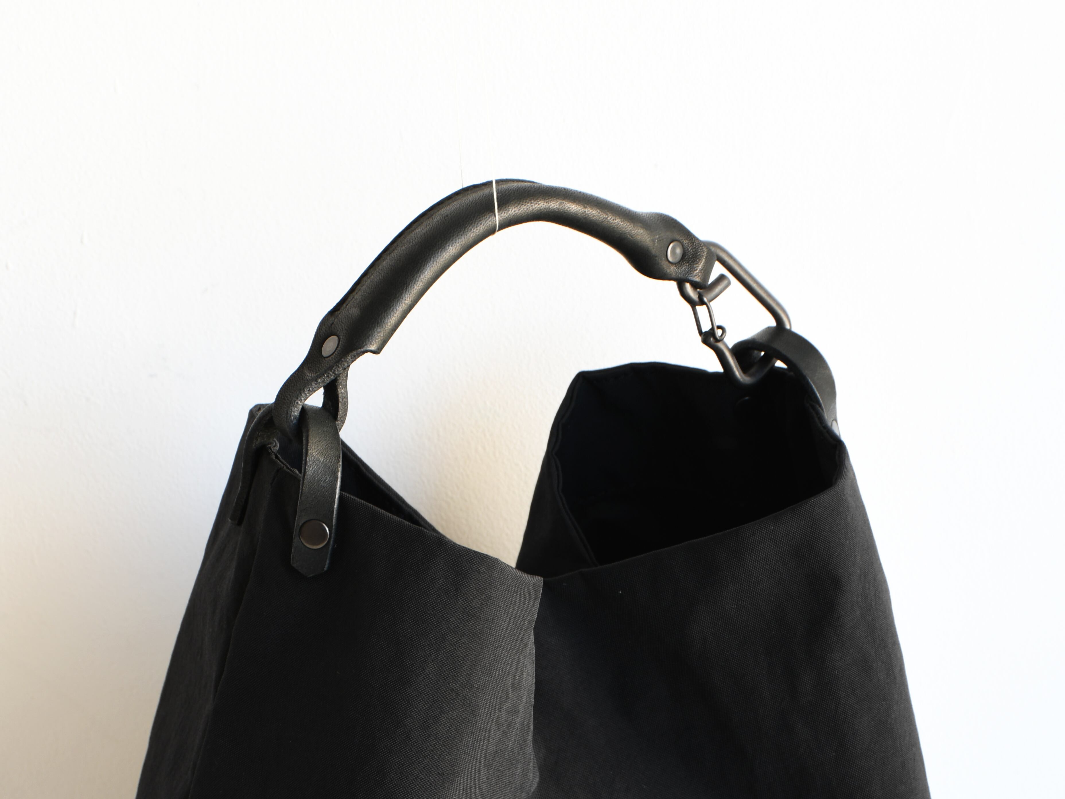 本体に、タスラン加工糸を使用して織ったナイロン生地に塩縮加工を施したシュリンクナイロン、ショルダーや持ち手には3.5mm厚の植物タンニンなめし牛ヌメ革を使用。