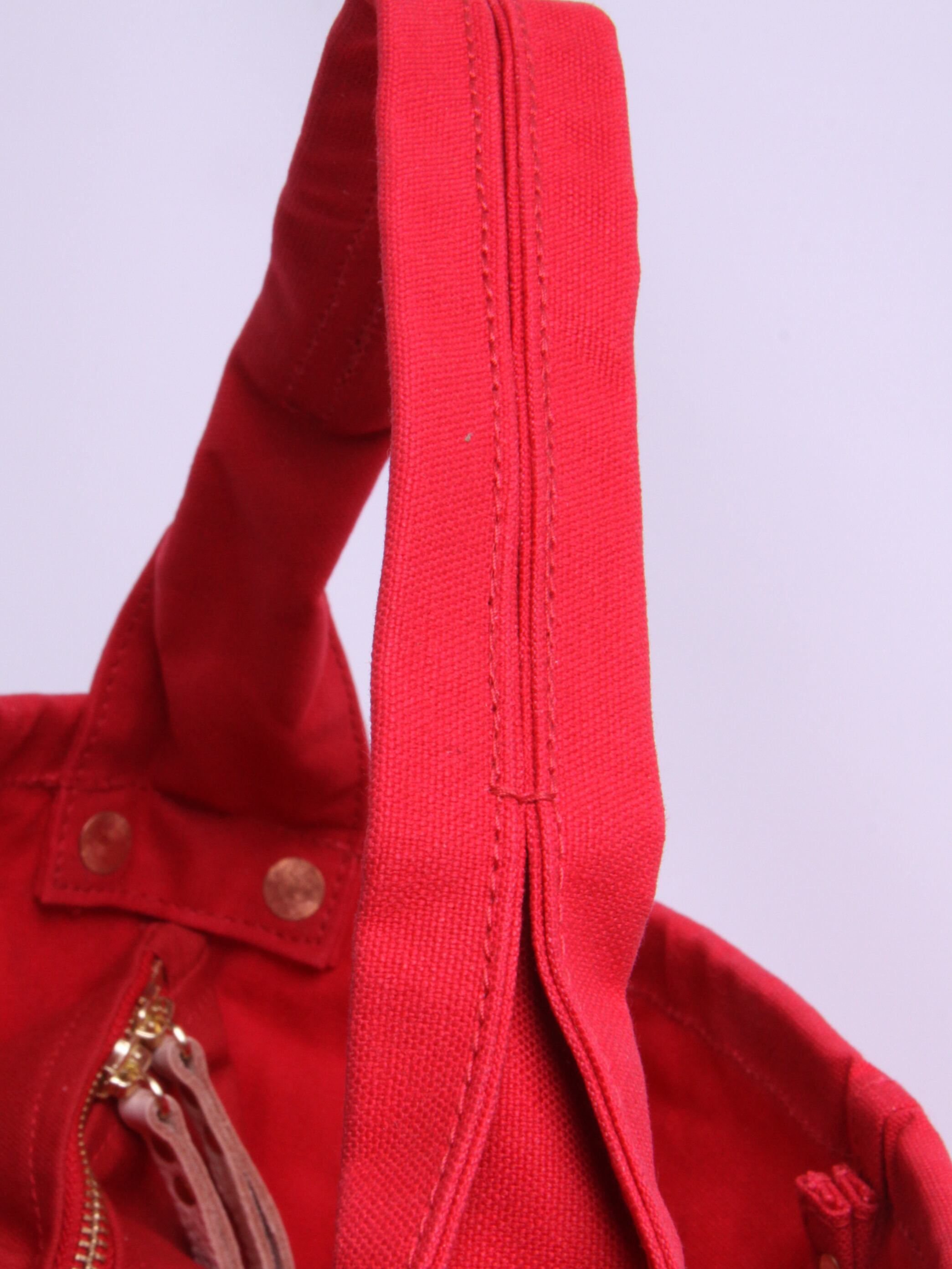 帆布は国内産パラフィン防水10号帆布、ショルダーや持ち手を留め付けるのは銅製(カラーによってはアルミ製)の打ち抜きリベット、カシメや留め具等の金具類は真鍮製、口元の芯には4mm厚の牛ヌメ革を使用。