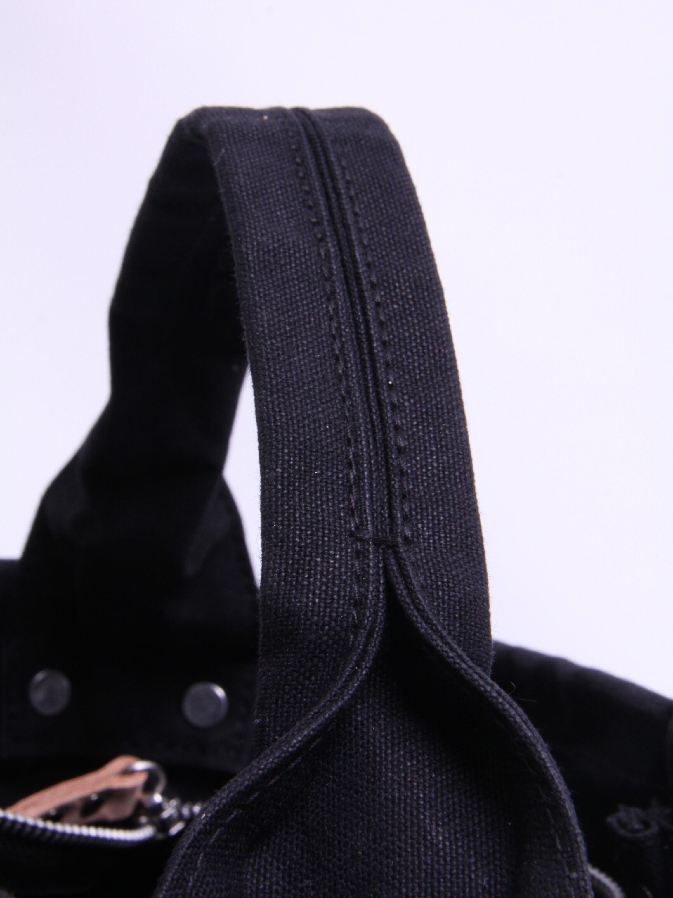 帆布は国内産パラフィン防水10号帆布、ショルダーや持ち手を留め付けるのは銅製(カラーによってはアルミ製)の打ち抜きリベット、カシメや留め具等の金具類は真鍮製、口元の芯には4mm厚の牛ヌメ革を使用。