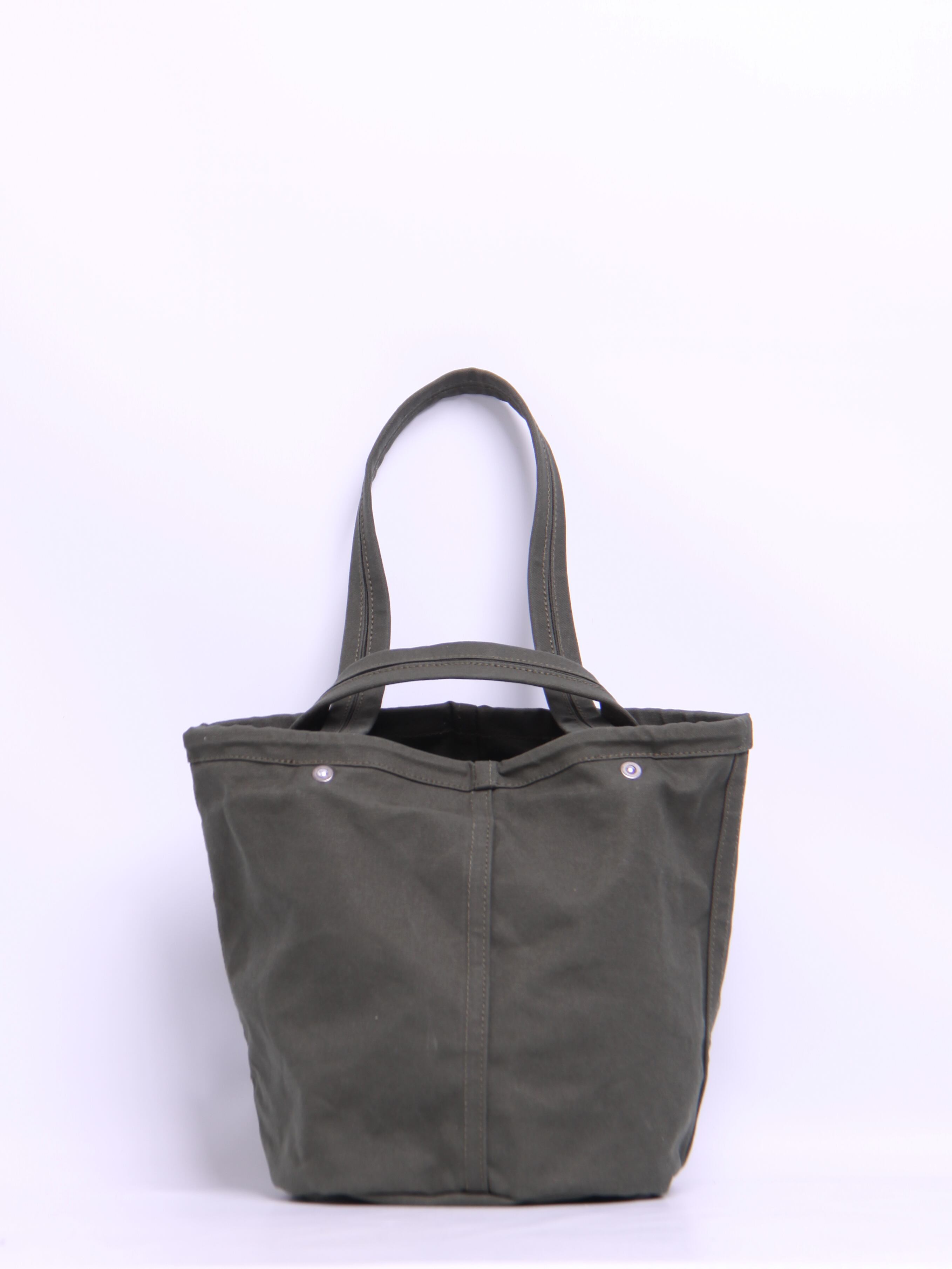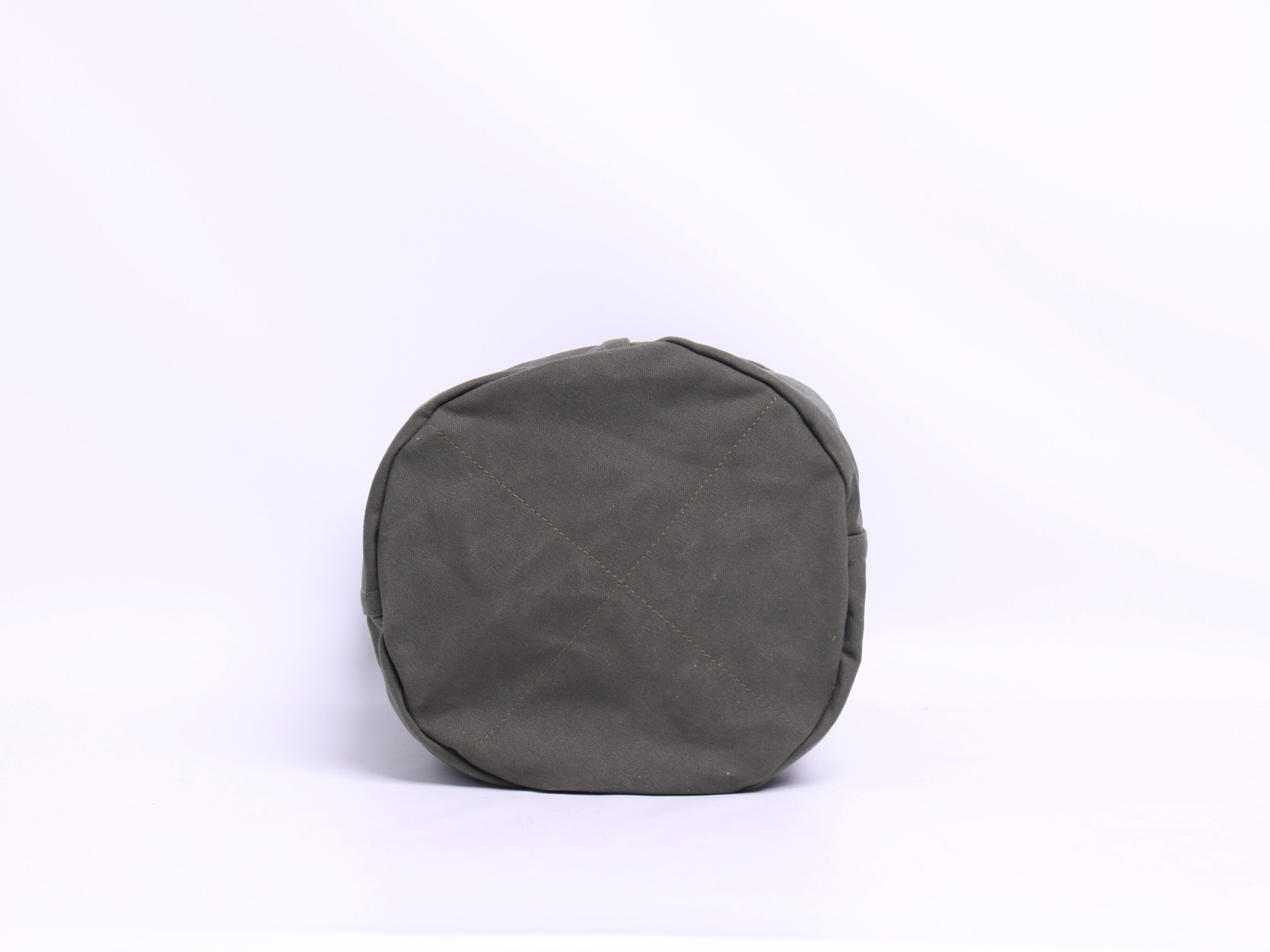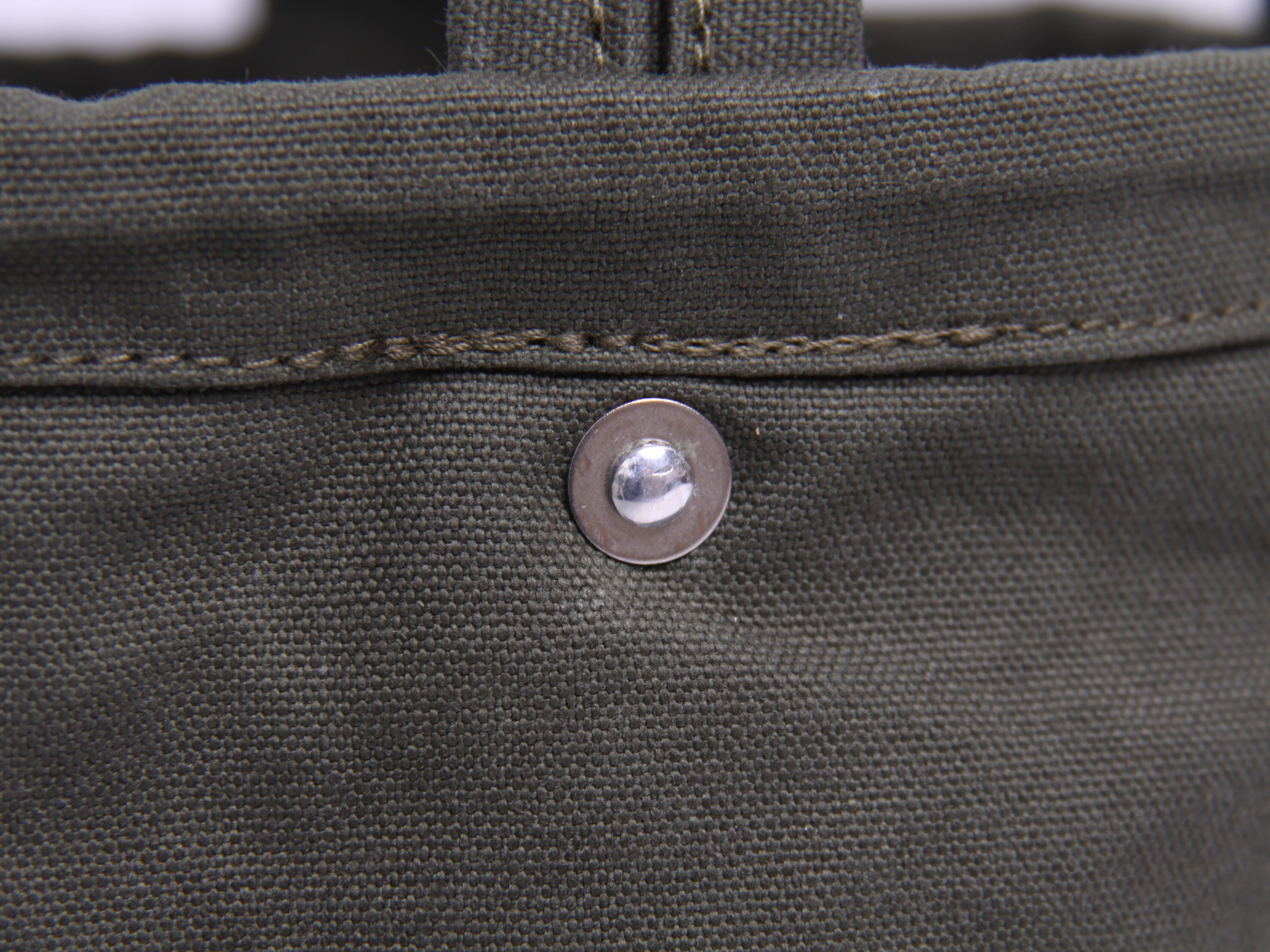 帆布は国内産パラフィン防水10号帆布、ショルダーや持ち手を留め付けるのは銅製(カラーによってはアルミ製)の打ち抜きリベット、カシメや留め具等の金具類は真鍮製、口元の芯には4mm厚の牛ヌメ革を使用。