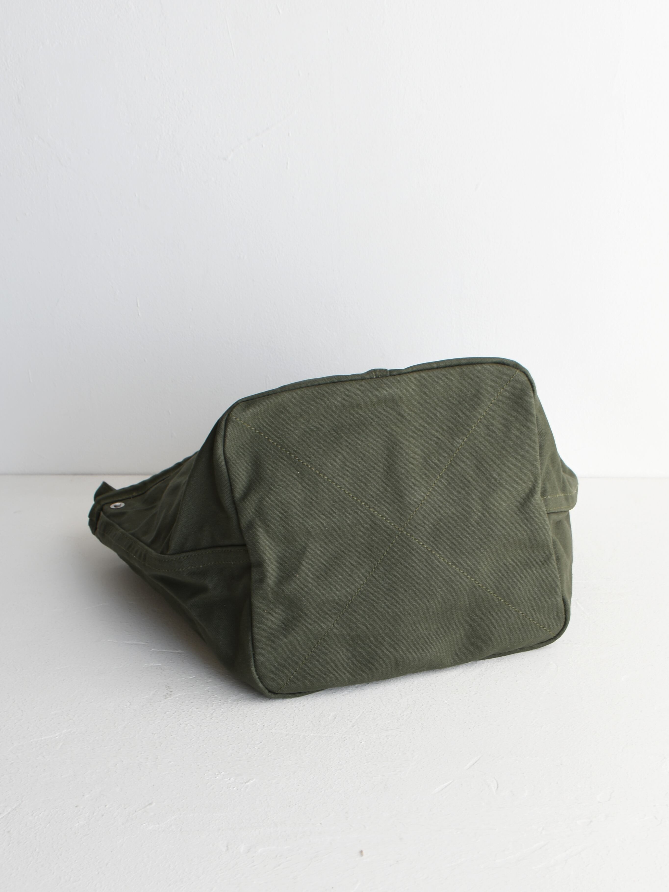 帆布は国内産パラフィン防水10号帆布、ショルダーや持ち手を留め付けるのは銅製(カラーによってはアルミ製)の打ち抜きリベット、カシメや留め具等の金具類は真鍮製、口元の芯には4mm厚の牛ヌメ革を使用。