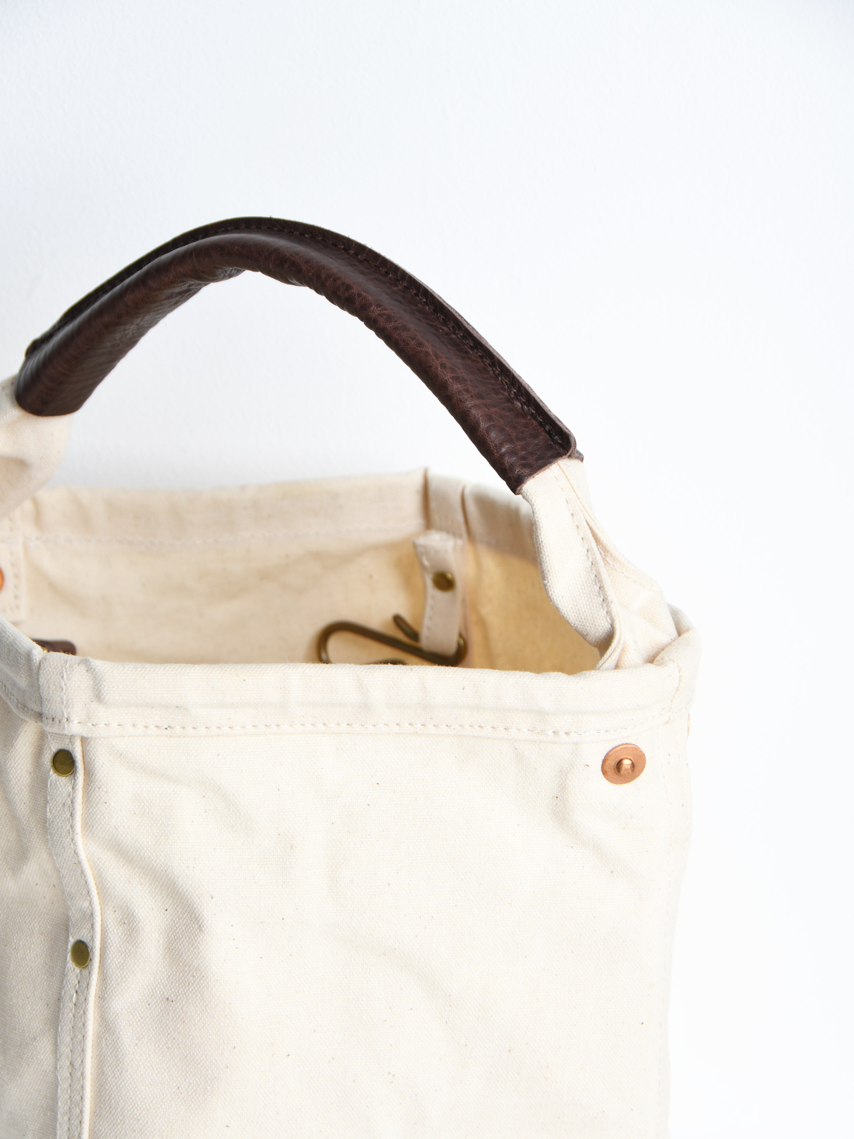 帆布は国内産パラフィン防水10号帆布、ショルダーや持ち手を留め付けるのは銅製(カラーによってはアルミ製)の打ち抜きリベット、カシメや留め具等の金具類は真鍮製、口元の芯には4mm厚の牛ヌメ革を使用。