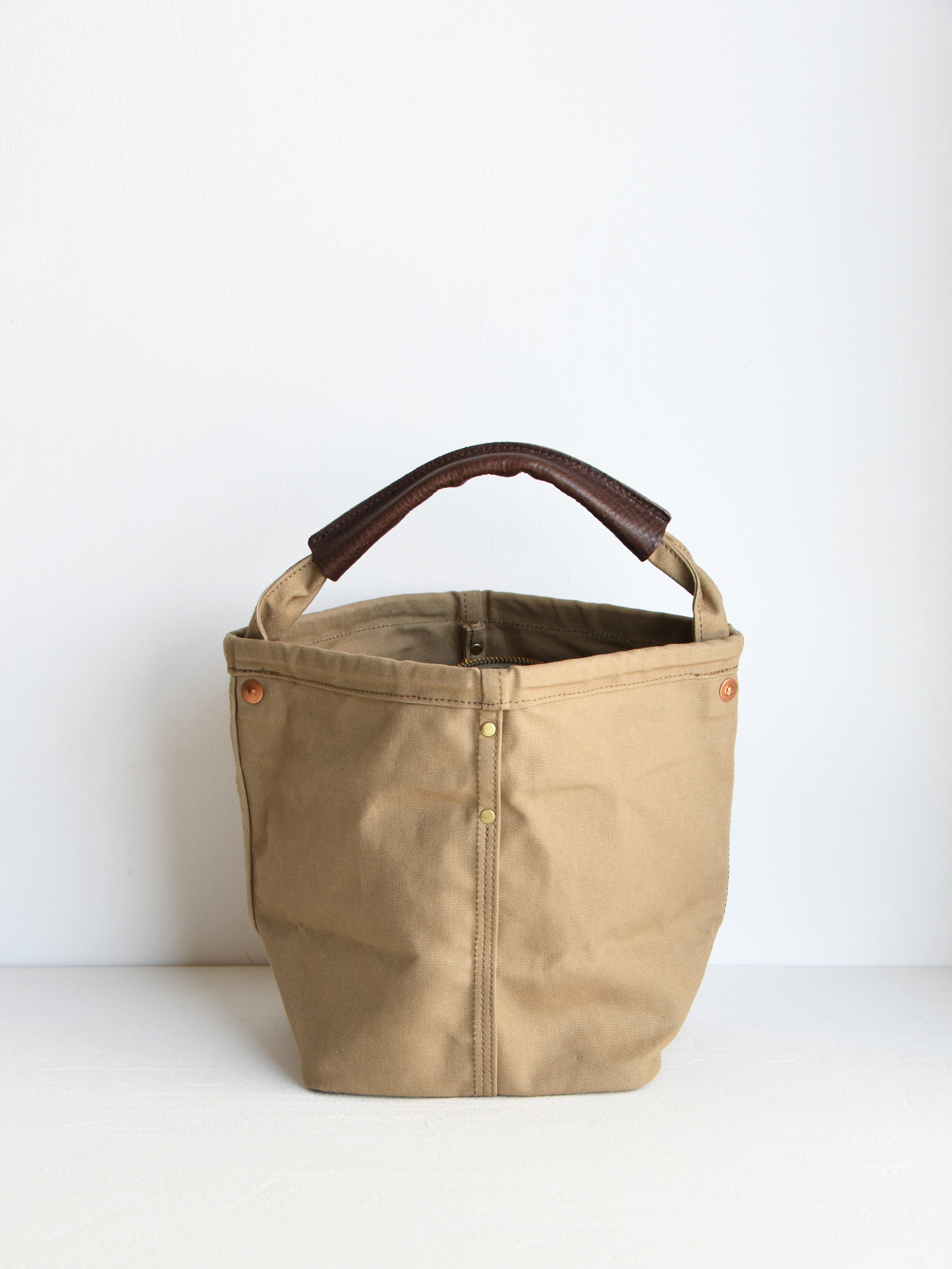 帆布は国内産パラフィン防水10号帆布、ショルダーや持ち手を留め付けるのは銅製(カラーによってはアルミ製)の打ち抜きリベット、カシメや留め具等の金具類は真鍮製、口元の芯には4mm厚の牛ヌメ革を使用。