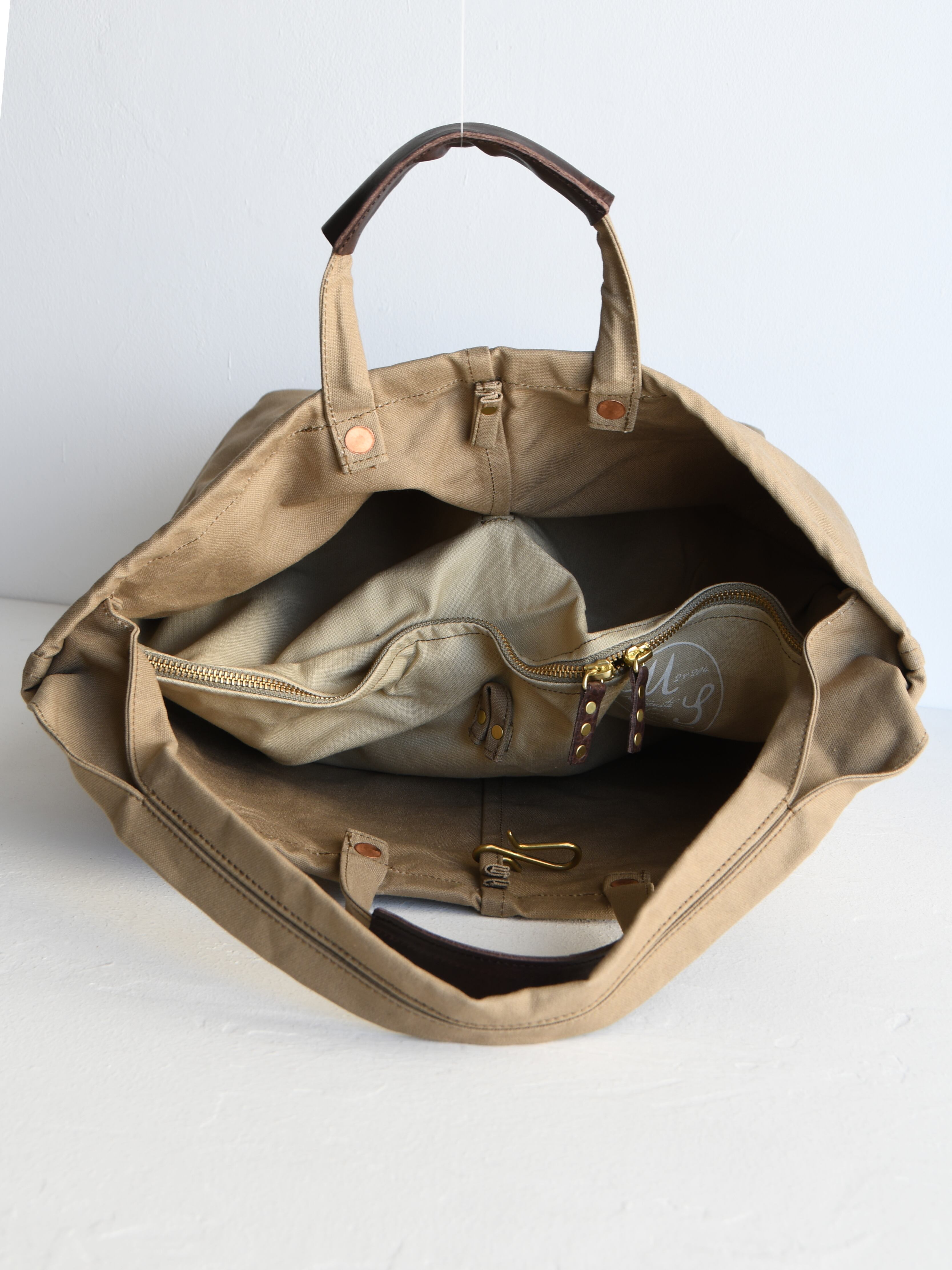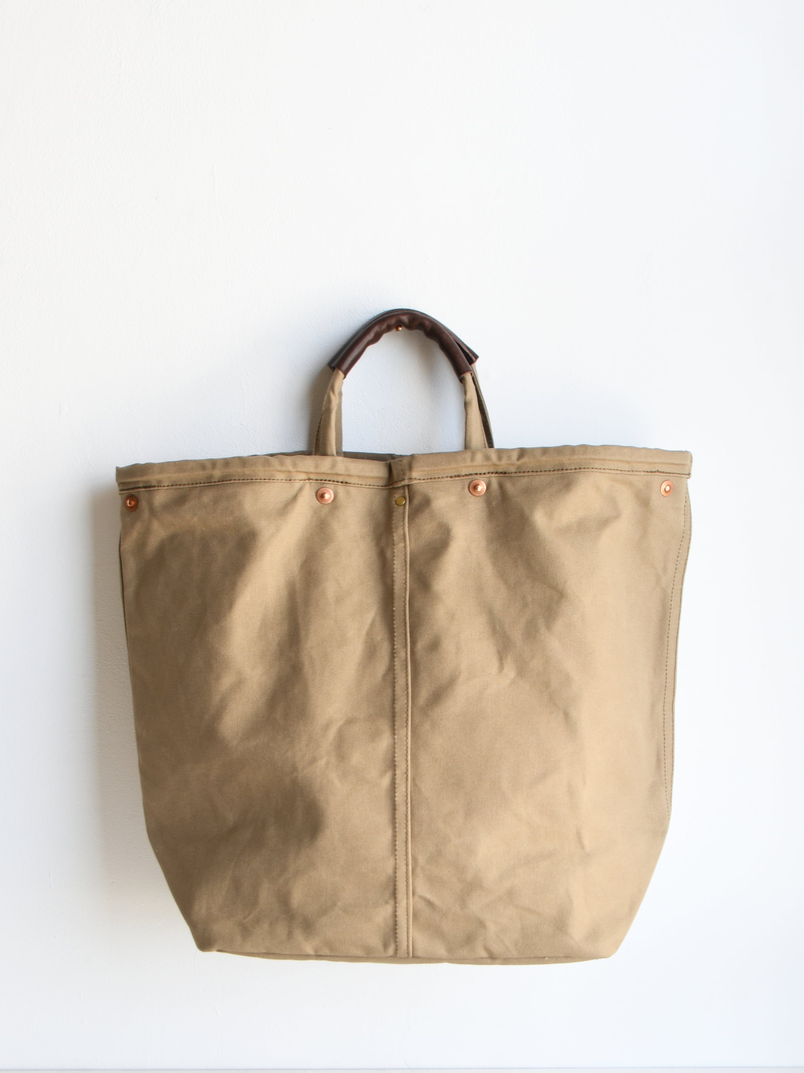 帆布は国内産パラフィン防水10号帆布、ショルダーや持ち手を留め付けるのは銅製(カラーによってはアルミ製)の打ち抜きリベット、カシメや留め具等の金具類は真鍮製、口元の芯には4mm厚の牛ヌメ革を使用。